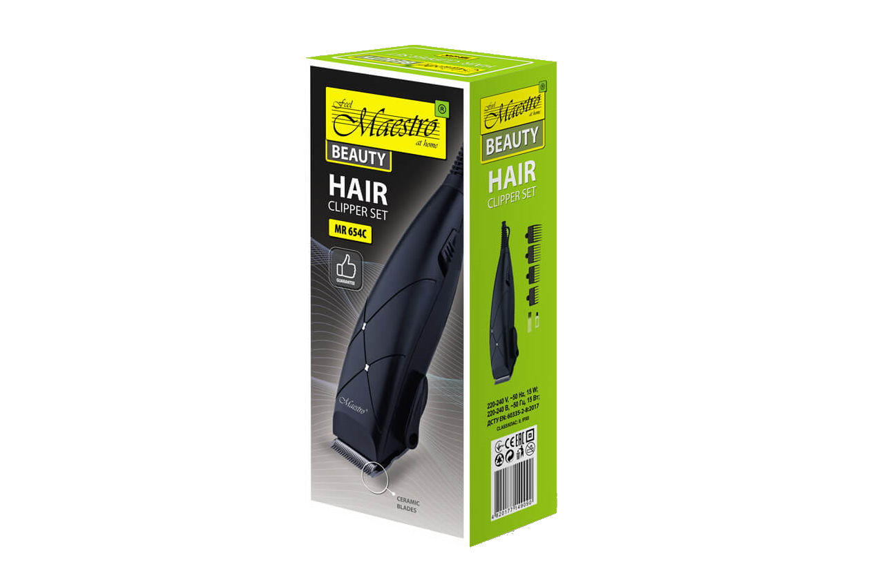 Керамические лезвия. Четыре сменные насадки (3, 6, 9, 12 мм). Щетка для чистки машинки. Емкость с маслом. Сверхтихая работа.