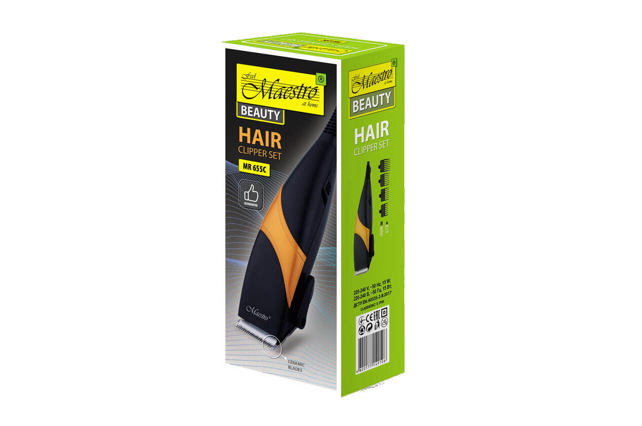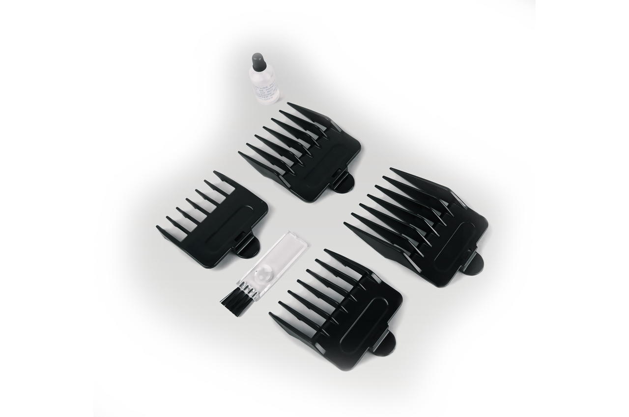 Керамические лезвия. Четыре сменные насадки (3, 6, 9, 12 мм). Щетка для чистки машинки. Емкость с маслом. Сверхтихая работа.