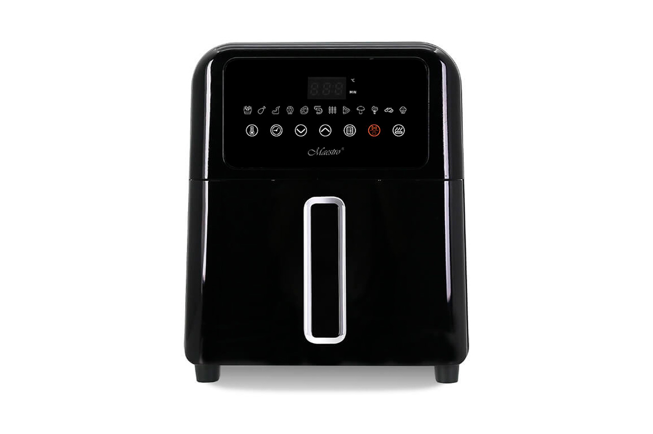 Современная большая аэрофритюрница Maestro MR 757 объёмом 6 литров имеет просто космический дизайн. Крутая модель черного цвета будет хорошо смотреться на ваших кухне. Аэрофритюрница имеет 12 основных программ приготовления. Но прибор не будет сдерживать вашу фантазию и поможет воплотить в жизнь все ролики с рецептами из ютуб. Потому что здесь есть ручная регулировка времени и температуры.