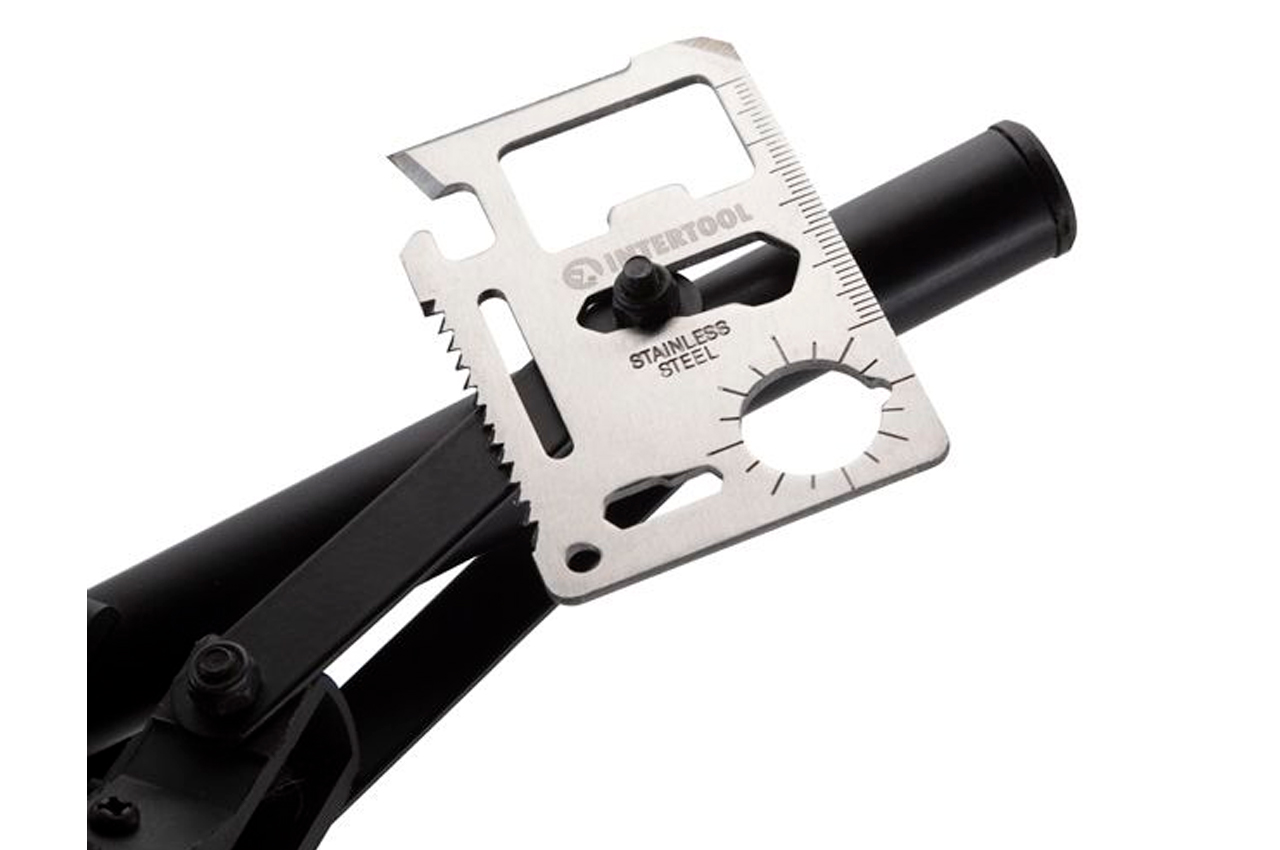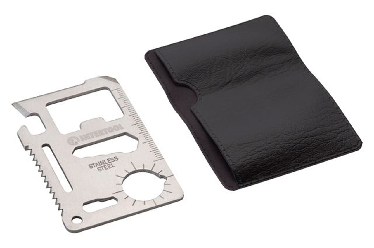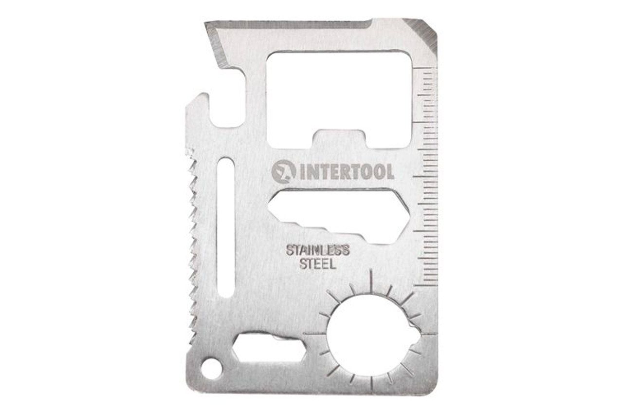 Мультитул Intertool HT-0589 - это многофункциональный гаджет, который содержит в себе 11 полезных инструментов для любых задач, которые могут возникнуть в непредвиденных ситуациях и в полевых условиях. Выполнен в форме банковской карты, легко помещается в потайной карман, кошелек или в рюкзак. Инструмент создан специально для того, чтобы помочь выжить в экстренной ситуации, вне зависимости от условий местности. С помощью такой карточки вы сможете закрутить выпавший винт или гайку, нарезать пищу, отпилить ветки для костра, отрезать стропу или веревку, открыть банку или бутылку, сориентироваться по карте или же использовать линейку и пр. Функционал 1 – Открывала для банок 2 – Нож с острием 3 - Плоская отвертка 4 – Линейка 4 см 5 – Открывалка для бутылок 6 – Гаечный ключ на 6, 7, 8, 10 мм 7 – Ключ-бабочка 8 – Пила 9 – Транспортир/картографический указатель 10 - Гаечный ключ на 4, 5 мм 11 – Отверстие для подвеса или изгибания проволоки