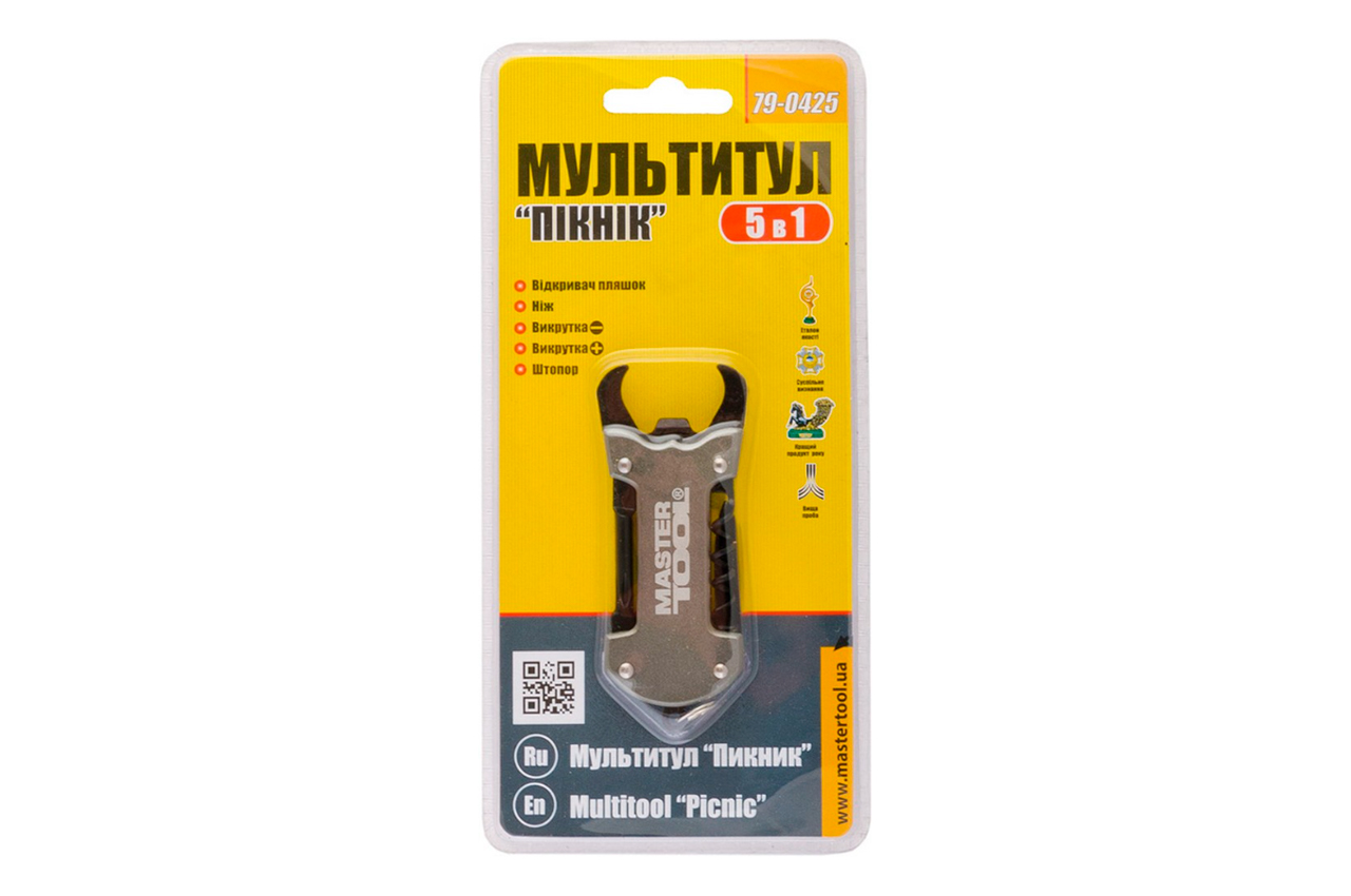 Мультитул "Пикник" 5-в-1 от компании Mastertool является незаменимы инструментом для любителей шашлыков, пикников, рыбалки и других загородных видов отдыха. Арсенал сего инструмента невелик но очень полезен: открывачка, нож, штопор, шлицевая и крестовая отвертки.