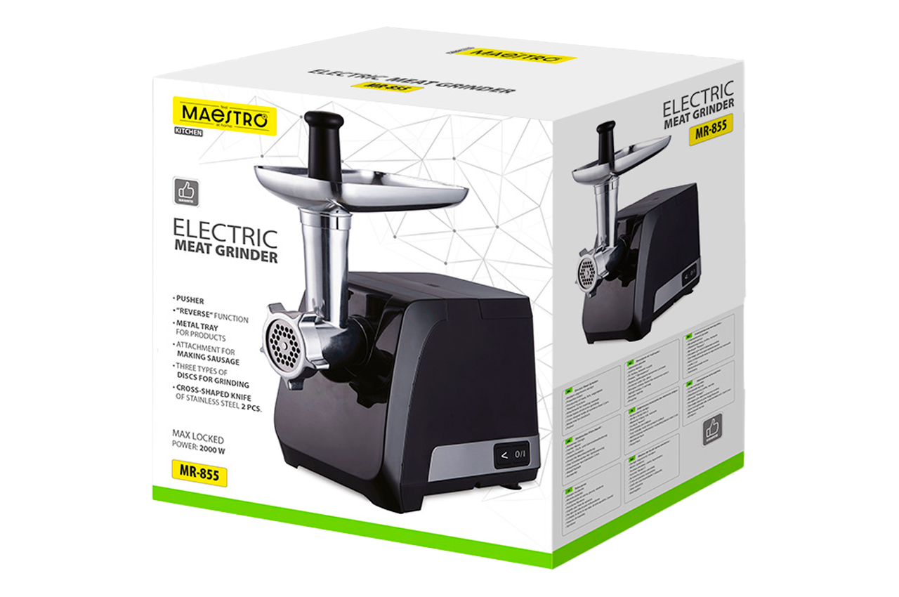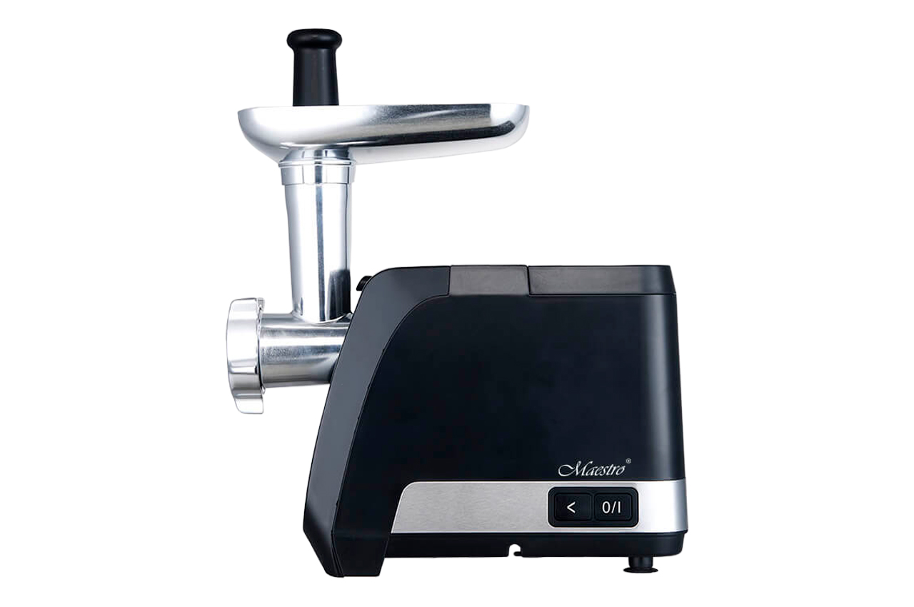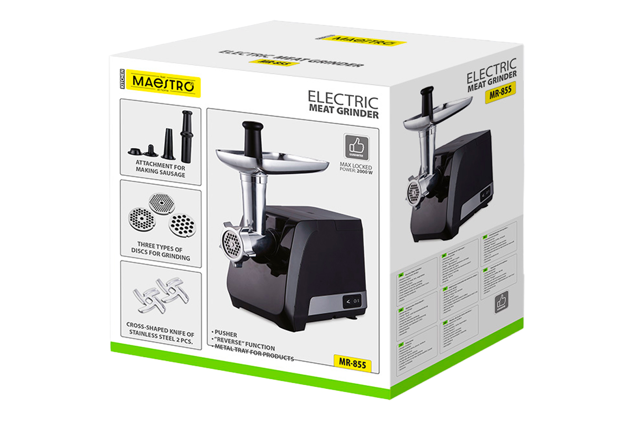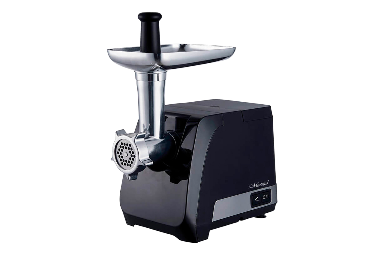 Электрическая мясорубка Maestro MR-855 мощностью 2000 Вт выполнена в черном цвете. Она оснащена прочным металлическим лезвием и несколькими насадками для различных типов измельчения. Устройство имеет функцию реверса, что предотвращает его забивание, и удобный контейнер для сбора мяса. Также предусмотрен съемный лоток и антискользящие ножки для стабильности в процессе работы.