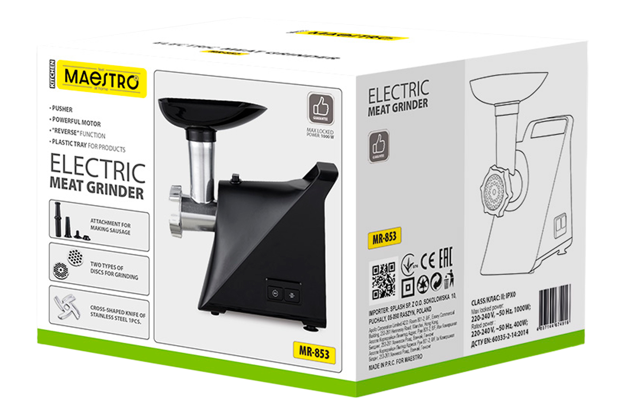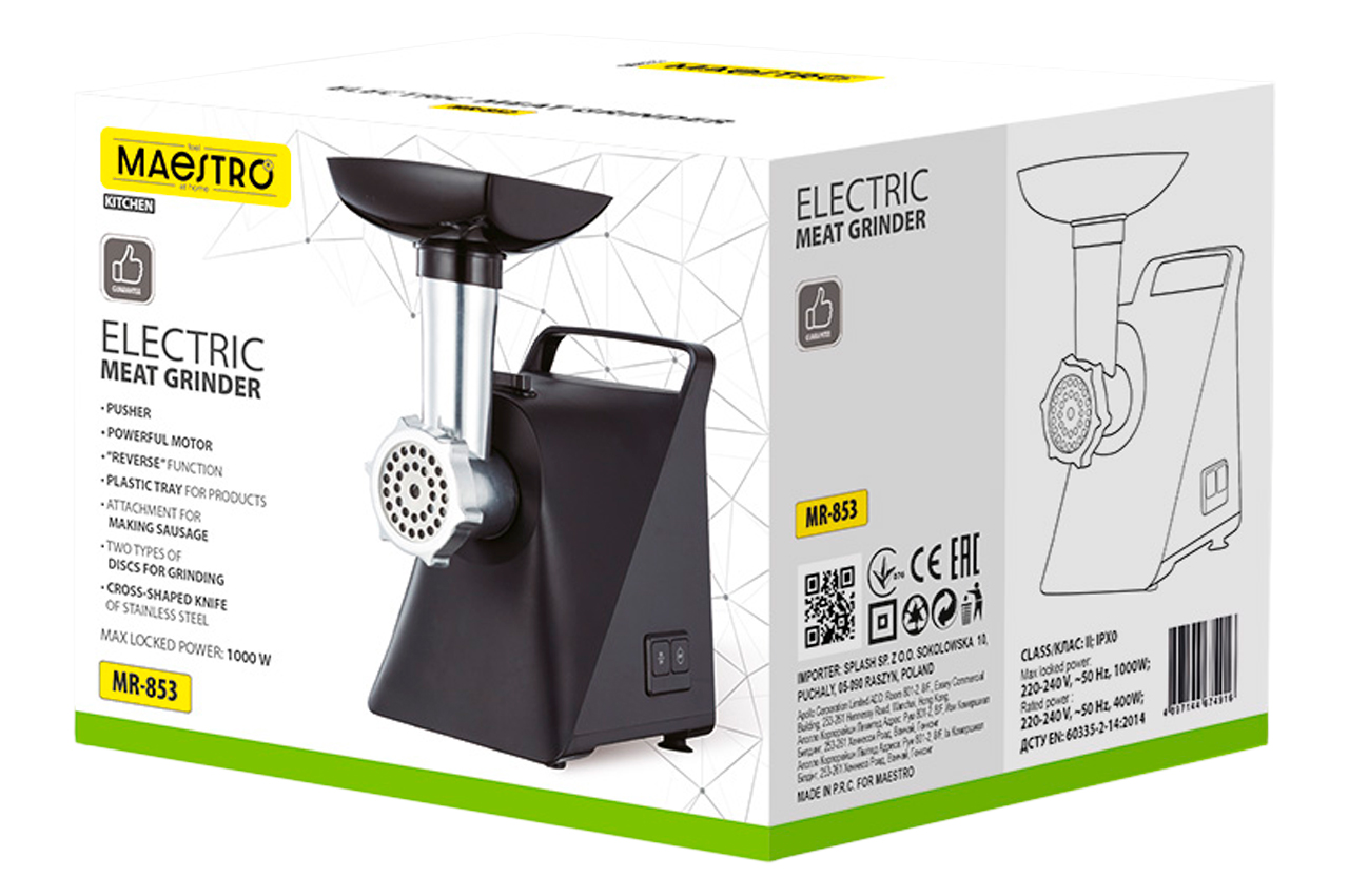 Мясорубка Maestro MR-853 имеет современный и эргономичный дизайн, а компактная ручка из пластика в верхней части корпуса облегчает процесс транспортировки. Корпус прибора изготовлен из пластика, а лоток и насадки из высококачественной стали. Высокая мощность прибора делает его универсальным, так как в нем можно перемалывать мясо разных видов. Мясорубка имеет функцию реверса, что упрощает процесс освобождения застрявших ножей. Корпус прибора окрашен в белый и черный цвета, которые гармонично дополняют друг друга. Рабочая зона изготовлена из черного пластика, что делает изделие менее марким. Удобный регулятор переключения режимов позволяет с легкостью подбирать соответствующую скорость в зависимости от разновидности перемалываемых продуктов.