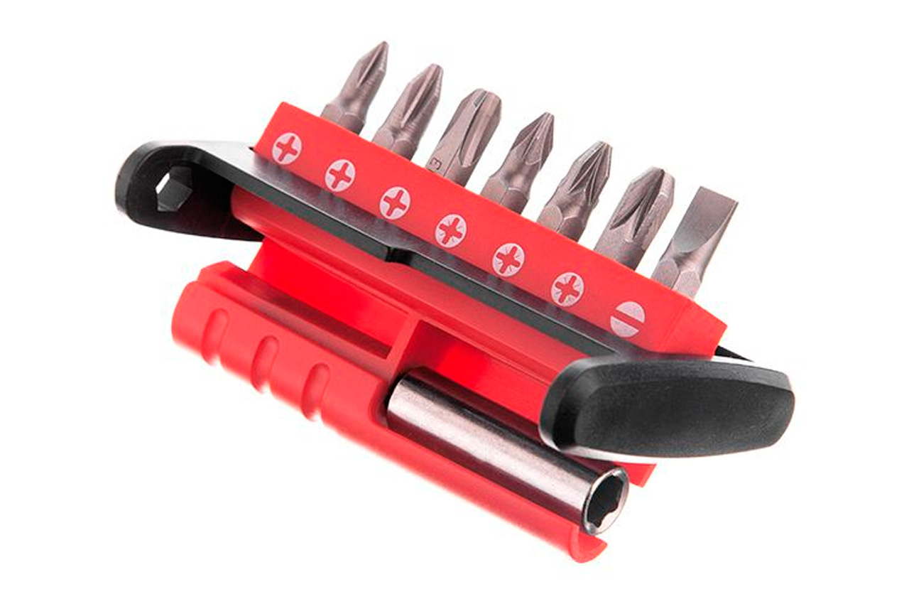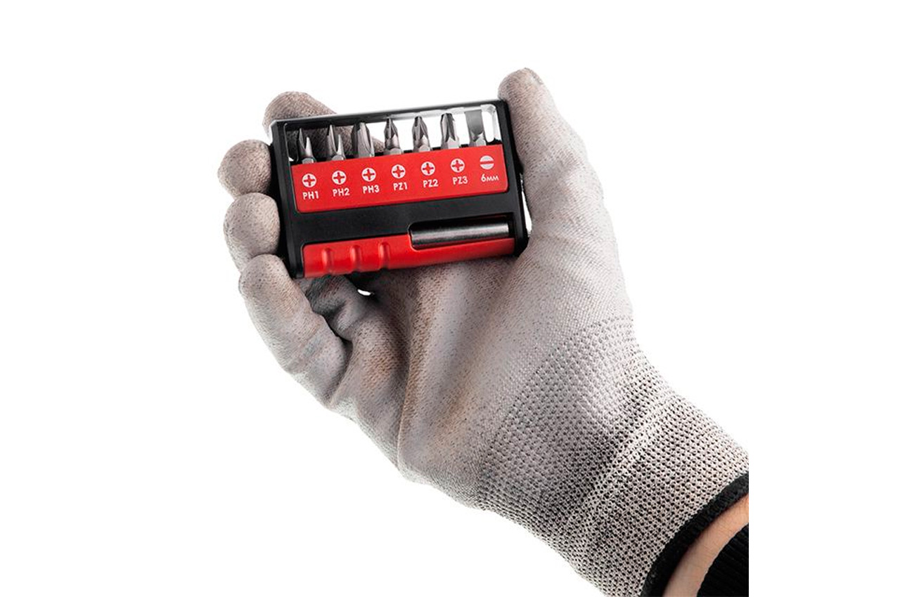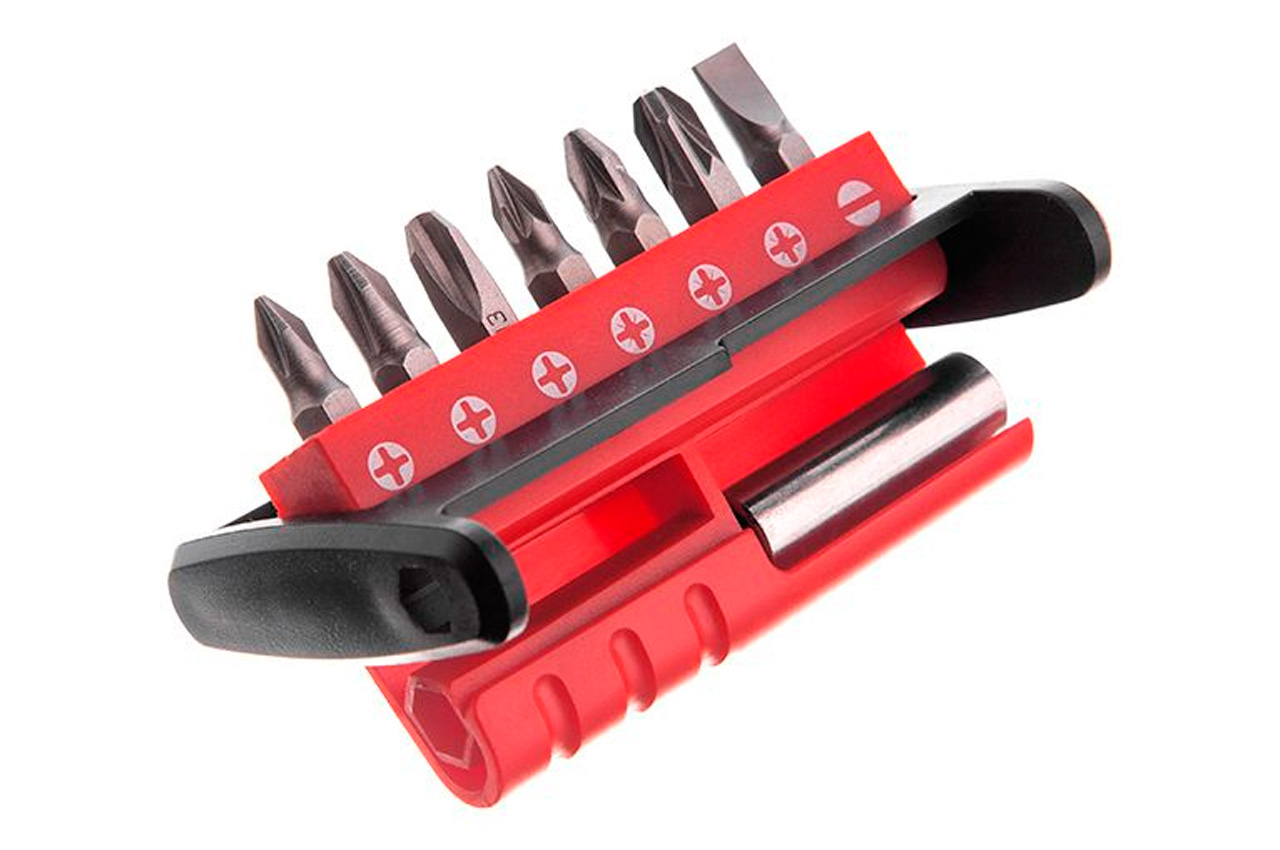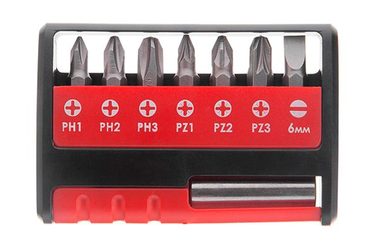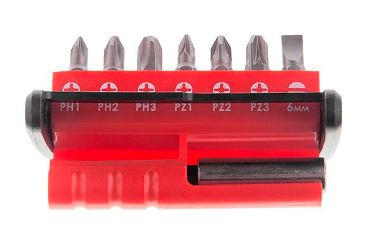 Набор бит имеет удобную упаковку, ее можно положить в карман, а биты останутся в полной сохранности и не потеряются. Количество единиц в упаковке 7, где одна из единиц – магнитный держатель 14". Типы шлицов биты: SL: 6 мм; PH1, PH2, PH3; PZ1; PZ2; PZ3.