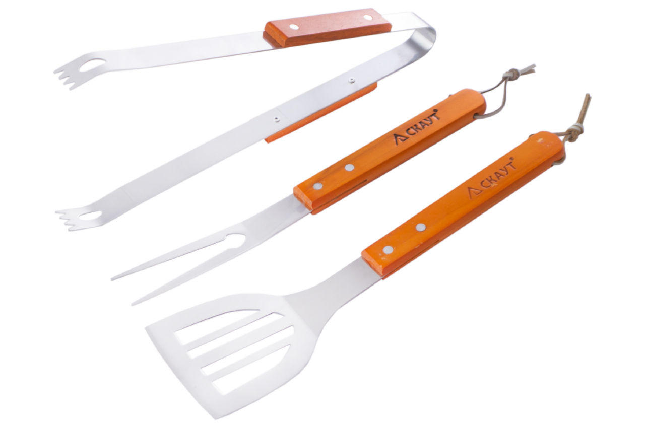 Набор для гриля Скаут - лопатка x вилка x щипцы (3 ед.) Специальный набор для мангала, гриля и барбекю отлично подойдет для приготовления пищи на природе, в кафе и домашнем обиходе. Набор состоит из лопатки, щипчиков и вилки. Такими инструментами удобно раскалывать, переворачивать, снимать с горячей сковороды пищу, а также благодаря длинным деревянным ручкам. Приборы выполнены из прочной нержавеющей стали, а держатели на ручках изготовлены из дерева.