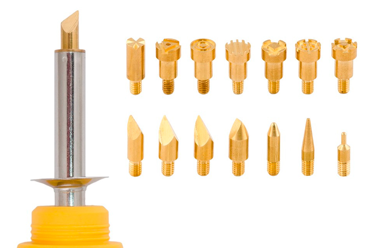 Выжигание по дереву, тиснение, работы с кожей; нихромовый нагревательный элемент; ручка из термостойкого пластика и TPR покрытием; 14 переменных латунных насадок; рабочая температура до 550°C; металлическая подставка