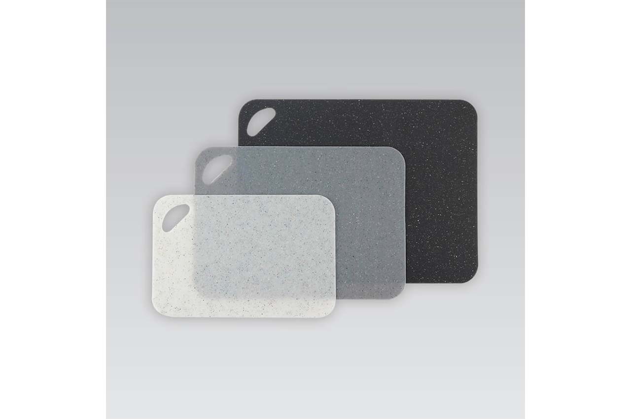 Набор из 3х разделочных досок разных размеров. Отлично подойдет для всех случаев жизни, резки хлеба, мяса, зелени, овощей, фруктов, разделки рыбы. В состав входят три тонких пластиковых доски: маленькая (белая) размером 29х19х0,15 см, средняя (серая) размером 33,5х24х0,15 см, большая (черная) размером 38х28х0,15 см.