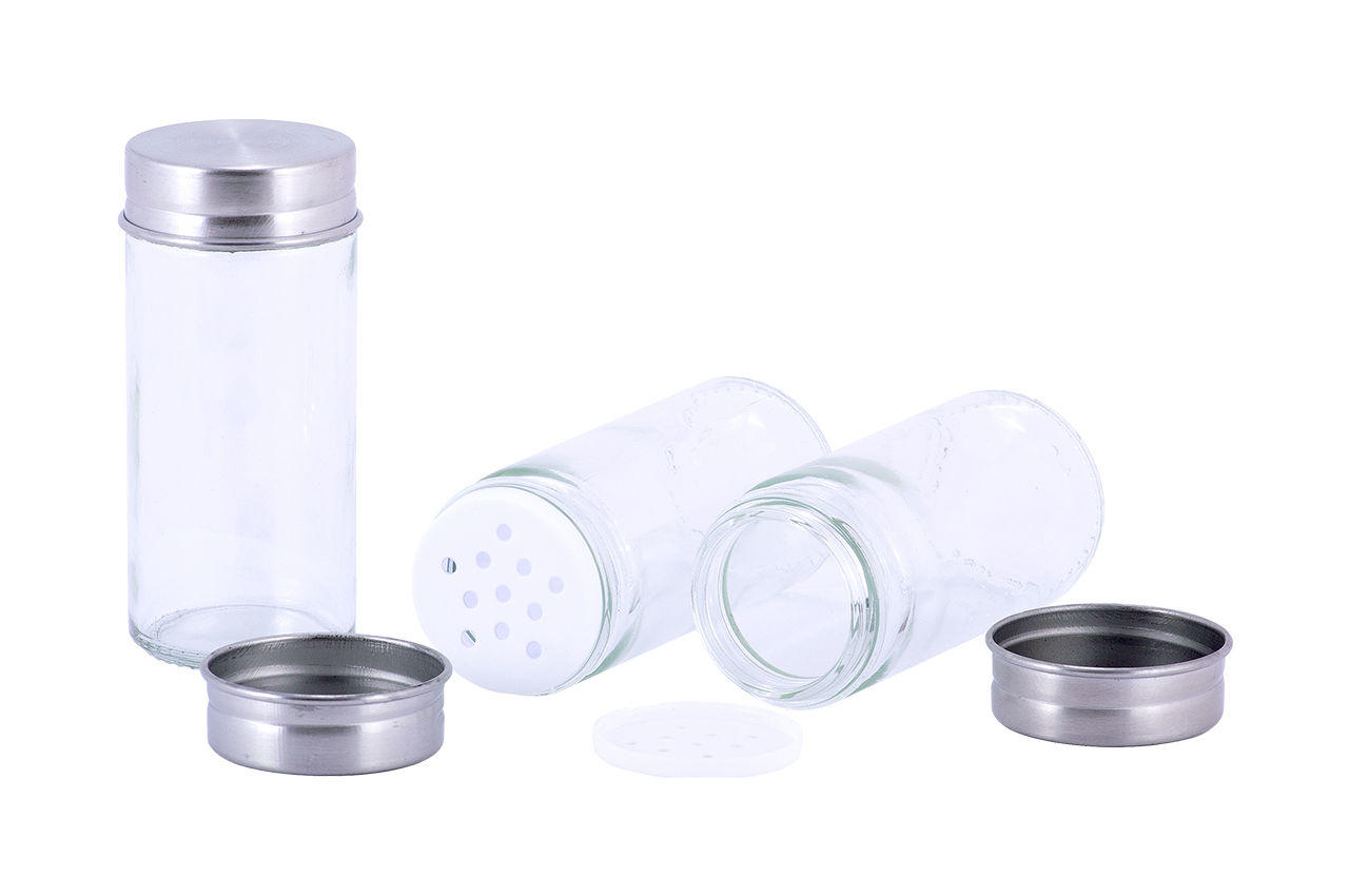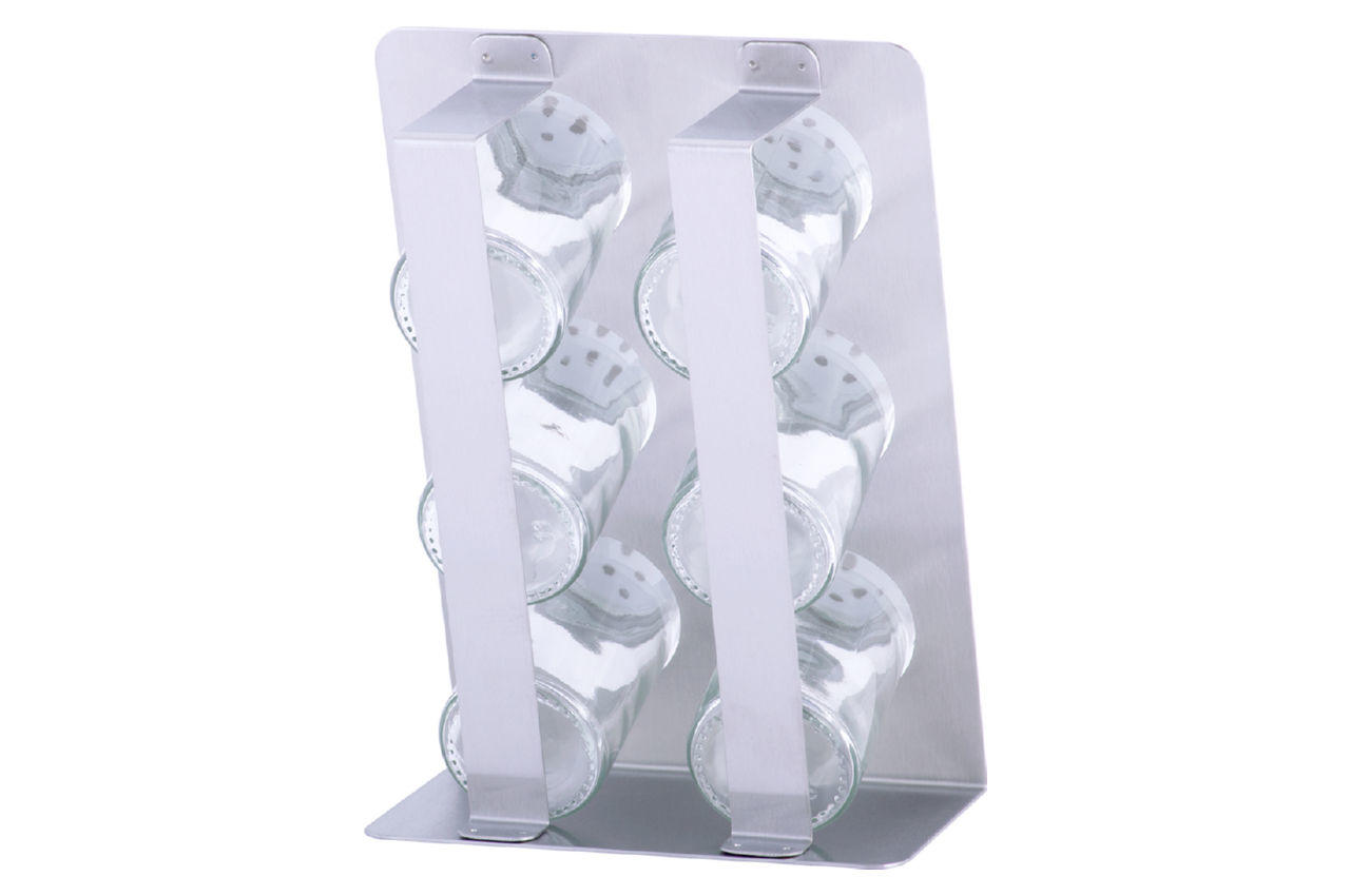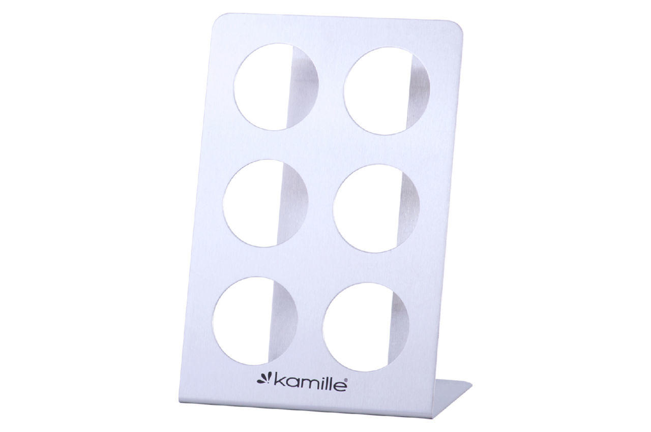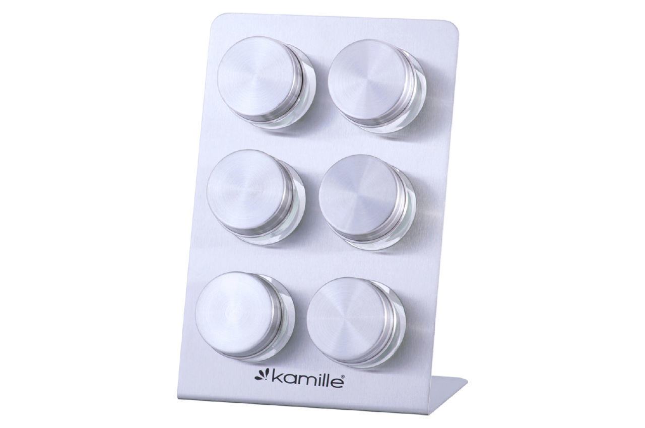 Набор емкостей для специй Kamille - состоит из 6 емкостей для специй объемом 100 мл на стойке, баночки изготовлены из стекла с завинчивающейся стальной крышкой. Удобно размещаются в два ряда (по 3 штуки в ряду) на стальной подставке.