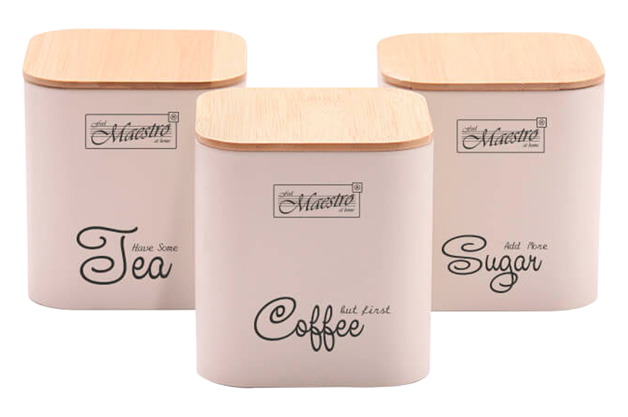 Набор Maestro MR-1775-3S-BLACK состоит из трех емкостей: — емкость для сахара — емкость для кофе — емкость для чая Металлический корпус с пудровым покрытием прекрасно сочетается с бамбуковой крышкой.
