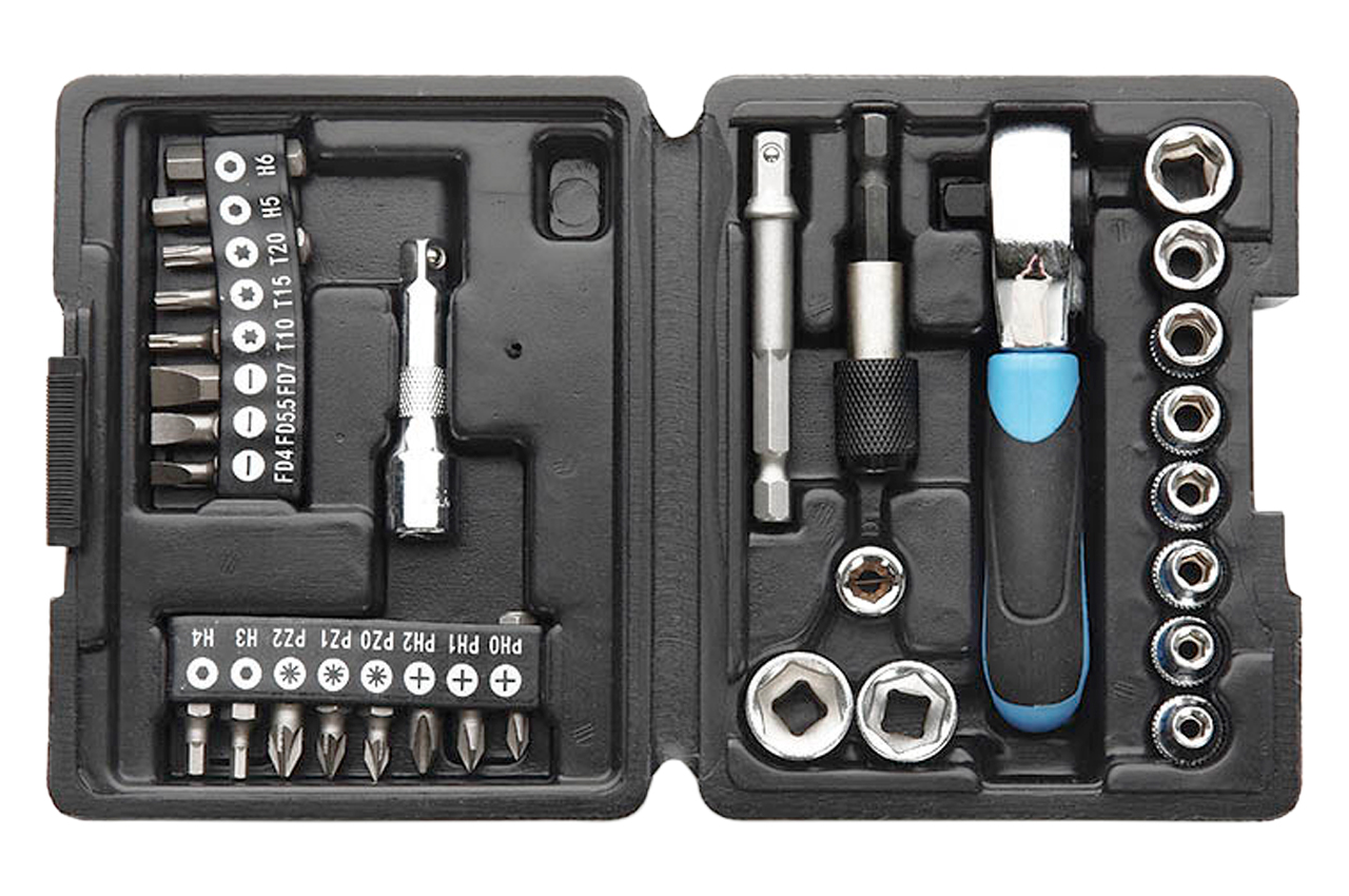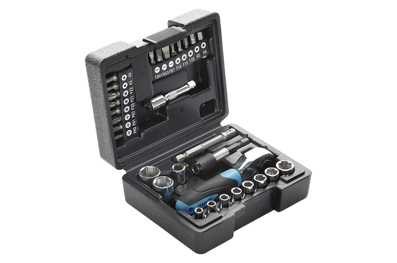 Набор инструмента Apro – это профессиональный комплект инструментов в противоударном кейсе, предназначенный для ремонта авто, электротехники и скрепления различных конструкций. Комплект насчитывает 31 элемент среди которого: торцевые насадки – 4, 4.5, 5, 5.5, 6, 7, 8, 10, 12, 13 мм, удлинители – 50 и 64 мм усиленный, биты H3, 4, 5, 6; FD4, 5.5, 7; PZ0, 1, 2; PH0, 1, 2; TX10, 15, 20, ключ трещотка на 72 зуба, битодержатель 1/4" 1 шт. Изготовлены из качественного материала, хромомолибденовой стали. Кейс из прочного пластика с надежной застежкой.