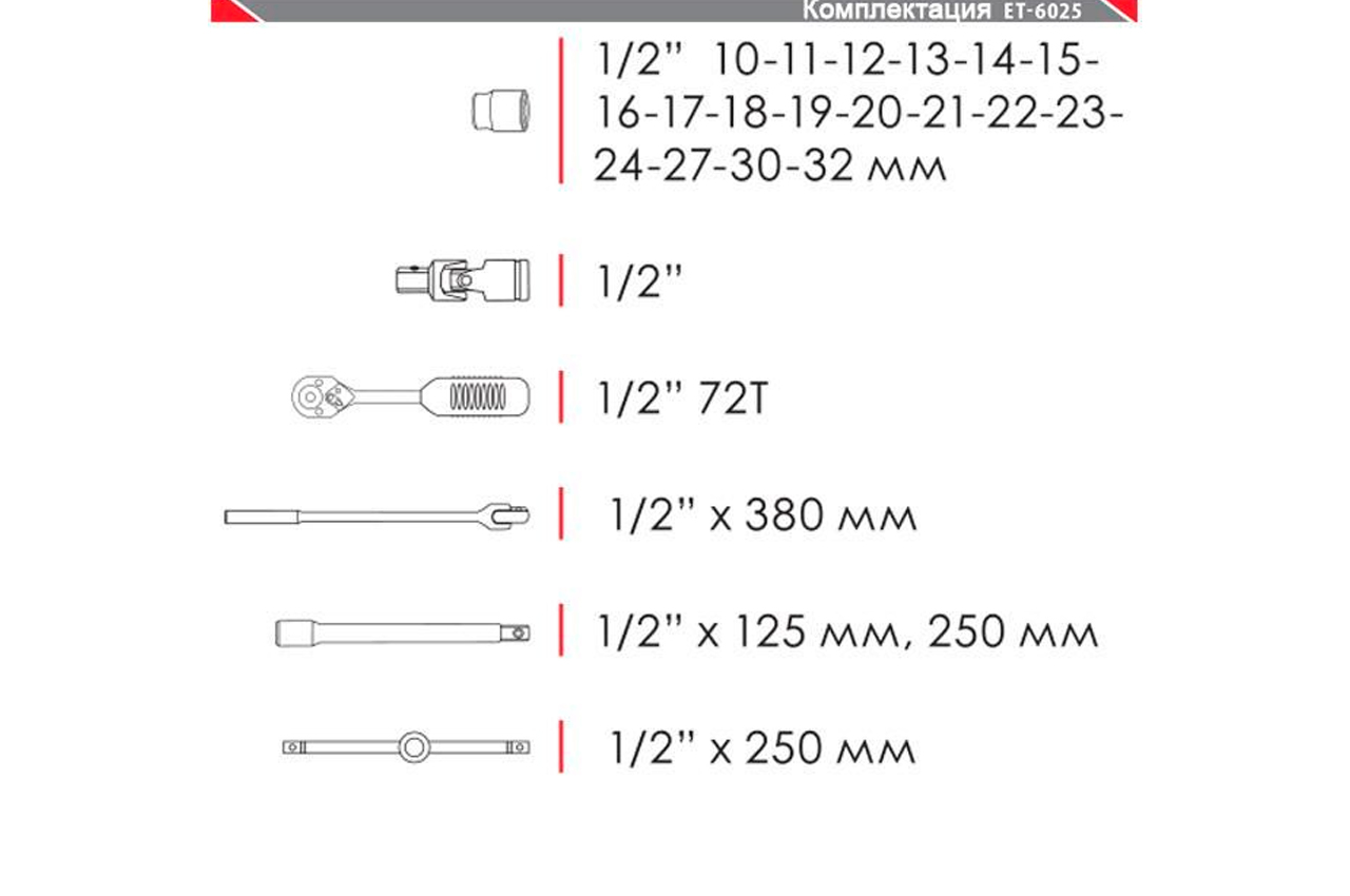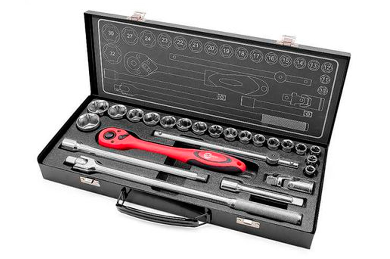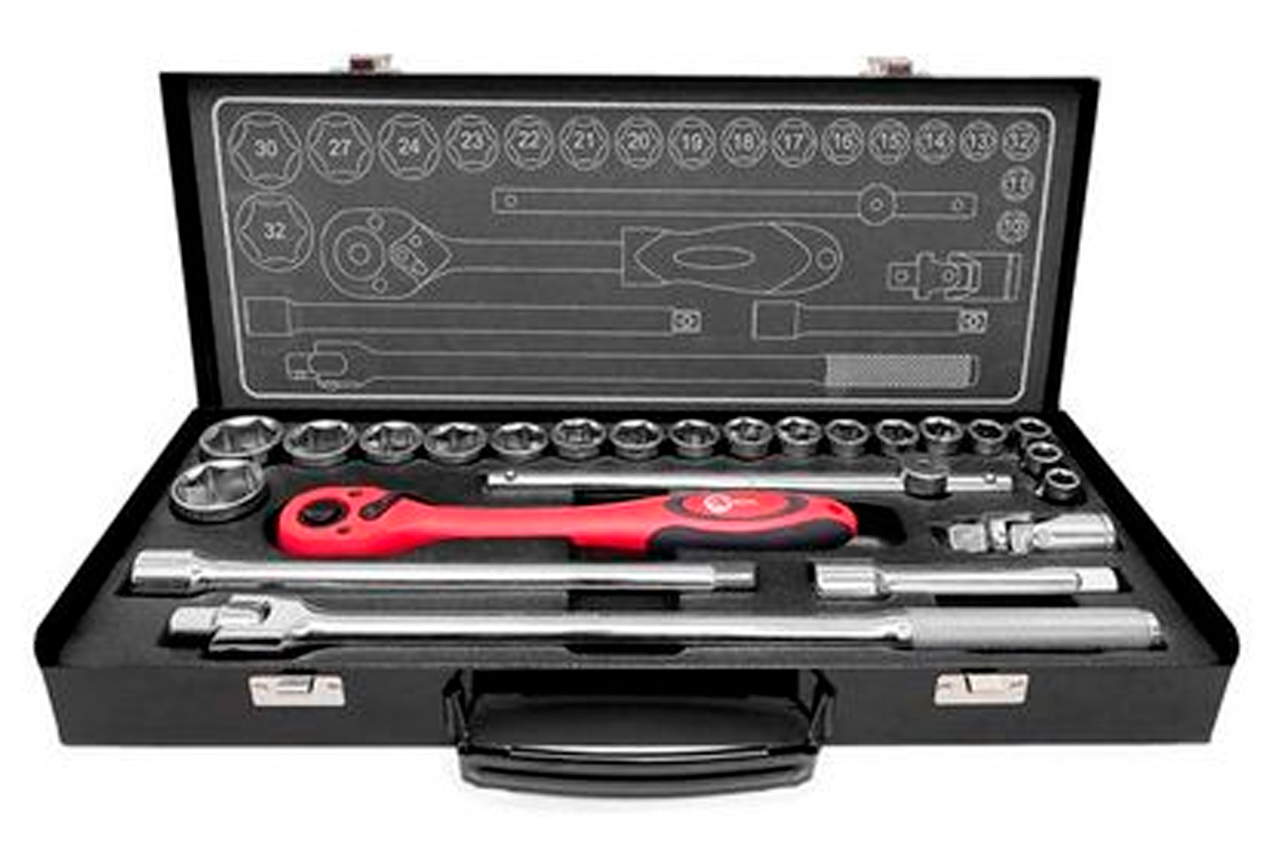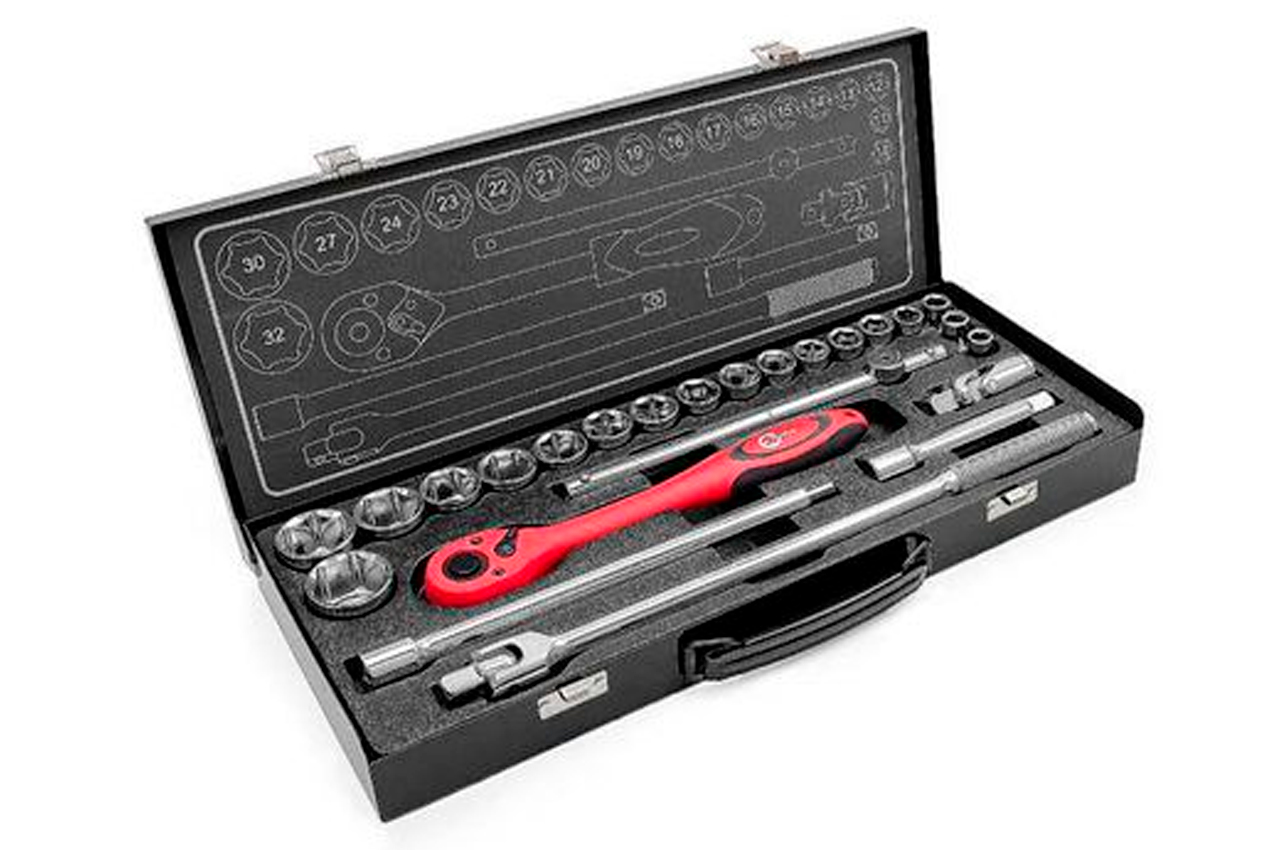Профессиональный набор инструментов состоит из 25 единиц с квадратом 1/2". 18 торцевых головок диаметром от 10 до 32 мм. Изготовленные из прочной хром-ванадиевой стали. Отдельного внимания заслуживает рукоятка с храповым механизмом (трещотка) на 72 зубца с возможностью сброса и фиксации торцевых головок, покрыта защитным слоем из полипропилена, полностью предотвращающим возможность появления коррозии. Набор укомплектован в надежный металлический кейс. Габаритные размеры: 448х195х50 мм; Квадрат: 1/2"; Количество единиц в наборе: 25 ед.; Материал чемодана: металл