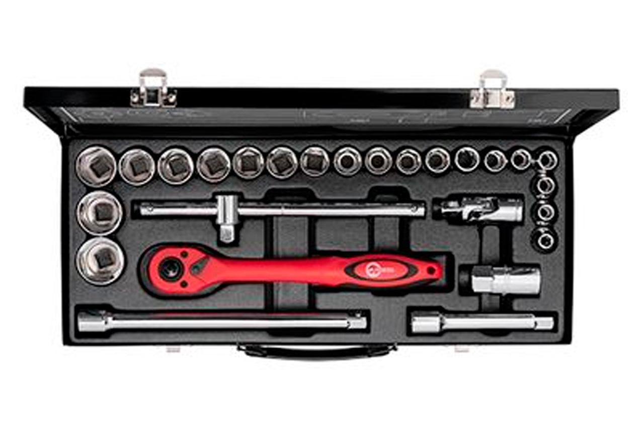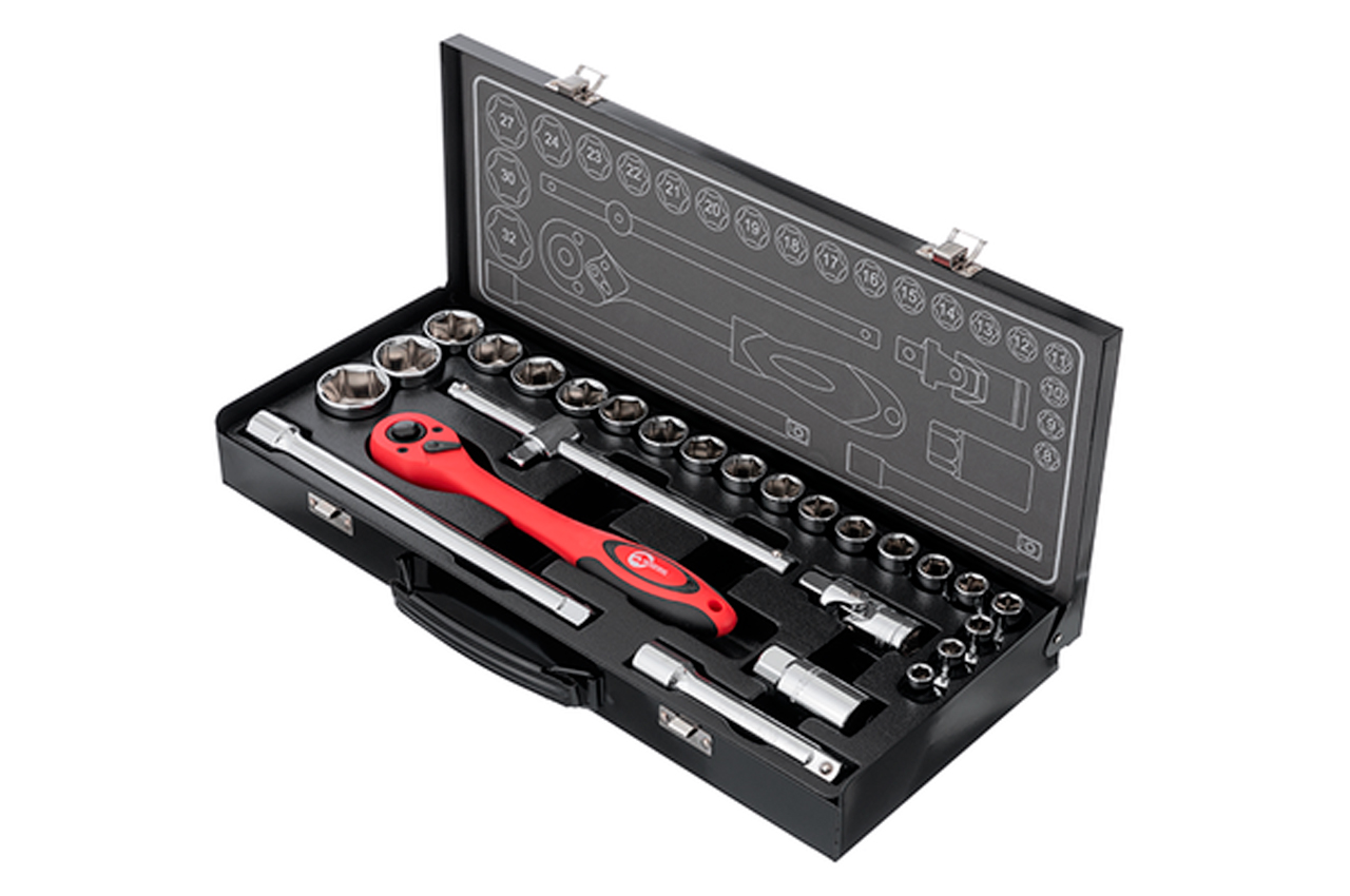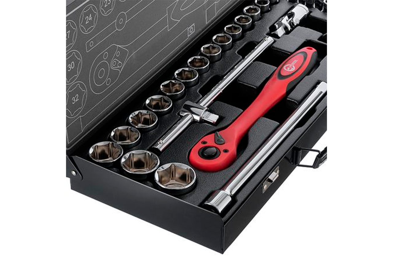 Набор инструментов включает в себя 26 единиц с квадратом 1/2". Набор размещается в удобном металлическом кейсе. Используемый в наборе размер квадрата - 1/2". Набор включает в себя 20 торцевых головок диаметром от 8 до 32 мм, вороток с плавающей головкой, карданчик, свечную головку, два переходника и трещотку. Габаритные размеры: 445х185х50 мм; Квадрат: 1/2"; Количество единиц в наборе: 26 ед.; Материал чемодана: металл