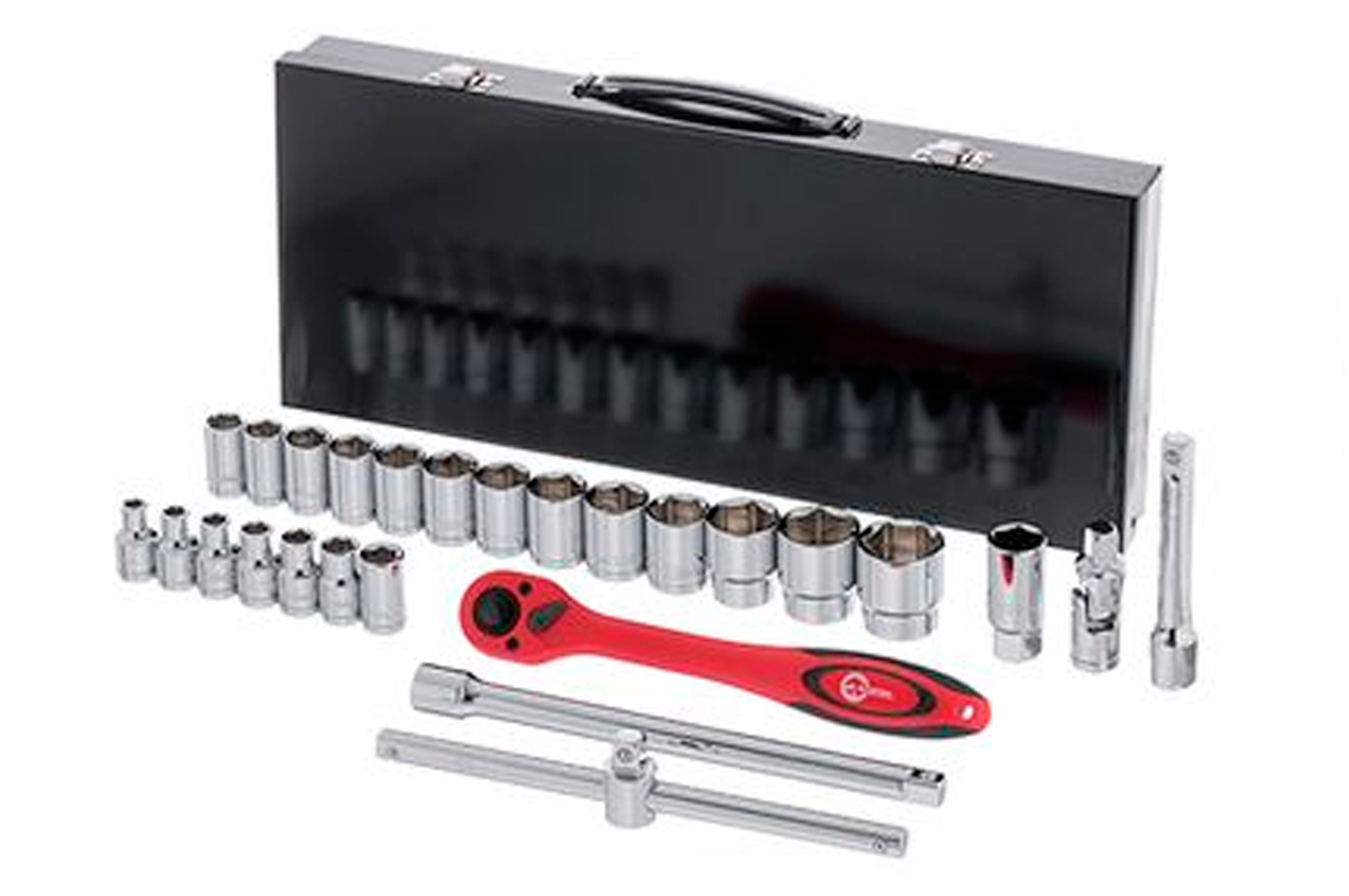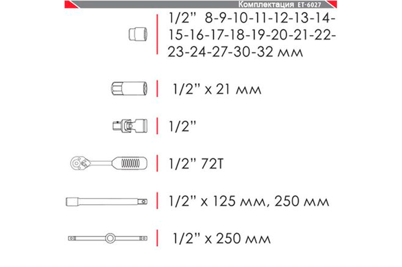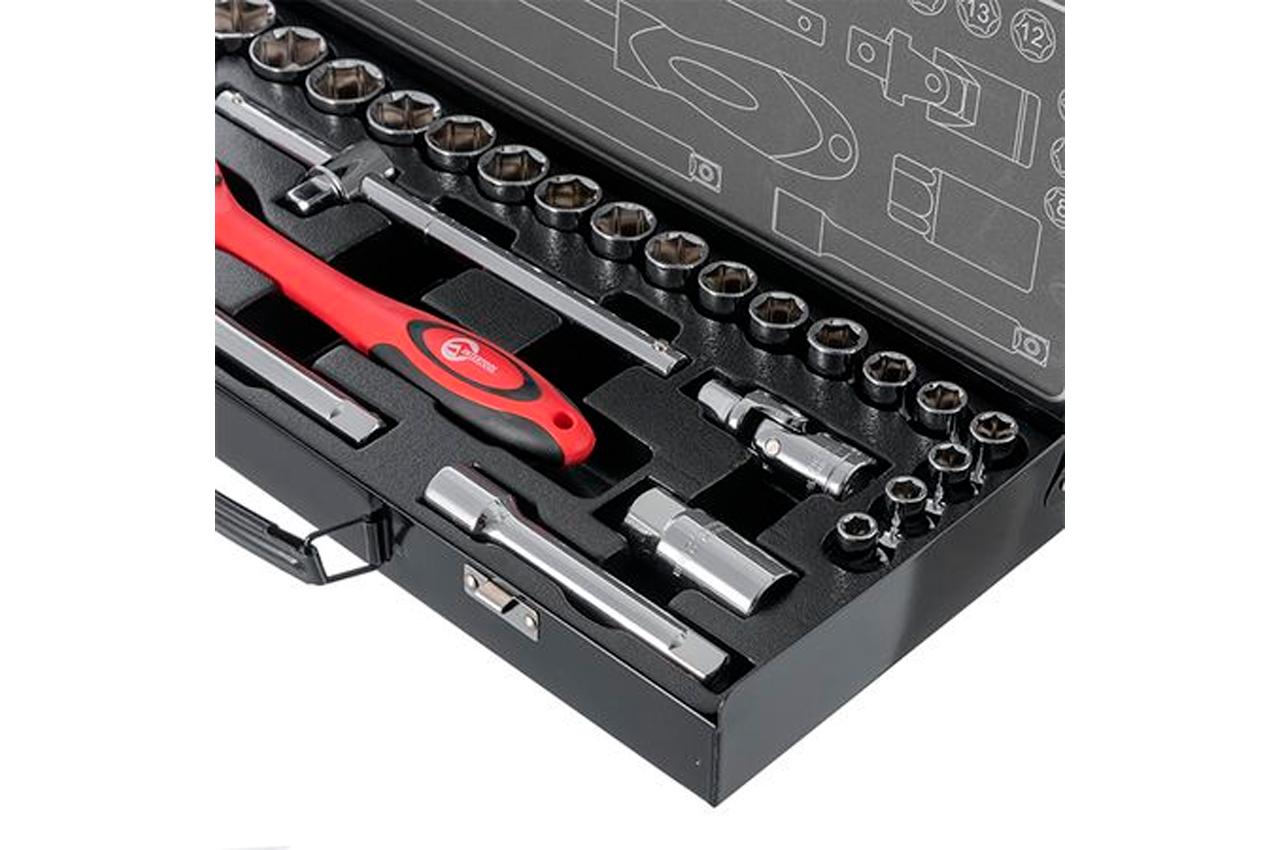 Набор инструментов включает в себя 26 единиц с квадратом 1/2". Набор размещается в удобном металлическом кейсе. Используемый в наборе размер квадрата - 1/2". Набор включает в себя 20 торцевых головок диаметром от 8 до 32 мм, вороток с плавающей головкой, карданчик, свечную головку, два переходника и трещотку. Габаритные размеры: 445х185х50 мм; Квадрат: 1/2"; Количество единиц в наборе: 26 ед.; Материал чемодана: металл