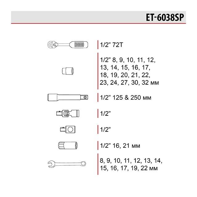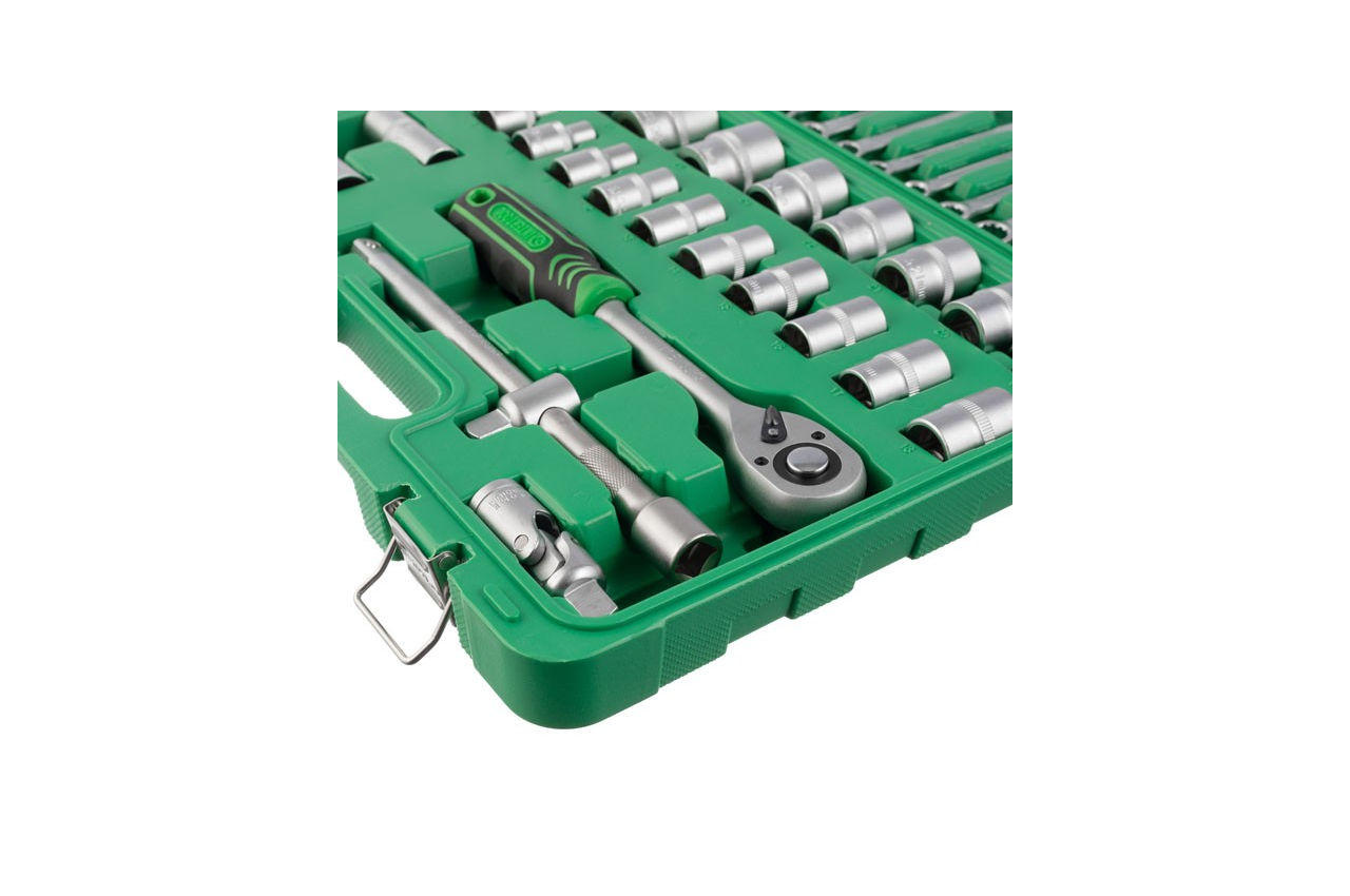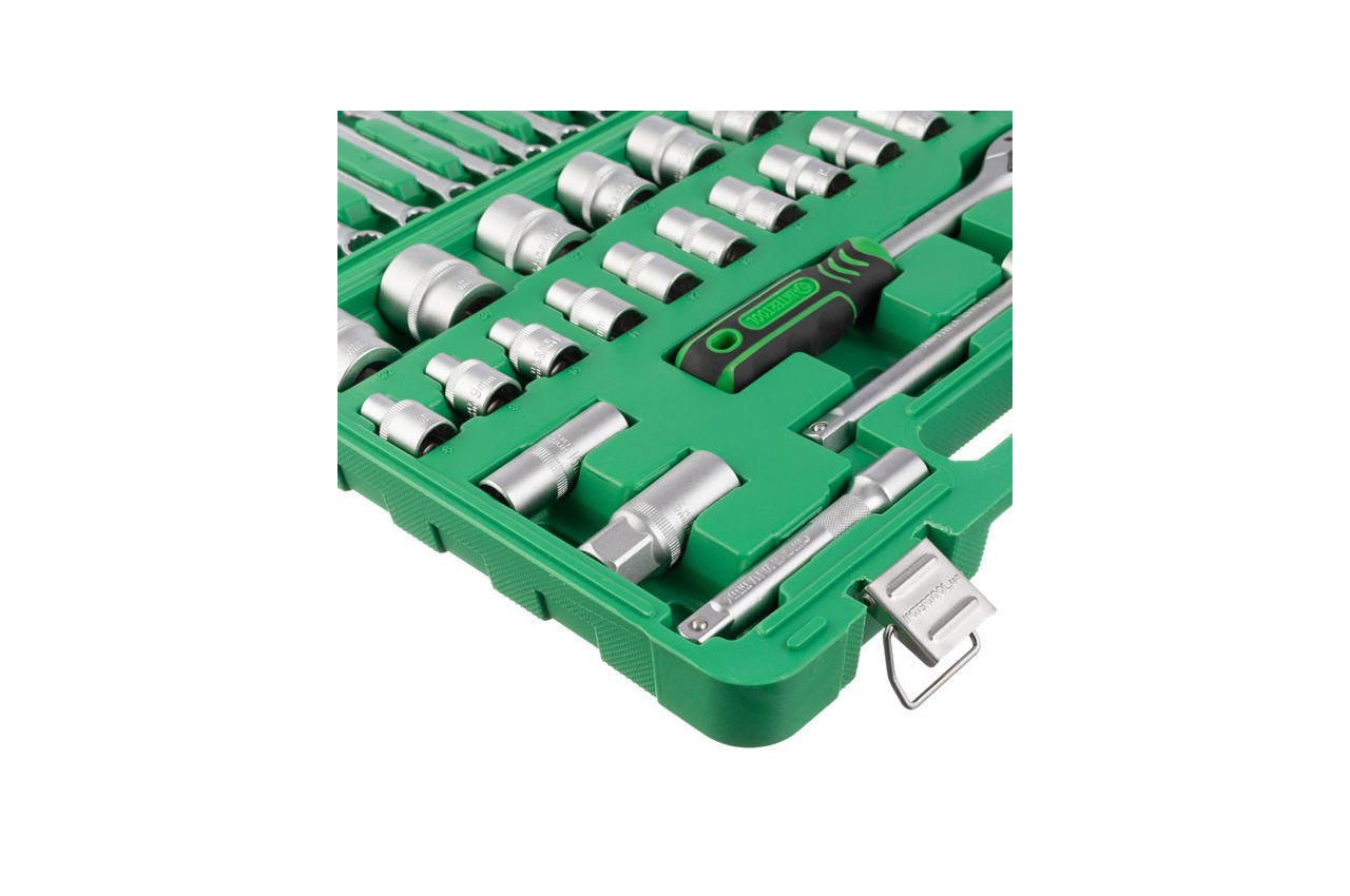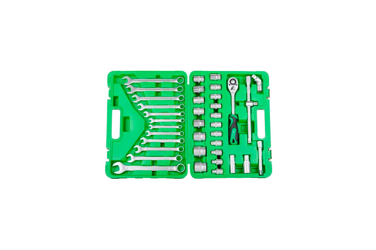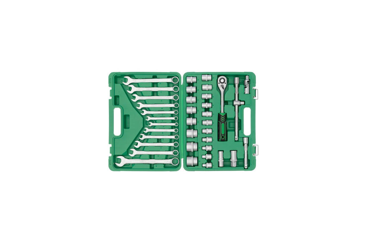 Набор состоит из 37 единиц инструмента и кейса. Подойдет как для мастерской, так и для повседневных бытовых задач на откручивание и закручивание крепежей. В комплекте поставляется трещоточная рукоятка с посадочным квадратом 1/2" и храповым механизмом на 72 зуба. Гарантирует плавный ход и позволяет работать даже в местах с ограниченным пространством, где нет места для маневров. Есть переключатель направления и функция быстрого сброса головок. Свечные головки на 16 и 21 мм понадобятся для быстрого и аккуратного монтажа, а также демонтажа разных свечей зажигания. Набор из 12 рожково-накидных ключей вместе с воротками поможет справиться даже с прикипевшими гайками и болтами. Компактный кейс позволит сохранить инструменты в безукоризненном порядке. Трещоточная рукоятка: 1/2", 72 зуба; Габаритные размеры: 390х285х80 мм; Количество единиц в наборе: 38 ед.; Материал чемодана: пластик