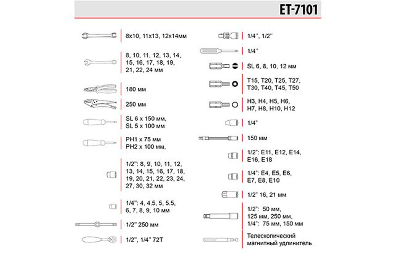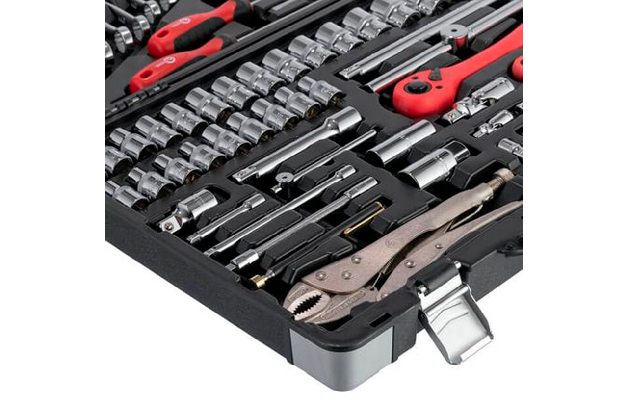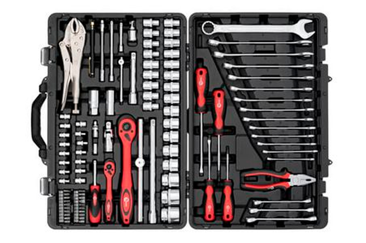 Набор инструментов - это незаменимый инструментарий, который пригодится не только при обслуживании автомобиля, но и для ремонтных работ по дому. Он состоит из 101 единицы с рабочими квадратами 1/2" и 1/4". В набор входят большое количество рожково-накидных ключей (8-24 мм), отверток и отверточных бит, торцевых и свечных головок (4-32 мм; E4-E18), шарнирные воротки и воротки с плавающей головкой, переходники и удлинители, в том числе и гибкие, карданчики, пассатижи, зажимные клещи и другие полезные мелочи. Размер разрезных ключей: 8x1011x1312x14 мм; Габаритные размеры: 520х364х95 мм; Размер рожково-накидных ключей: 8-24 мм; Квадрат: 1/2"1/4"; Количество единиц в наборе: 101 ед.; Материал чемодана: пластик