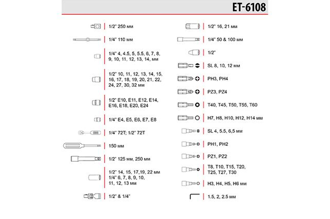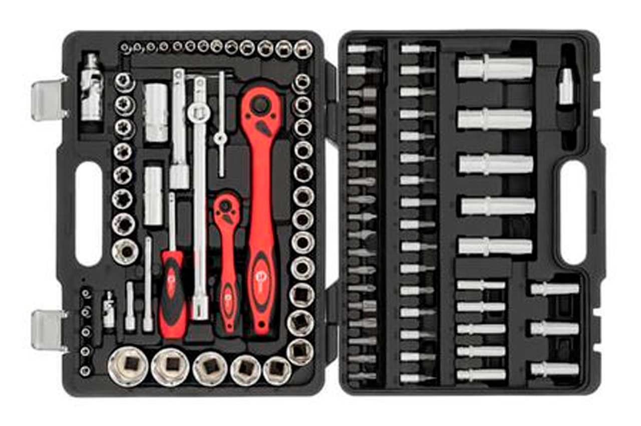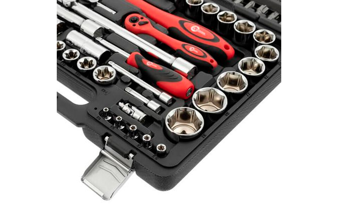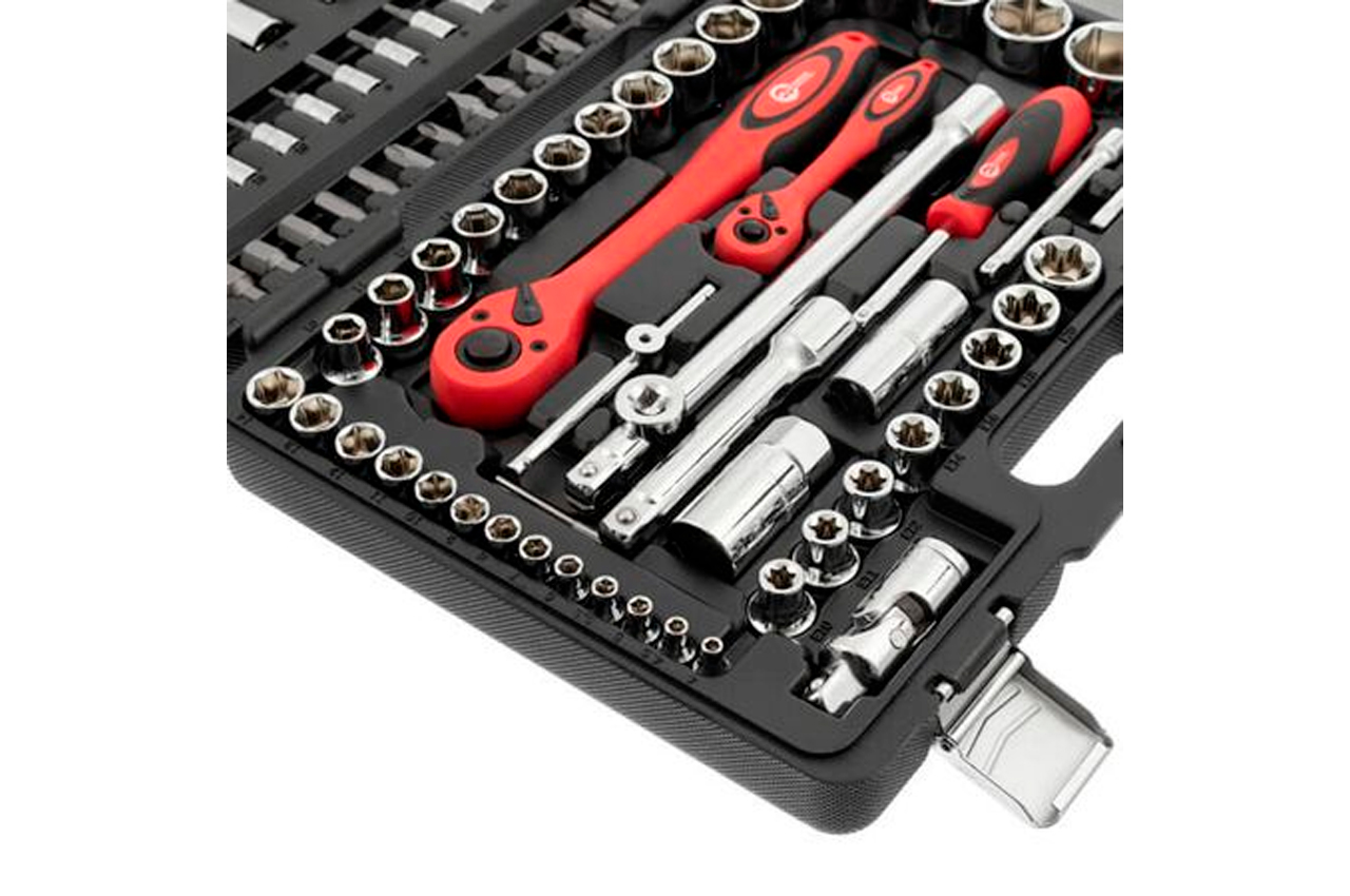 Набор инструментов - незаменимая вещь для самых разнообразных нужд, а главное, для обслуживания автомобиля. Набор состоит из 108 единиц с рабочими квадратами 1/2" и 1/4", практичен и надежен в эксплуатации. Размер головок 4-32 мм. Все насадки изготовлены из хром-ванадиевого сплава. Прорезиненные двухкомпонентные рукоятки изделий удобно сидят в руке и не скользят. Отдельного внимания заслуживают рукоятки с храповым механизмом (трещотка) на 72 зубца с возможностью сброса и фиксации торцевых головок. Они также изготовлены из хром-ванадиумной стали и при этом покрыты защитным слоем из полипропилена, полностью предотвращающим возможность появления коррозии. Габаритные размеры: 370×270×70 мм; Квадрат: 1/2"1/4"; Количество единиц в наборе: 108 ед.; Материал чемодана: пластик