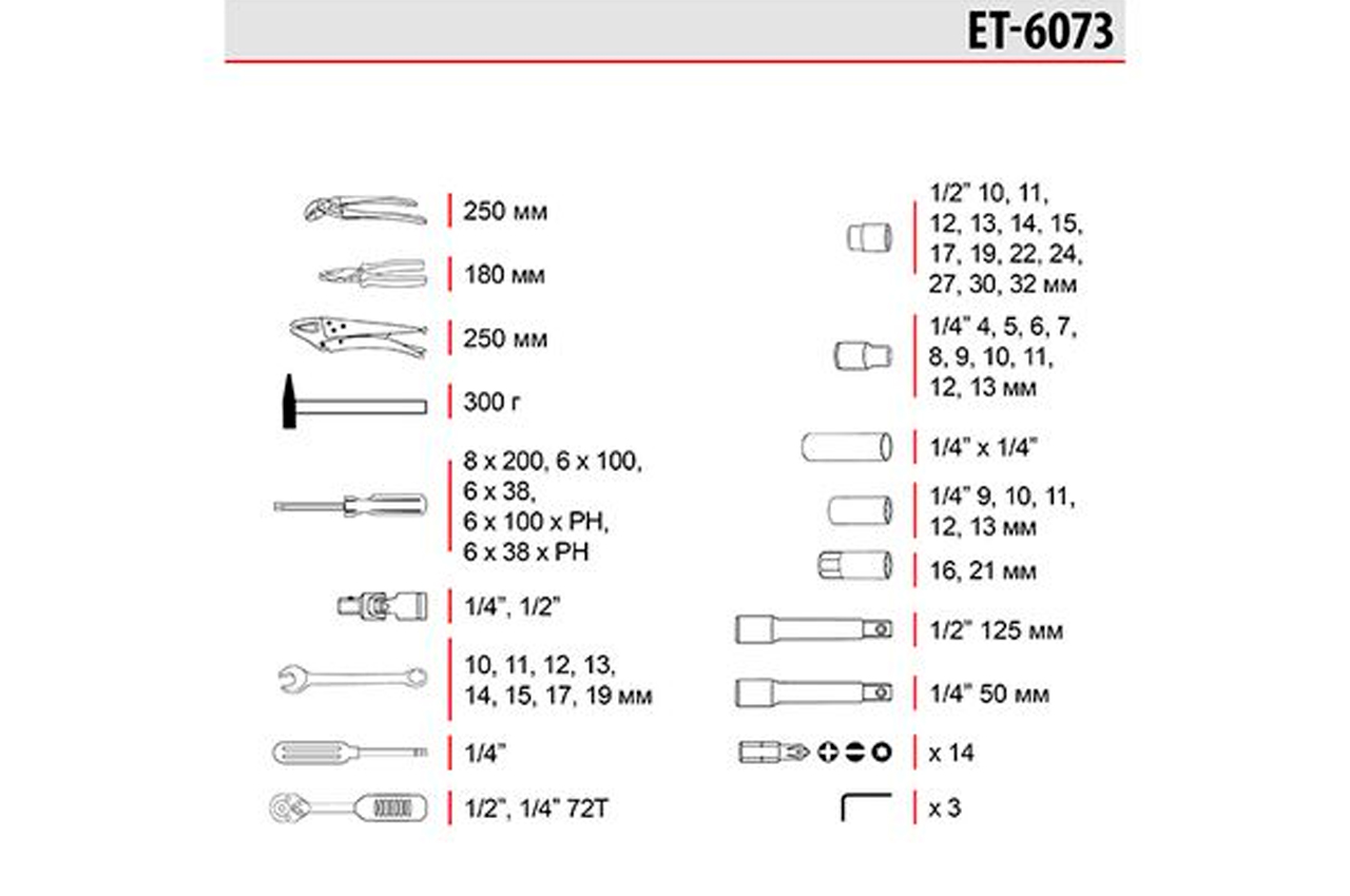 Набор инструмента Intertool - 1/4", 1/2" 72 ед. ET-6073