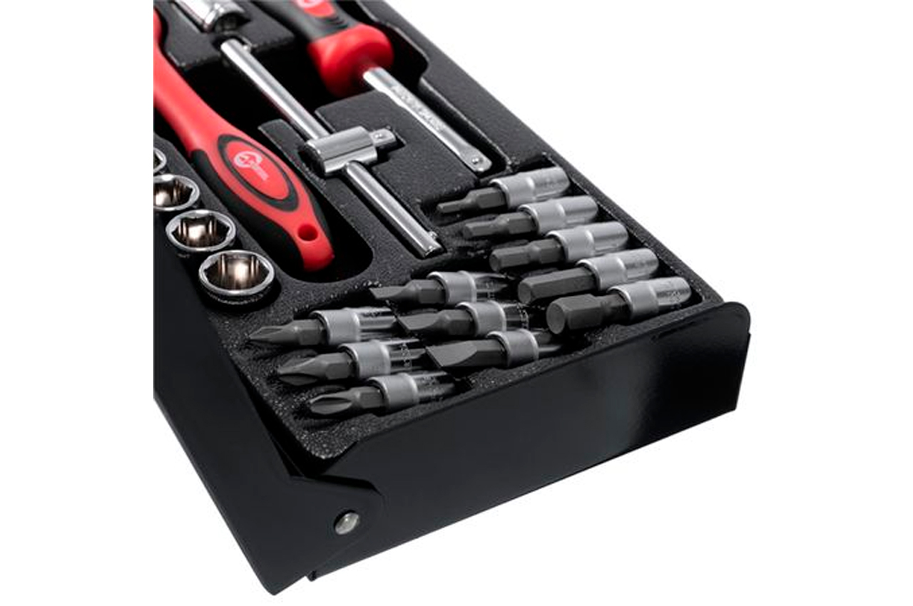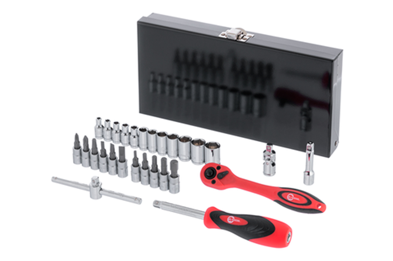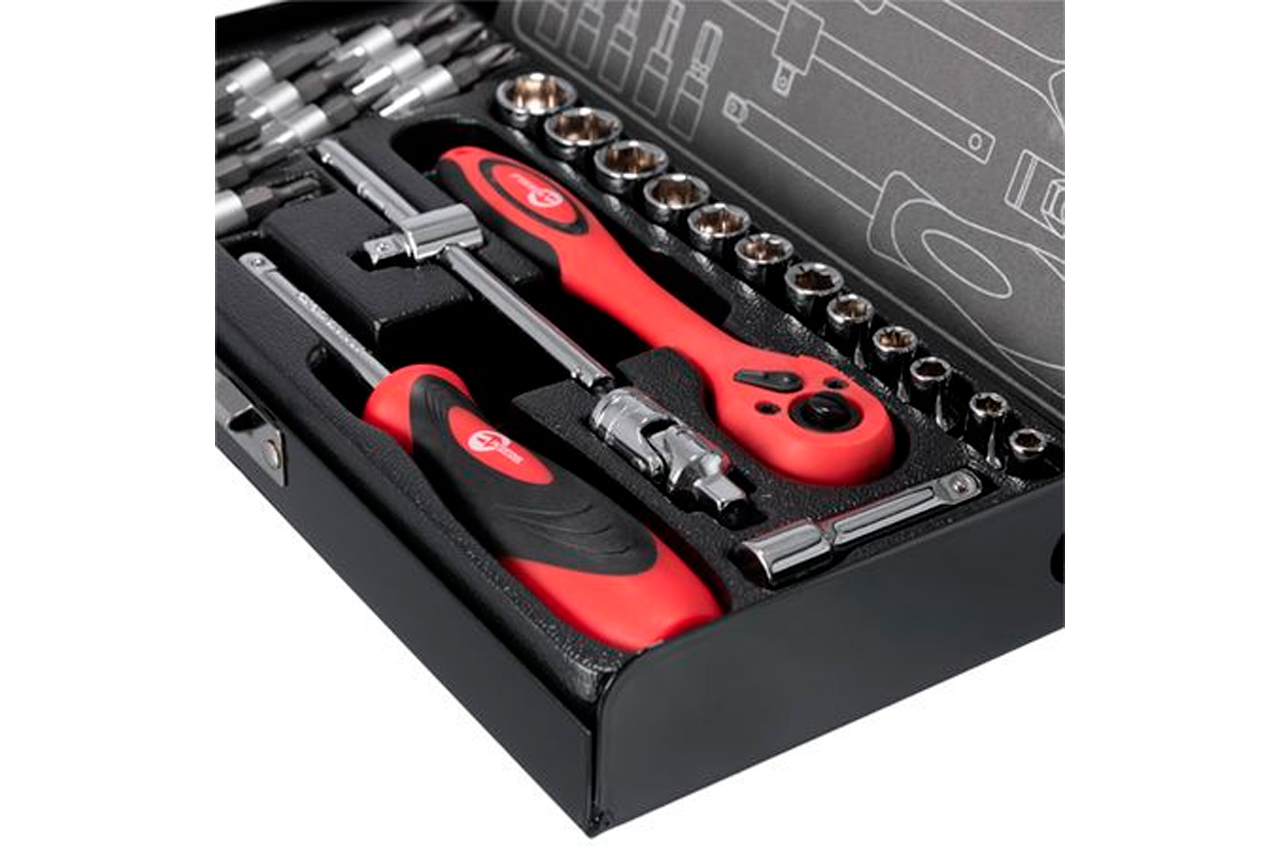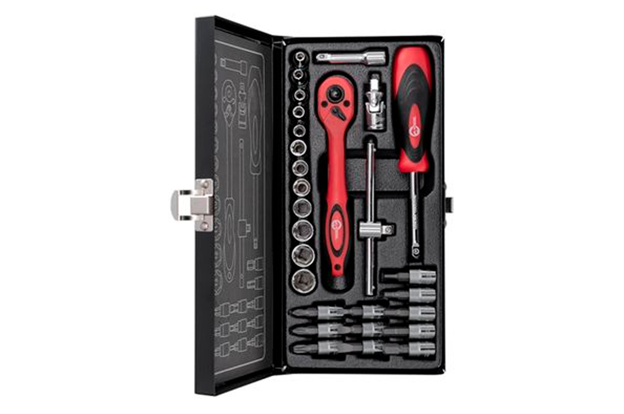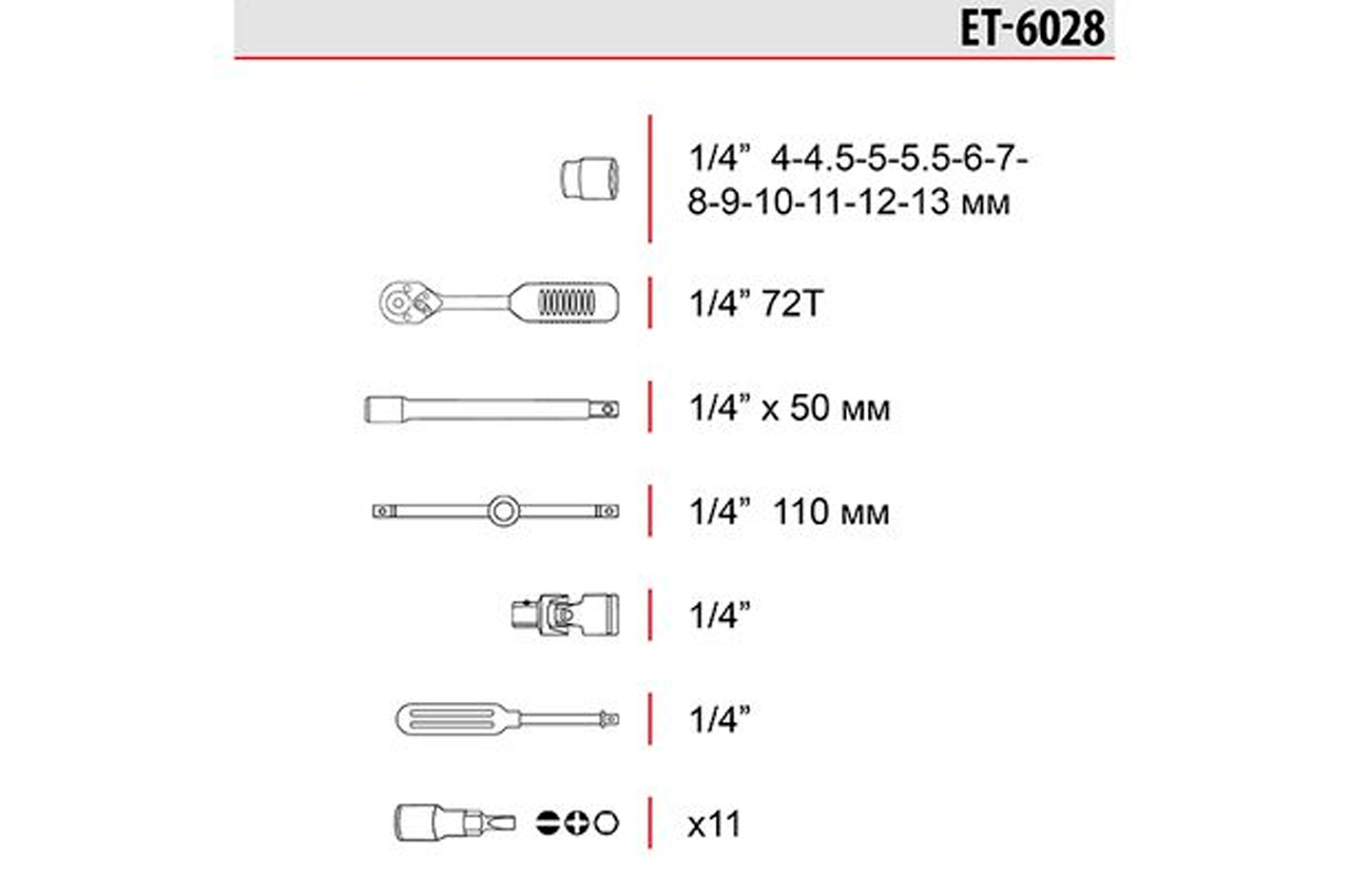 В состав данного набора входит 28 единиц инструмента, укомплектованные в надежный кейс. Набор включает в себя 11 бит, 12 торцевых головок диаметром от 4 до 13 мм, 1 ключ с трещоткой, карданчик, вороток с плавающей головкой, удлинитель, отверточный держатель. Используемый в наборе размер квадрата - 1/4". Габаритные размеры: 240х120х40 мм; Квадрат: 1/4"; Количество единиц в наборе: 28 ед.; Материал чемодана: металл