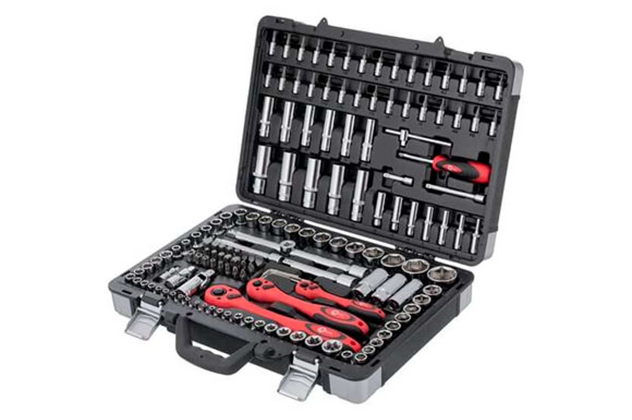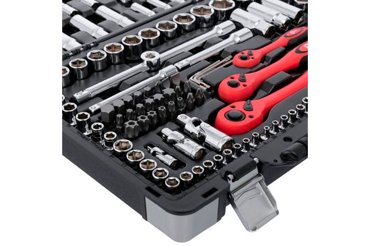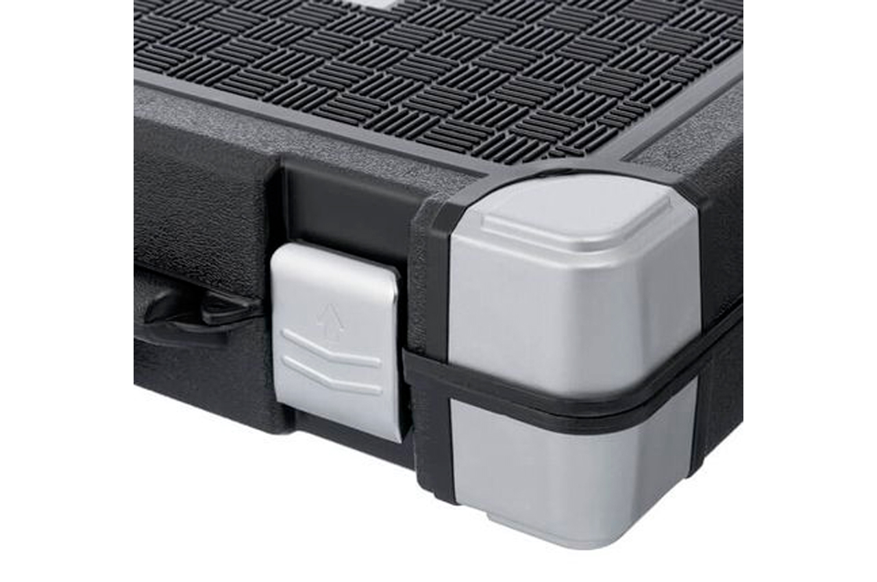 Набор расположен в надежном кейсе из ударопрочного пластика с укрепленными металлическими уголками и металлическими замками. Габаритные размеры: 440х323х97 мм; Квадрат: 1/2" 1/4" 3/8"; Количество единиц в наборе: 151 ед.; Материал чемодана: пластик