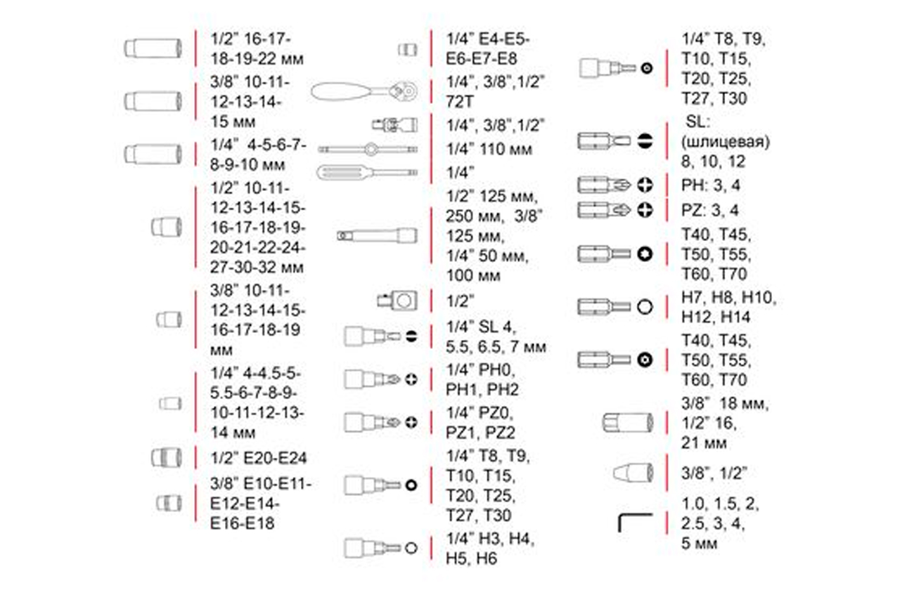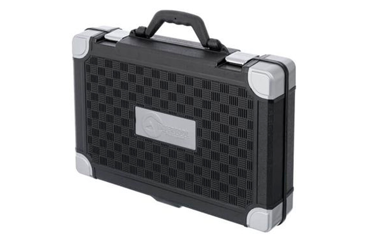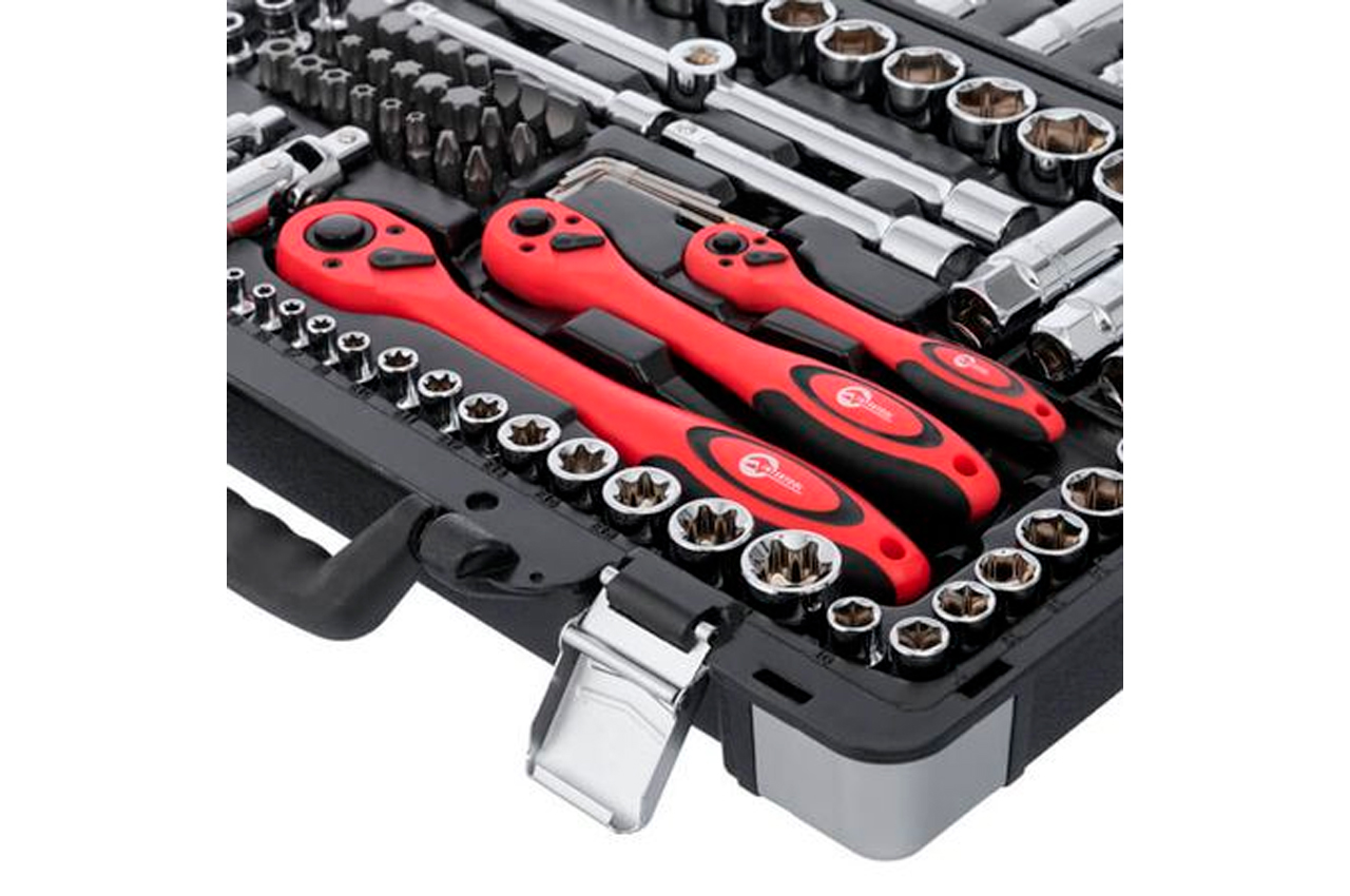 Набор расположен в надежном кейсе из ударопрочного пластика с укрепленными металлическими уголками и металлическими замками. Габаритные размеры: 440х323х97 мм; Квадрат: 1/2" 1/4" 3/8"; Количество единиц в наборе: 151 ед.; Материал чемодана: пластик