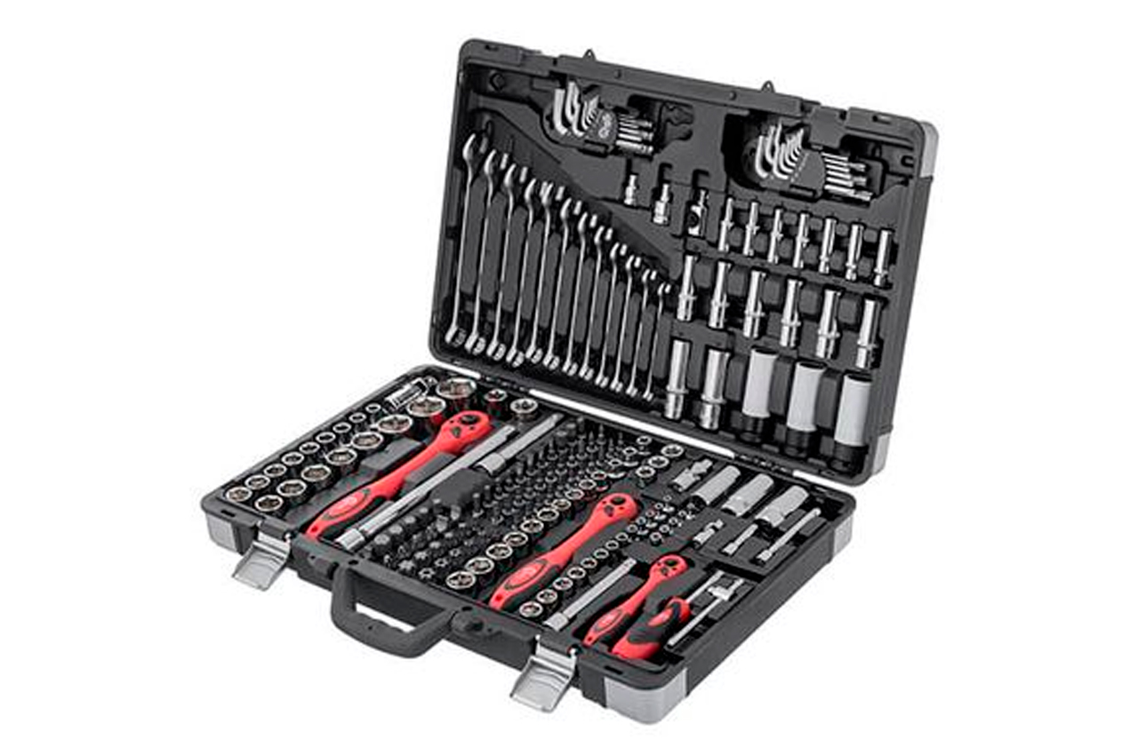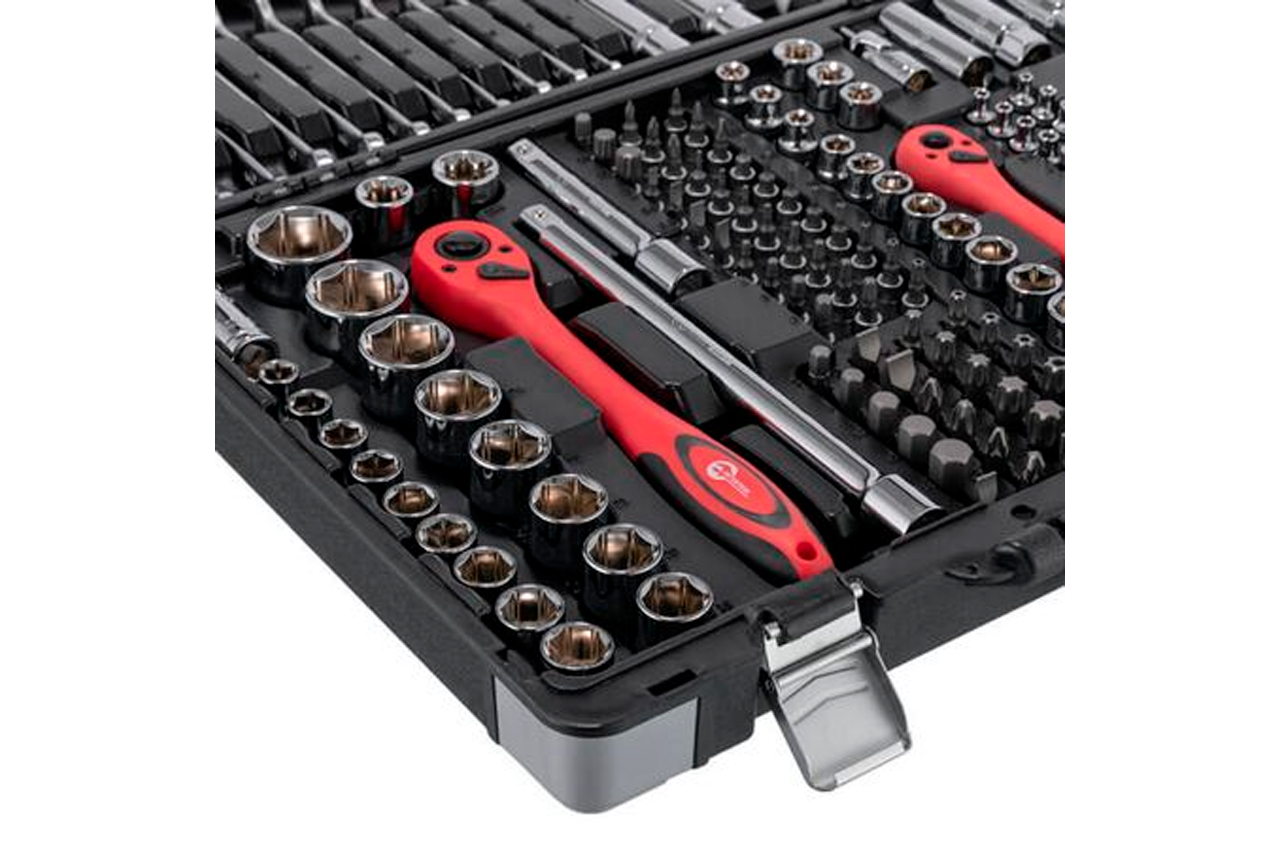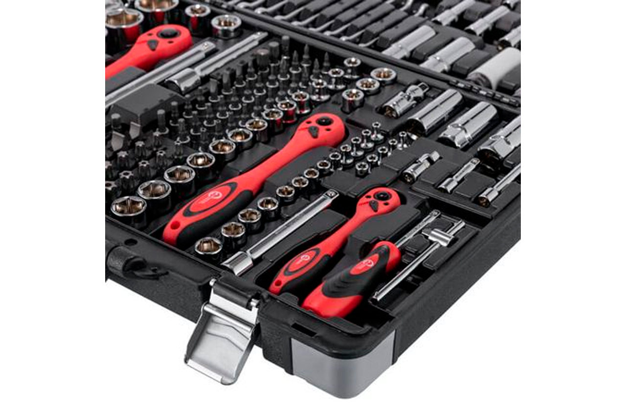 Набор состоит из 176 единиц с рабочими квадратами 1/2", 1/4" и 3/8". Насадки и инструменты изготовлены из высокопрочной хром-ванадиевой стали. Кроме того, в наборе есть три головки из хром-молибденового сплава. Благодаря строгому соблюдению технологии производства, весь инструмент характеризуются точностью и отсутствием дефектов. В наборе представлено огромное количество торцевых головок (4-32 мм; E4-E24), отверточных бит, шестигранных и рожково-накидных ключей. Помимо этого, в нем есть свечные головки, воротки, переходники, удлинители, карданчики, а также три ультралегких трещотки на 72 зубца с возможностью сброса и фиксации торцевых головок. Габаритные размеры: 525х340х90 мм; Квадрат: 1/2"1/4"3/8"; Количество единиц в наборе: 176 ед.; Материал чемодана: пластик