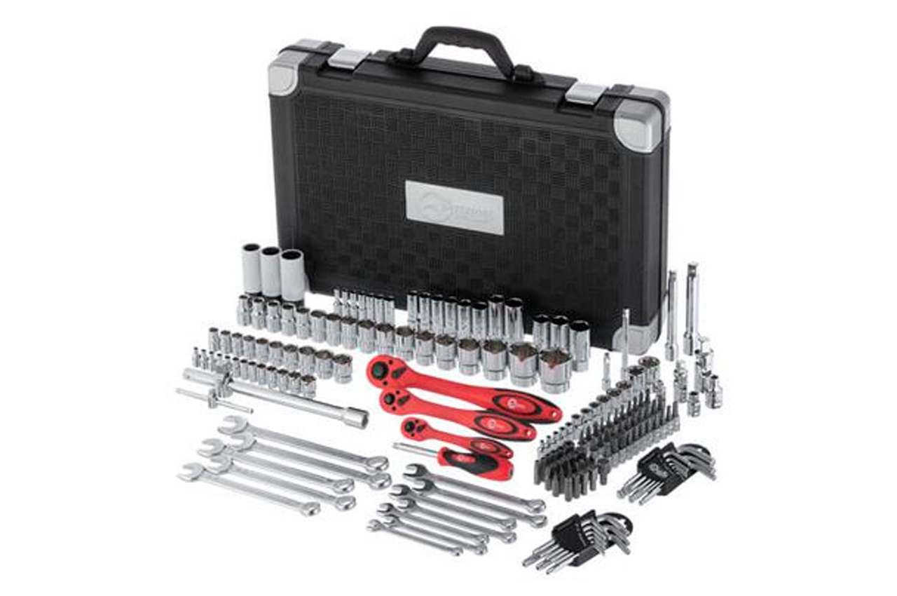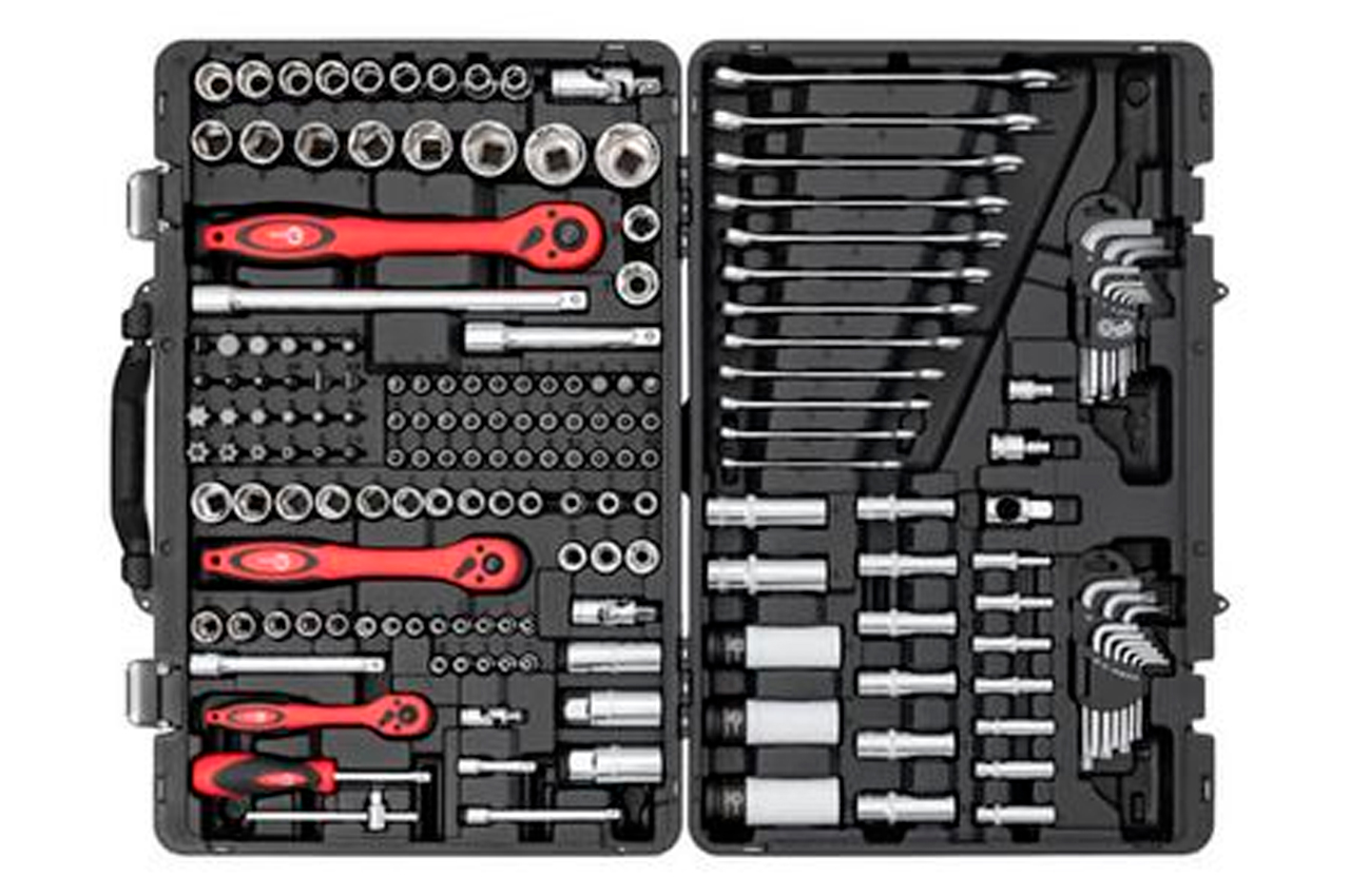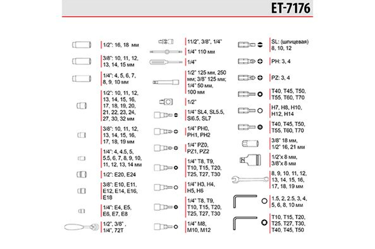 Набор состоит из 176 единиц с рабочими квадратами 1/2", 1/4" и 3/8". Насадки и инструменты изготовлены из высокопрочной хром-ванадиевой стали. Кроме того, в наборе есть три головки из хром-молибденового сплава. Благодаря строгому соблюдению технологии производства, весь инструмент характеризуются точностью и отсутствием дефектов. В наборе представлено огромное количество торцевых головок (4-32 мм; E4-E24), отверточных бит, шестигранных и рожково-накидных ключей. Помимо этого, в нем есть свечные головки, воротки, переходники, удлинители, карданчики, а также три ультралегких трещотки на 72 зубца с возможностью сброса и фиксации торцевых головок. Габаритные размеры: 525х340х90 мм; Квадрат: 1/2"1/4"3/8"; Количество единиц в наборе: 176 ед.; Материал чемодана: пластик