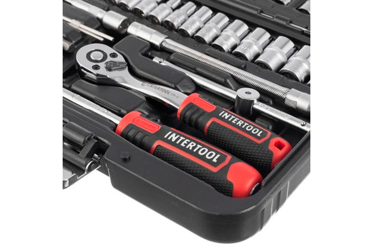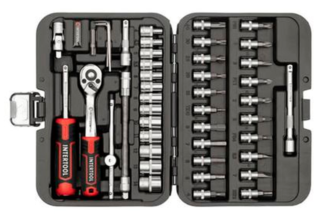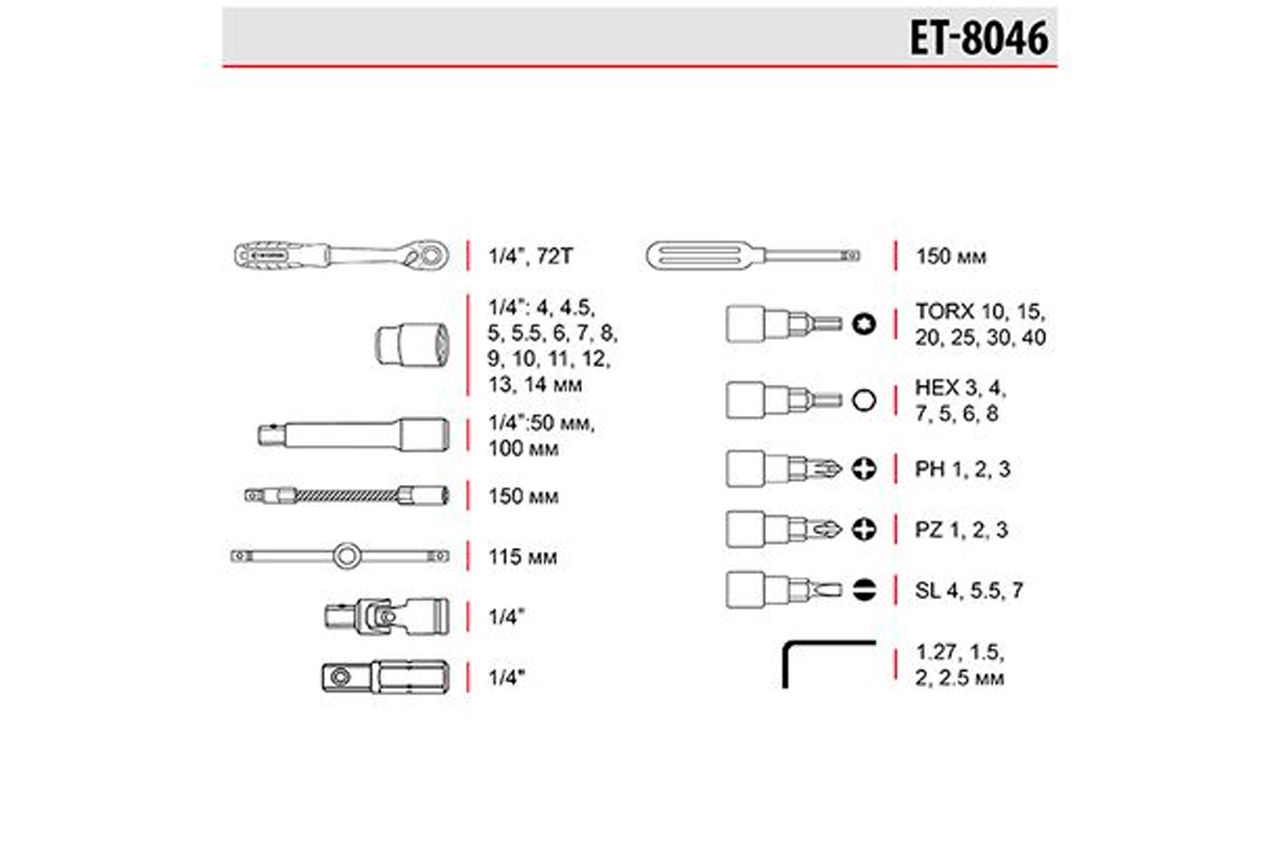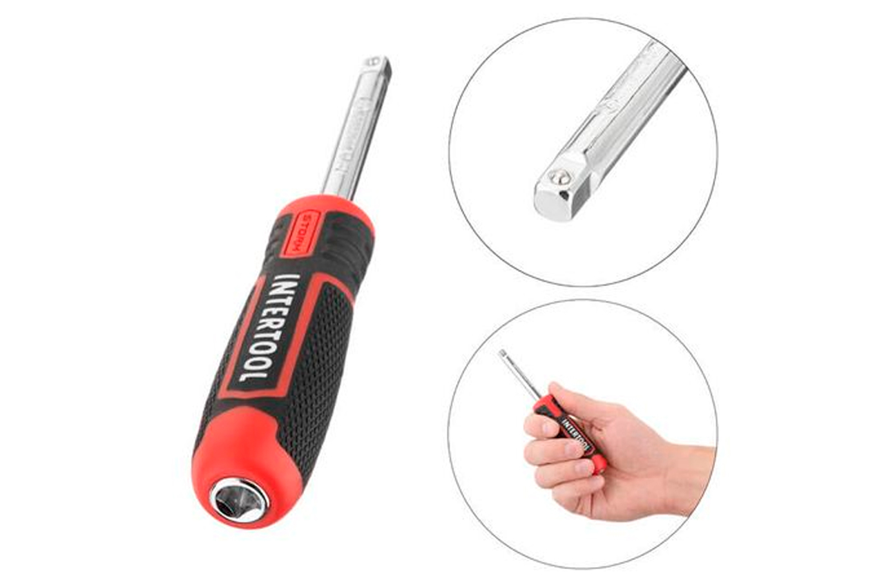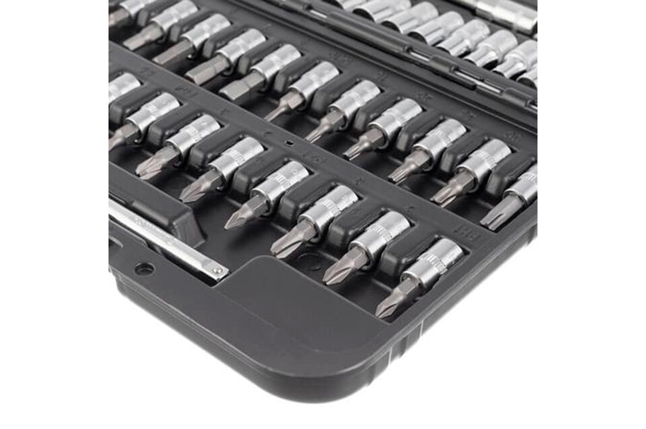 Наборы инструментов STORM - это новое слово в поддержку качества и многофункциональности! Благодаря своей практичности идеально подходят для автолюбителей и домашних мастеров. Особенности: Инструмент на долгие годы. Все комплектующие изготовлены из высококачественных марок стали. Благодаря прочности и современным технологиям производства инструменты отличаются длительным сроком службы, стойкостью к повышенным нагрузкам, а также высокой точностью изготовления. Два слоя никелевого покрытия уберегут от появления ржавчины. Надежная трещоточная рукоятка. Механизм трещотки и все его комплектующие изготовлены в Тайване, в сочетании с Cr-V сталью - это прочный и надежный инструмент, с мягким ходом храпового механизма. Удобное хранение. Весь инструмент укомплектован в надежный, прочный кейс с металлическими замками и усиленными петлями. Яркий современный дизайн кейса никого не оставит равнодушным! Наборы инструментов №1 в Украине. По результатам независимого рейтингового исследования в рамках проекта Украинская Народная Премия в 2018, 2019 годах. Торцевые головки и трещотка Механизм трещотки на 72 зуба изготовлен в Тайване. Отличается плавным ходом храпового механизма, а также прочностью и износостойкостью. Быстрый сброс головок и наличие реверса упростят и во множество раз ускорят работу мастера. Трещотка имеет изогнутую рукоятку для работы в труднодоступных местах. Ручка с резиновой накладкой для максимального хвата, не скользит и не выпадает из Ваших рук. Головки туго сидят на посадочном квадрате трещотки 1/4", не спадают и плотно прилегают к поверхности крепежа. На каждой головке нанесены насечки для предотвращения скольжения в грязных руках или в рукавицах. Кейс Все инструменты упакованы в компактный ударопрочный кейс с надежными металлическими замками. Комплектующие прочно зафиксированы на своих посадочных местах и не выпадают при транспортировке. Благодаря небольшим габаритам кейса (220*160*60 мм) набор поместится в любой кладовке, бардачке или на полке в гараже. Современный яркий дизайн точно не оставит никого равнодушным! Материал изготовления Все инструменты изготовлены из прочной и выносливой Cr-V стали. Головки и трещотка из Cr-V 50BV30, отличаются длительным сроком службы, имеют запас прочности и устойчивы к нагрузкам. Двухслойное никелевое покрытие обеспечивает антикоррозионные свойства инструментов. Каждая бита выполнена из стали Cr-V 6150 с отличными показателями твердости и упругости в своем сегменте. Преимущество комплекта Комплектация набора с приводом 1/4” понадобится для выполнения подавляющего большинства работ, связанных с ремонтом оборудования, авто-, мото-, велотехники, а также прочих работ в быту и в гараже каждого домашнего мастера. В комплекте самые популярные размеры торцевых головок, а также кардан, Т-образный вороток и гибкий удлинитель для откручивания и закручивания крепежей в труднодоступных местах. Различные типы бит пригодятся для работы со шлицами, которые часто используют в мебельной промышленности, в приборостроении и пр. Комплектация Трещоточная рукоятка 1/4", 72 зуба, реверсионная; Головка шестигранная торцевая 1/4", 13 шт.: 4, 4.5, 5, 5.5, 6, 7, 8, 9, 10, 11, 12, 13, 14 мм; Удлинитель 1/4" 50, 100 мм; Гибкий удлинитель 150 мм; Вороток 115 мм; Кардан 1/4"; Адаптер для шуруповерта 1/4"; Держатель 1/4" для головок и бит 150 мм. Биты: TORX 6 ш