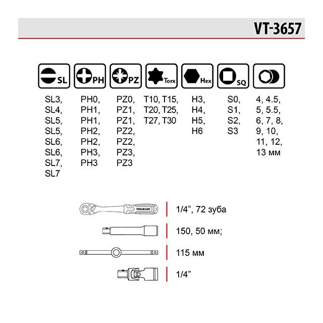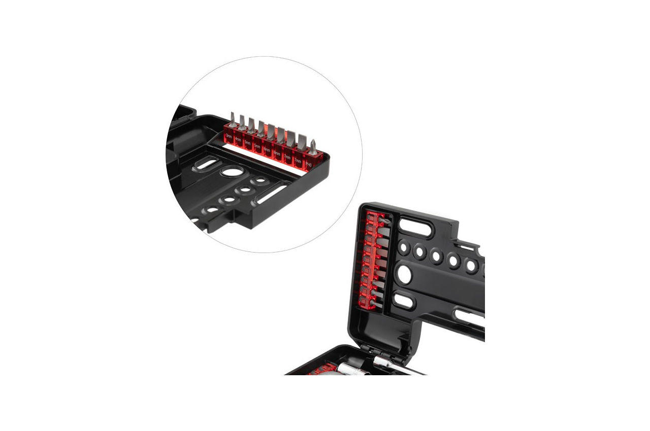 Профессиональный набор STORM с комплектом бит, торцевых головок, воротков предназначен для монтажа и демонтажа любых крепежей. Изготовлен по последним технологиям и соответствует высоким запросам мастеров. Набор может использоваться для интенсивной работы на СТО, в мастерских, в точках сервисного обслуживания и в других отраслях, где необходимо проводить постоянные работы с применением высоких нагрузок. Также комплект станет отличным помощником в домашнем арсенале инструмента и прослужит вам долгие годы! Высокое качество стали Трещотка, насадки, головки, воротки и кардан изготовлены из прочной Cr-V стали, которая известна всем мастерам своей надежностью и выносливостью. В составе этой стали присутствуют хром и ванадий, которые придают изделию высокую стойкость к износу и коррозии. Трещоточная рукоятка Основой набора является трещотка из Cr-V c прорезиненной рукояткой и квадратом 1/4". Кнопка на верхней части трещотки приводит фиксирующий шарик в действие и вы с легкостью можете менять головки, при этом насадки прочно сидят на посадочном квадрате трещотки и не спадают. Храповый механизм на 72 зуба обеспечивает плавный ход и позволяет успешно работать в ограниченном пространстве. Преимущества набора Широкая комплектация набора позволяет работать с мелкими и средними крепежами в механизмах и узлах автомобиля, мотоцикла и прочей техники. Удлинитель, кардан, вороток с плавающей головкой, Г-образные ключи позволяют работать в труднодоступных местах. Разнообразие бит позволяет использовать набор для ремонта любой бытовой техники. Продуманный и функциональный кейс-трансформер Весь набор размещен в компактном кейсе, где удлинитель выступает в роли ручки. Это позволяет экономить пространство при хранении, а также удобно переносить комплект. Вы быстро найдете необходимую насадку, ведь все ячейки под биты и головки пронумерованы! Комплектующие всегда остаются на своих местах и не выпадают при транспортировке - набор закрывается на замок. Комплектация Трещоточная рукоятка 1/4", 72 зуба; удлинитель 150, 50 мм; вороток Т-образный 115 мм; кардан шарнирный; держатель для бит; биты: SL3, SL4, SL5, SL5, SL6, SL6, SL7, SL7, PH0, PH1, PH1, PH2, PH2, PH3, PH3,PZ0, PZ1, PZ1, PZ2, PZ2, PZ3, PZ3,T10, T15, T20, T25, T27, T30 H3, H4, H5, H6,S0, S1, S2, S3; головки 1/4'': 4, 4.5, 5, 5.5, 6, 7, 8, 9, 10, 11, 12, 13 мм; шестигранные ключи: 1.5, 2, 2.5 мм. Трещоточная рукоятка: 1/4", 72 зуба; Твердость по шкале Роквелла: 51-54 HRC; Габаритные размеры: 240*130*35 мм; Количество единиц в наборе: 57 ед.