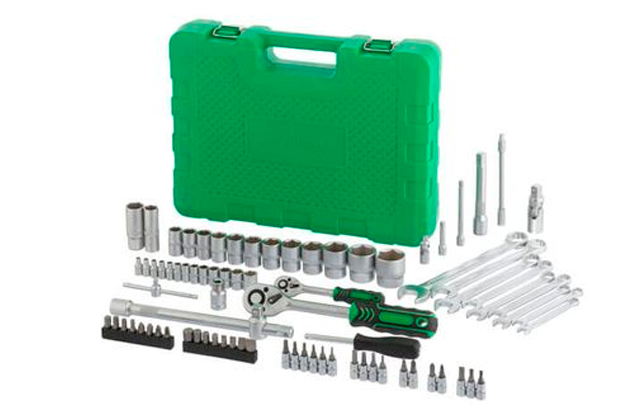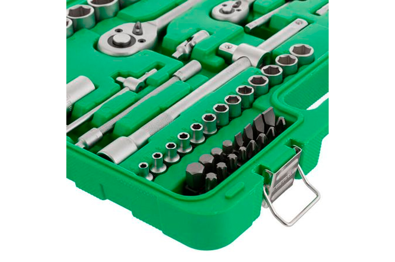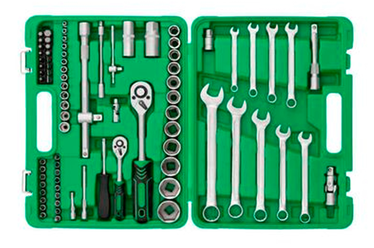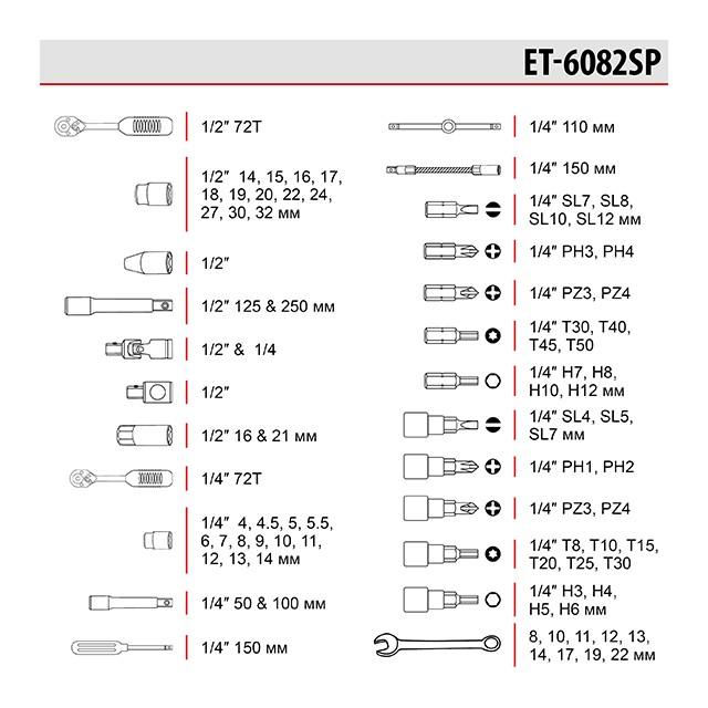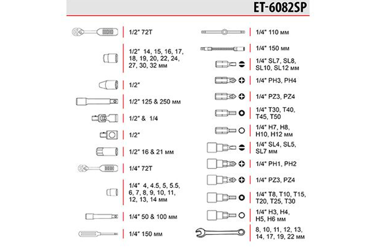 Набор включает в себе 82 единицы различных головок, трещоток и ключей для ремонта автомобиля в своем гараже и не только! Станет незаменимым помощником в быту, в руках у умелого хозяина для решения всевозможных задач на откручивание и закручивание разнообразных крепежей. Самое главное отличие от набора профессиональной серии (ET-6082) это его доступная цена, материал изготовления инструмента и кейса. При этом функционал остается прежним! Все инструменты изготовлены из закаленной углеродистой стали, грани твердые и не стираются в работе. Особенности Выгодный. За относительно небольшую стоимость получаете набор на все случаи жизни. Стальные петли продлевают жизнь кейса надолго. Рожково-накидные ключи в комплекте уж точно не останутся без внимания автомастера. В комплекте две трещоточные рукоятки с посадочными квадратами 1/2" и 1/4", с переключателем направления и массой разнообразных головок к ним. Для труднодоступных мест в наборе предусмотрены удлинители и карданы! Две свечные головки 16 и 21 мм решают задачу с демонтажем свечей зажигания. Набор из девяти рожково-накидных ключей, воротки и разнообразие бит помогут справиться с любым крепежом. Компактный кейс позволит сохранить инструменты в безукоризненном порядке, а ложемент организован таким образом, что Вам не придется долго искать необходимый инструмент. Крутите гайки с удовольствием, с этим набором инструмента! Комплектация -Трещоточная рукоятка 1/2" 72 зуба, реверсионная; -Головка шестигранная торцевая 1/2" 12 шт.: 14, 15, 16, 17, 18, 19, 20, 22, 24, 27, 30, 32 мм; -Головка свечная 1/2" 2 шт.: 16 мм и 21 мм; -Вороток с плавающей головкой 1/2" 250 мм; -Удлинитель 1/2" 125 мм; -Кардан 1/2"; -Переходник под биты 1/2". -Трещоточная рукоятка 1/4" 72 зуба, реверсионная; -Головка шестигранная торцевая 1/4" 13шт.: 4, 4.5, 5, 5.5, 6, 7, 8, 9, 10, 11, 12, 13, 14 мм; -Удлинитель 1/4" 2 шт.: 50, 100 мм; -Вороток 1/4" с плавающей головкой 110 мм; -Кардан 1/4"; -Гибкий удлинитель 1/4" 150 мм; -Держатель 1/4" для головок и бит 150 мм; Биты: -HEX 4 шт.: 7, 8, 10, 12 мм; -TORX 4 шт.: T30, T40, T45, T50; -PH 2 шт.: PH3, PH4; -PZ 2 шт.: PZ3, PZ4; -SL 4 шт.: 7, 8, 10, 12 мм. -Головка с насадкой HEX 1/4" 4 шт.: 3, 4, 5, 6 мм; -Головка с насадкой TORX 1/4" 6 шт.: T8, T10, T15, T20, T25, T30; -Головка с шлицевой насадкой SL 1/4" 3 шт.: 4, 5, 7 мм; -Головка с насадкой PH 1/4" 2 шт.: PH1, PH2; -Головка с насадкой PZ 1/4" 2 шт.: PZ1, PZ2. -Рожково-накидные ключи 9 шт.: 8, 10, 11, 12, 13, 14, 17, 19, 22 мм. Трещоточная рукоятка: 1/2", 1/4", 72 зуба; Габаритные размеры: 390х290х90 мм; Количество единиц в наборе: 82 ед.; Материал чемодана: пластик