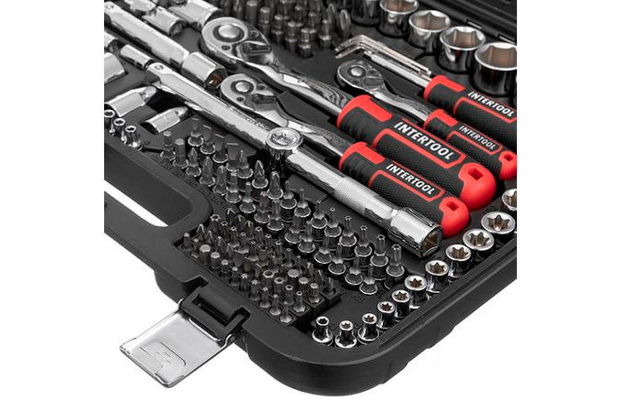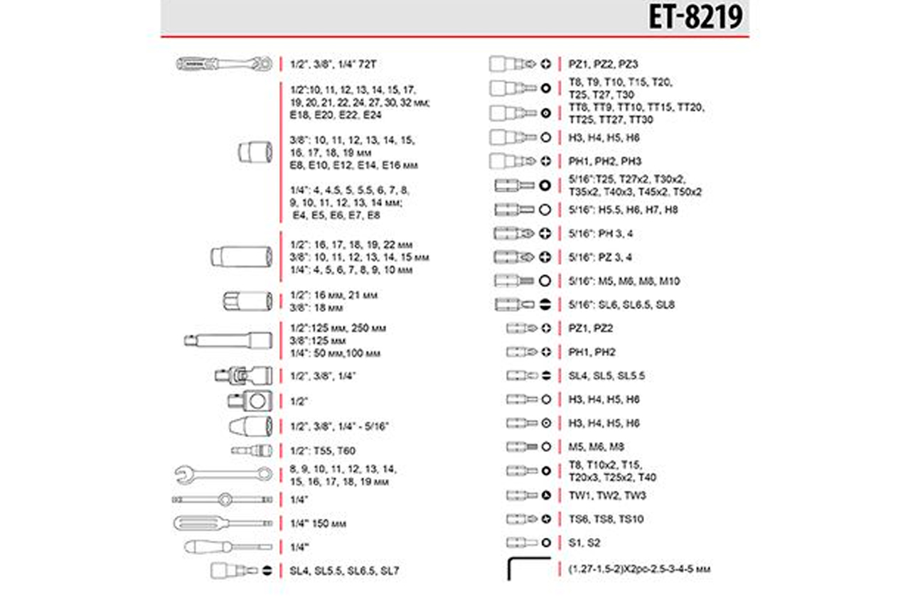 Наборы инструментов STORM - это новое слово в поддержку качества и многофункциональности! Благодаря своей практичности идеально подходят для автолюбителей и домашних мастеров. Широкий выбор инструментов позволяет справиться почти с любым видом крепежа, что очень выручает при внезапных поломках в дороге и замене деталей в гараже. Основой набора являются три трещотки с посадочными квадратами: 1/2", 3/8", 1/4". Также в набор вошли: Шестигранные головки в диапазоне от 4 до 32 мм, помогут открутить почти любой болт или гайку. Удлиненные головки от 4 до 22 мм понадобятся для работы с высокими шпильками винтов, а также в труднодоступных метах. Головки Е-тип ("звездочки") подходят для специальных видов болтов и гаек, часто применяются для ремонта современных автомобилей, размеры в диапазоне от Е4 до Е24. Свечные головки с улавливателем помогают сменить свечи зажигания без особых усилий (16 мм и 21 мм). Удлинители, карданы, Г-образные шестигранные ключи позволяют добраться до самых труднодоступных мест. Комбинированные ключи в размерах от 8 до 19 мм со сбалансированной рукояткой для выполнения разноплановых работ. Широкий выбор бит и головок с насадками (SL, PZ, PH, TORX, TT, HEX, M, TW, TQ, S) позволяют работать с различными крепежами в бортовой технике, приборостроении, электротехнике, в мебельной сфере и пр. Комплектация Трещоточная рукоятка 1/2", 72 зуба, реверсионная; Головка шестигранная торцевая 1/2", 15 шт.: 10, 11, 12, 13, 14, 15, 17, 19, 20, 21, 22, 24, 27, 30, 32 мм; Головка E-тип (Torx) 1/2", 4 шт.: Е18, Е20, Е22, Е24; Головка шестигранная удлиненная 1/2", 5 шт.: 16, 17, 18, 19, 22 мм; Головка свечная 1/2", 2 шт: 16, 21 мм; Удлинитель 1/2", 2 шт.: 125 и 250 мм; Кардан 1/2"; Переходник 1/2"; Адаптер для бит 1/2"; Головка с насадкой T55-T60; Ключи комбинированные, 12 шт.: 8, 9, 10, 11, 12, 13, 14, 15, 16, 17, 18, 19 мм. Трещоточная рукоятка 3/8", 72 зуба, реверсионная; Головка шестигранная торцевая 3/8", 10 шт.: 10, 11, 12, 13, 14, 15, 16, 17, 18, 19 мм; Головка E-тип (Torx) 3/8", 5 шт.: Е8, Е10, Е12, Е14, Е16; Головка шестигранная удлиненная 3/8", 5 шт.: 10, 11, 12, 13, 14, 15 мм; Удлинитель 3/8", 125 мм; Кардан 3/8"; Адаптер для бит 8 мм; Трещоточная рукоятка 1/4", 72 зуба, реверсионная; Головка шестигранная торцевая 1/4", 13 шт.: 4, 4.5, 5, 5.5, 6, 7, 8, 9, 10, 11, 12, 13, 14 мм; Головка E-тип (Torx) 1/4", 5 шт.: Е4, Е5, Е6, Е7, Е8; Головка шестигранная удлиненная 1/4", 7 шт.: 4, 5, 6, 7, 8, 9, 10 мм; Удлинитель 1/4", 2 шт.: 50, 100 мм; Вороток 1/4" Кардан 1/4"; Адаптер для бит 1/4"; Держатель для головок 1/4"; Отвертка для бит; Г-образные шестигранные ключи, 10 шт.: (1.27, 1.5, 2)*2 шт., 2.5, 3, 4, 5 мм; Головка с насадкой SL 1/4", 4 шт.: 4, 5.5, 6.5, 7 мм; Головка с насадкой PZ 1/4", 3 шт.: PZ1, PZ2, PZ3; Головка с насадкой TORX 1/4", 8 шт.: T8, T9, T10, T15, T20, T25, T27, T30; Головка с насадкой TT 1/4", 8 шт.: TT8, TT9, TT10, TT15, TT20, TT25, TT27, TT30; Головка с насадкой HEX 1/4", 4 шт.: H3, H4, H5, H6; Головка с насадкой PH 1/4", 3 шт.: PH1, PH2, PH3. Биты 30 мм, 30 шт.: TORX 14 шт.: T25, T27х2, T30х2, T35х2, Е40х2, T45х2, T50х2; HEX 5 шт.: H5.5, H6, H7, H8; SL 3 шт.: SL6, SL6.5, SL8; PH 2 шт.: PH3, PH4; PZ 2 шт.: PZ3, PZ4; M 4 шт.: M5, M6, M8, M10. Биты 25 мм, 44 шт.: HEX 4 шт.: H3, H4, H5, H6; HEX 4 шт.: H3, H4, H5, H6 (с фиксацией); PH 2 шт.: PH1, PH2; PZ 2 шт.: PZ1, PZ2; TORX 5 шт.: T8, T10, T15, T20, T25; TT 10 шт.: 8, 10x2, 15, 20x3, 25x2, 40; M 3 шт.: M5, M6, M8; SL 3 шт.: SL4, SL5, SL5.5; TW 3 шт.: TW1, TW2, TW3; TQ 3 шт.: TQ6, TQ8, TQ10; S 2 шт.: S1, S2; SL 3 шт.: SL4, SL6, SL8. Трещоточная рукоятка: 1/2"3/8", 1/4", 72 зуба; Габаритные размеры: 430х335х80 мм; Материал кейса: ударопрочный пластик; Количество единиц в наборе: 219 ед.