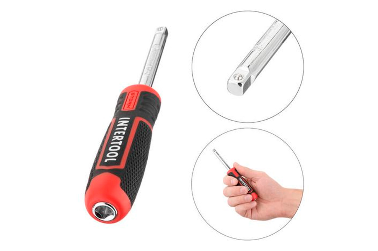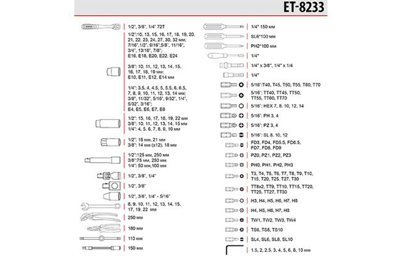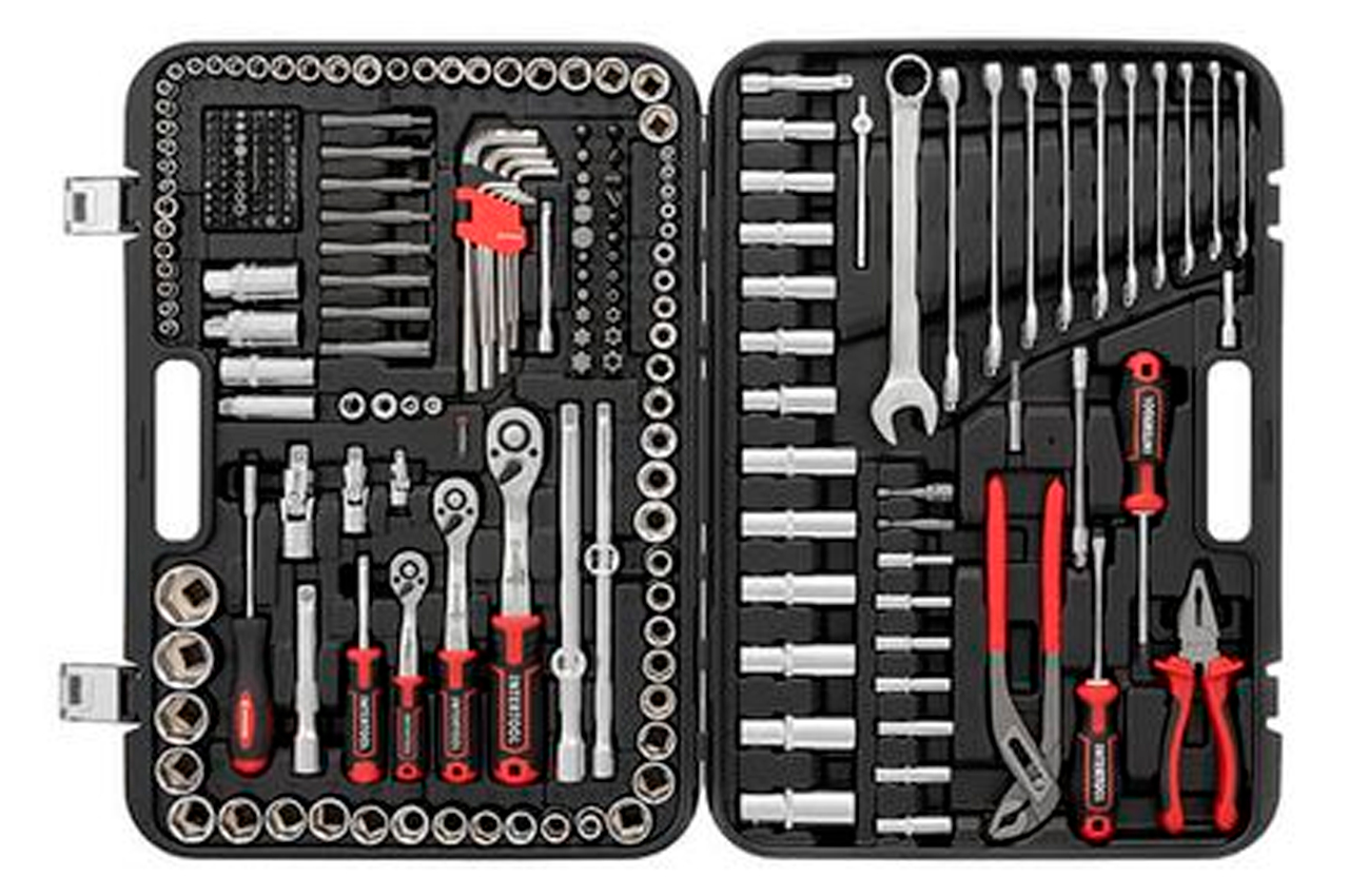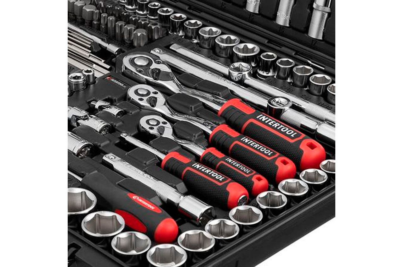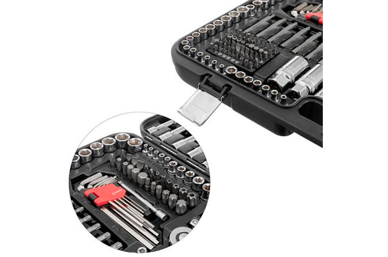 Наборы инструментов STORM - это новое слово в поддержку качества и многофункциональности! Благодаря своей практичности идеально подходят для автолюбителей и домашних мастеров. Широкий выбор инструментов позволяет справиться почти с любым видом крепежа, что очень выручает при внезапных поломках в дороге и замене деталей в гараже. Функционал набора Набор с обширной комплектацией в 233 предмета содержит в основе три трещоточные рукоятки с посадочными квадратами 1/2", 3/8", 1/4". Также в набор вошли: Метрические головки: - шестигранные торцевые головки с размерами от 3,5 до 32 мм для работы с различными видами крепежей. - удлиненные головки от 4 до 22 мм помогут в работе с высокими шпильками винтов, а также в труднодоступных местах. - свечные головки на 16 и 21 мм позволяет выкрутить свечу зажигания в любом автомобиле и мототехнике. Дюймовые головки от 3/8” до 7/8” для работы с дюймовыми размерами креплений. Головки E-типа с размерным рядом от E4 до E24, для работы с крепежами с типом профиля "звездочка", который часто встречаются в современных автомобилях. Удлинители, воротки, карданы, а также гибкий удлинитель помогут достать крепеж в глубоких колодцах двигателя и в местах с ограниченным пространством. Разнообразие бит, длиной 30 и 75 мм (FD, PZ, PH, T, TT, H, TW, TS, SL) понадобятся в быту, для ремонта электротехники, мебели и пр. Отвертки, плоскогубцы, сантехнический ключ и шестигранники также пригодятся в быту для выполнения различных задач. Комплектация Трещоточная рукоятка 1/2", 72 зуба, реверсионная; Головка шестигранная торцевая 1/2", 15 шт.: : 10, 13, 15, 16, 17, 18, 19, 20, 21, 22, 23, 24, 27, 30, 32 мм; Головка дюймовая 1/2", 8 шт.: 7/16”, 1/2”, 9/16”, 5/8”, 11/16”, 3/4”, 13/16”, 7/8”; Головка удлиненная шестигранная 1/2", 6 шт.: 15, 16, 17, 18, 19, 22 мм; Головка E-тип (Torx) 1/2", 5 шт.: E16, E18, E20, E22, E24; Головка свечная 1/2", 2 ш.: 16, 21 мм; Удлинитель 1/2", 2 шт.: 125 и 250 мм; Кардан 1/2"; Переходник 1/2"; Адаптер для бит 1/2”. Трещоточная рукоятка 3/8", 72 зуба, реверсионная; Головка шестигранная торцевая 3/8", 10 шт.: 10, 11, 12, 13, 14, 15, 16, 17, 18, 19 мм; Головка E-тип (Torx) 3/8", 4 шт.: E10, E11, E12, E14; Головка шестигранная удлиненная 3/8", 6 шт.: 10, 11, 12, 13, 14, 15 мм; Головка свечная, 3/8", 2 шт.: 14 мм (х12), 18 мм; Удлинитель 3/8", 2 шт.: 75, 250 мм; Кардан 3/8"; Переходник 3/8"; Адаптер для бит 3/8". Трещоточная рукоятка 1/4", 72 зуба, реверсионная; Головка шестигранная торцевая 1/4", 15 шт.: 3.5, 4, 4.5, 5, 5.5, 6, 6.5, 7, 8, 9, 10, 11, 12, 13, 14 мм; Головка дюймовая 1/4", 7 шт.: 3/8”, 11/32”, 5/16”, 9/32”, 1/4”, 5/32”, 3/16”; Головка E-тип (Torx) 1/4", 5 шт.: E4, E5, E6, E7, E8; Головка шестигранная удлиненная 1/4", 7 шт.: 4, 5, 6, 7, 8, 9, 10 мм; Удлинитель 1/4", 2 шт.: 50, 100 мм; Кардан 1/4"; Держатель для бит 1/4", 150 мм; Гибкий удлинитель 1/4"; Вороток с плавающей головкой 1/4", 110 мм; Адаптер для шуруповерта 2 шт.: 1/4”x1/4”, 1/4”x3/8”; Отвертка с магнитом для бит; Держатель для бит 1/4"; Адаптер для шуруповерта с магнитом. Г-образные шестигранные ключи, 9 шт.: 1.5, 2, 2.5, 3, 4, 5, 6, 8, 10 мм. Клещи сантехнические 250 мм; Плоскогубцы 180 мм; Отвертка SL6, 100 мм; Отвертка PH2, 100 мм; Комбинированные ключи 11 шт.: 8, 9, 10, 11, 12, 13, 14, 15, 17, 19, 22 мм; Биты 75 мм: T40; T45, T50, T55, T60, T70; TT40, TT45, TT50, TT55, TT60, TT70; PH3, 4; PZ3, 4; SL8, 10, 12; HEX7, 8, 10, 12, 14. Биты 30 мм: FD3, FD4, FD5.5, FD6.5, FD7, FD8, FD9; PZ0, PZ1, PZ2, PZ3; PH0, PH1, PH2, PH3; T3, T4, T5, T6, T7, T8, T9, T10, T15, T20, T25, T27, T30; TT8х2, TT9, TT10, TT15, TT20, TT25, TT27, TT30; H3, H4, H5, H6, H7, H8; H4, H5, H6, H7, H8 (с фиксатором); TW1, TW2, TW3, TW4; TS6, TS8, TS10; SL4, SL6, SL8, SL10. Трещоточная рукоятка: 1/2"3/8", 1/4", 72 зуба; Габаритные размеры: 540х395х90 мм; Материал кейса: ударопрочный пластик; Количество единиц в наборе: 233 ед