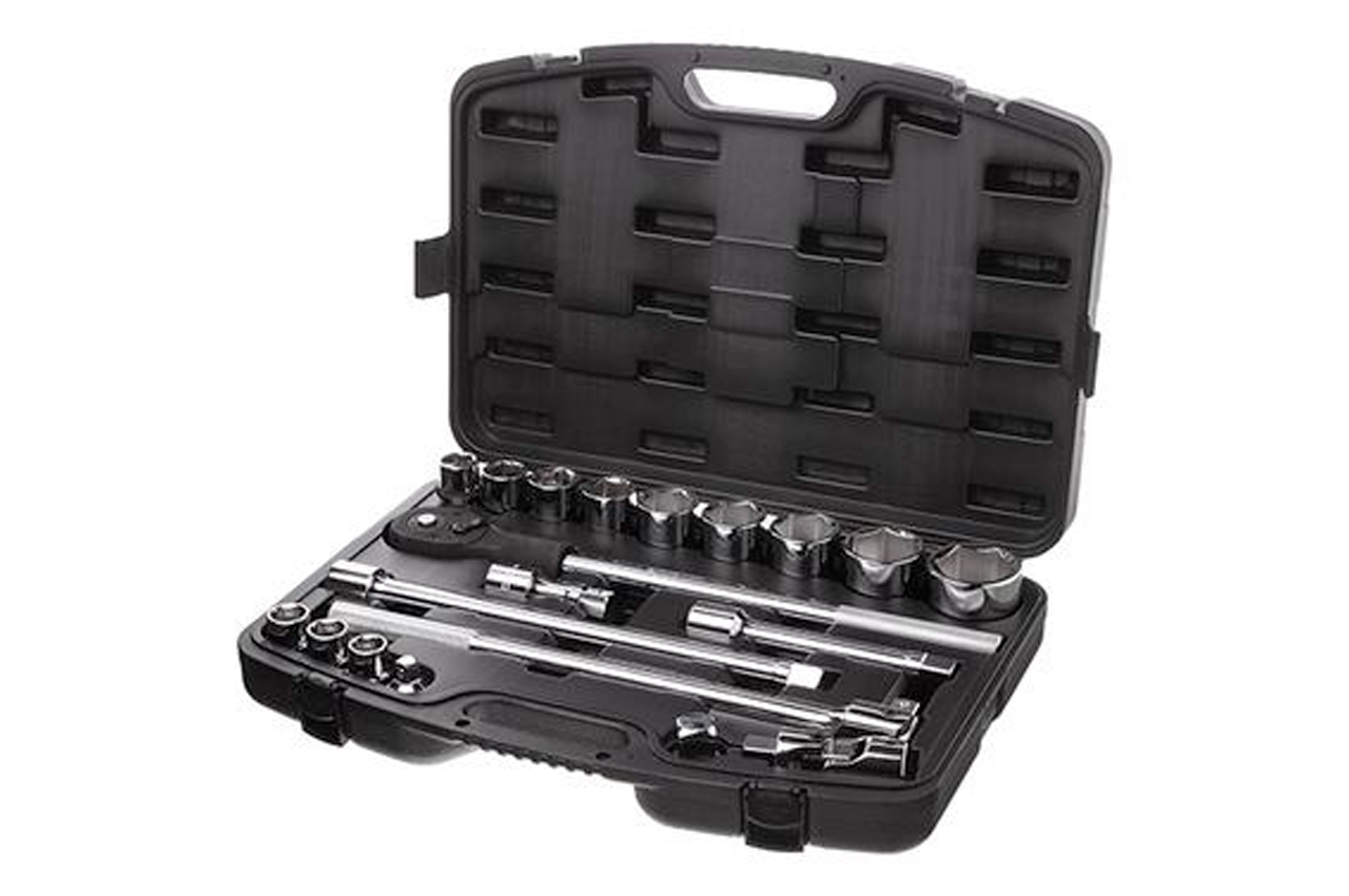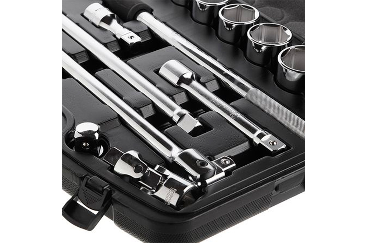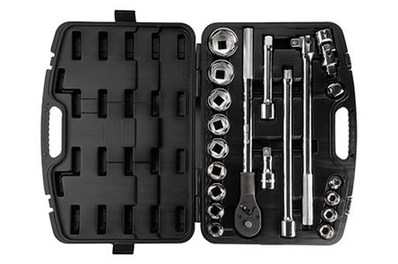 Профессиональный набор инструментов включает 20 единиц, предназначенных для ремонта грузовиков и другой тяжелой техники. Инструменты, входящие в состав данного набора, отличаются большими размерами и исключительно высоким качеством. Так, торцевые головки, представленные в количестве 9 штук, имеют диаметр от 19 до 50 мм и изготовлены из хром-ванадиевой стали. Кроме того, в набор входят вороток, три удлинителя, трещотка, переходники и карданчик. Используемый размер квадрата - 3/4". Набор поставляется в кейсе из ударопрочного пластика. Габаритные размеры: 535х380х100 мм; Квадрат: 3/4"; Количество единиц в наборе: 20 ед.; Материал чемодана: пластик