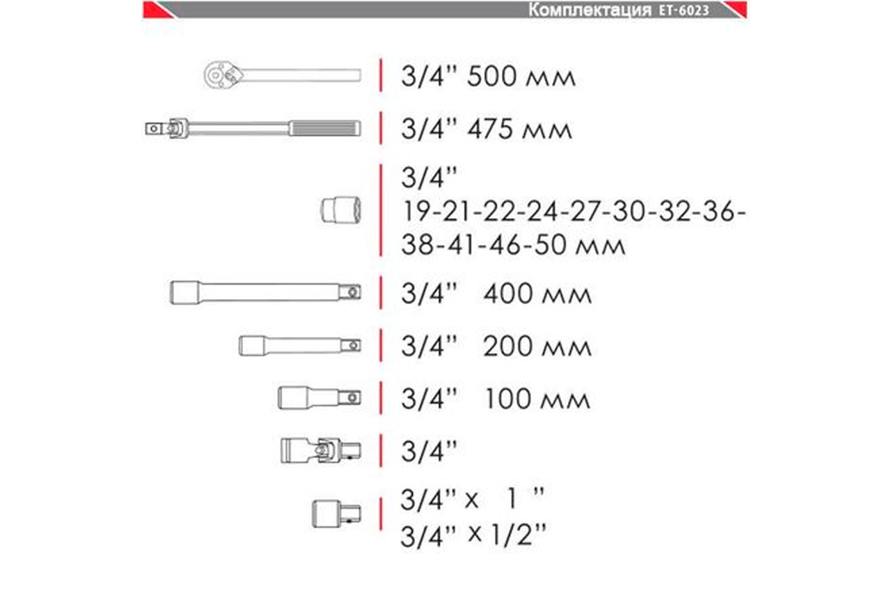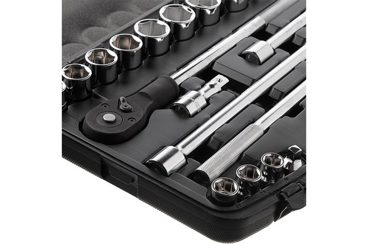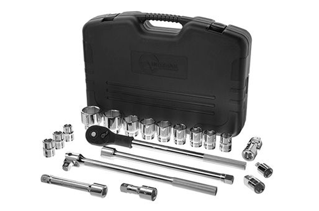 Профессиональный набор инструментов включает 20 единиц, предназначенных для ремонта грузовиков и другой тяжелой техники. Инструменты, входящие в состав данного набора, отличаются большими размерами и исключительно высоким качеством. Так, торцевые головки, представленные в количестве 9 штук, имеют диаметр от 19 до 50 мм и изготовлены из хром-ванадиевой стали. Кроме того, в набор входят вороток, три удлинителя, трещотка, переходники и карданчик. Используемый размер квадрата - 3/4". Набор поставляется в кейсе из ударопрочного пластика. Габаритные размеры: 535х380х100 мм; Квадрат: 3/4"; Количество единиц в наборе: 20 ед.; Материал чемодана: пластик