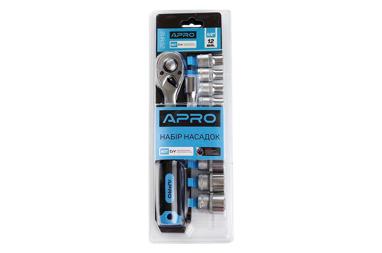 Набор инструментов APRO – универсальный набор для ремонтно-монтажных работ, состоящий из 12 предметов: Удлинитель 1/2": 125 мм Зубы в трещине 90 Насадки 1/2 10, 11, 12, 13, 14, 15, 17, 19, 22, 24 мм Гарантийный срок 12 месяцев Материал хром-молибденовая сталь