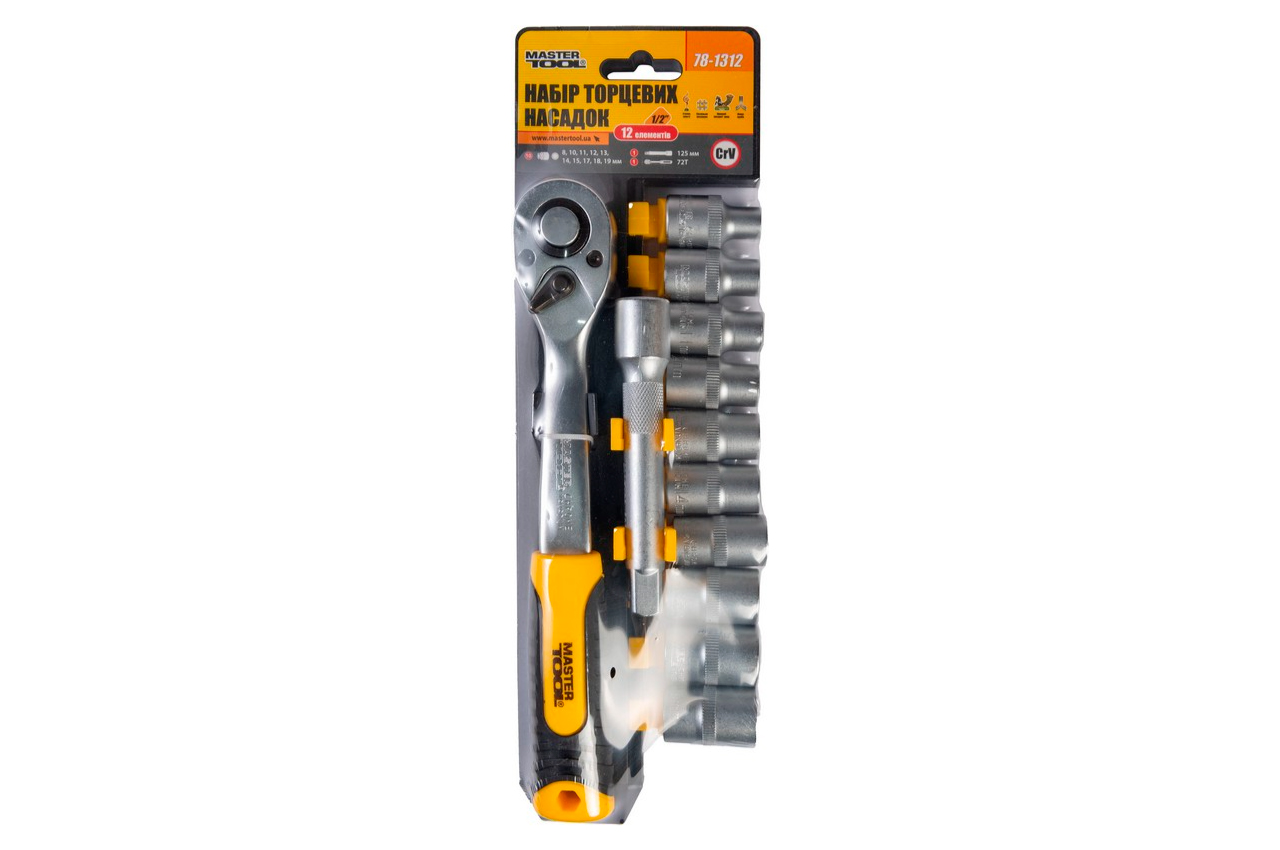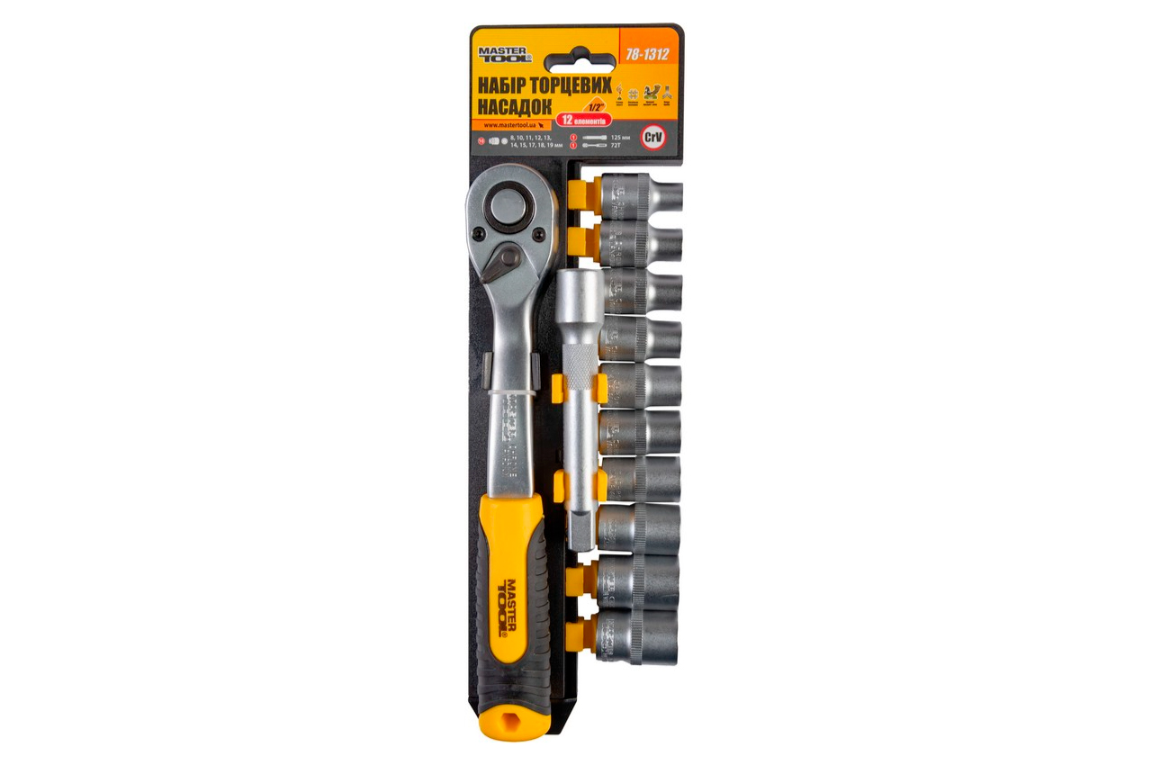 Закаленная хром-ванадиевая сталь трещотка 72Т. Головки торцевые шестигранные 1/2": 8, 10, 11, 12, 13, 14, 15, 17, 18, 19 мм удлинитель 1/2", 125 мм трещотка 1/2", 72 зуба