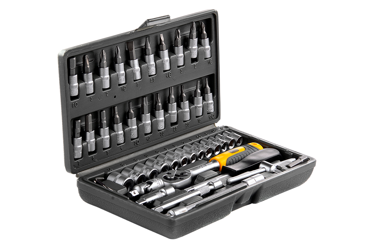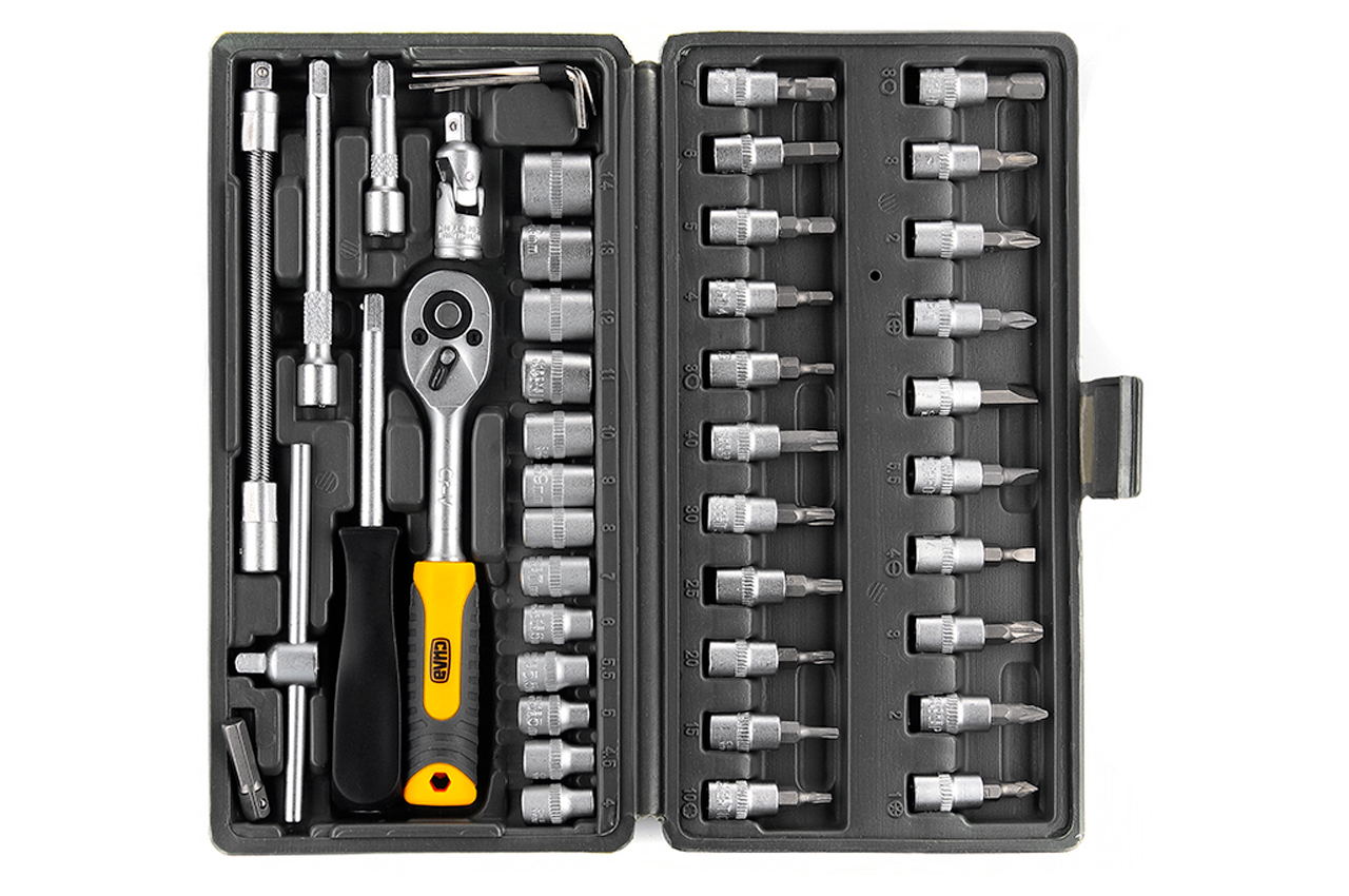 Насадки (13 шт.): 4, 4.5, 5, 5.5, 6, 7, 8, 9, 10, 11, 12, 13, 14 мм Рукоятка с храповым механизмом и реверсом (72 зубца) Удлинители (2 шт.): 50, 100 мм Удлинитель гибкий Шарнир карданный Вороток Т-образный Отвертка отверток Адаптер для бит 1/4"-1/4" Ключи шестигранные: 1.5, 2, 2.5 мм Бити с насадкой: SL: 4.0, 5.5, 7.0 PZ: 1, 2, 3 PH: 1, 2, 3 HEX: 3, 4, 5, 6, 7, 8 TORX: T10, T15, T20, T25, T30, T40