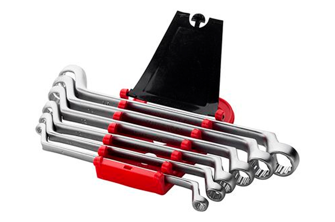 Набор из шести качественно выполненных накидных ключей. Размерная линейка: 6х7, 8х9, 10х11, 12х13, 14х15 и 16х17 мм. Ключи поставляются в удобном пластиковом держателе с отверстием для подвешивания. Хром-ванадиевая сталь. Количество ключей в наборе: 6 ед.; Размеры: 6-17 мм