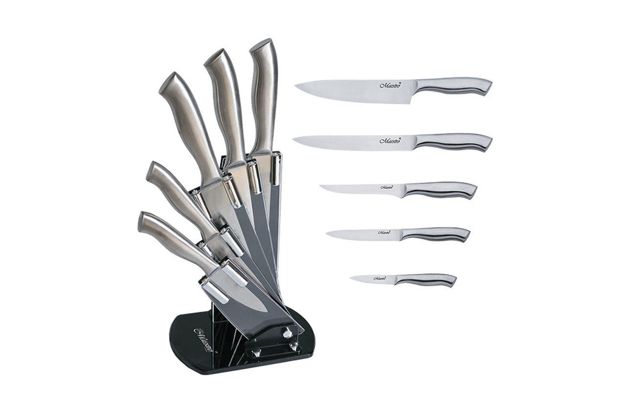 Набор ножей Maestro MR 1410 состоит из 6 предметов: 5 ножей и акриловой подставки. Отличительной особенностью данного набора является рукоятка ножа плавно переходящая в лезвие. Ножи изготовлены из высококачественной нержавеющей стали, прекрасно отбалансированы, приятно и удобно лежат в руке, а так же имеют острую профессиональную заточку лезвия.
