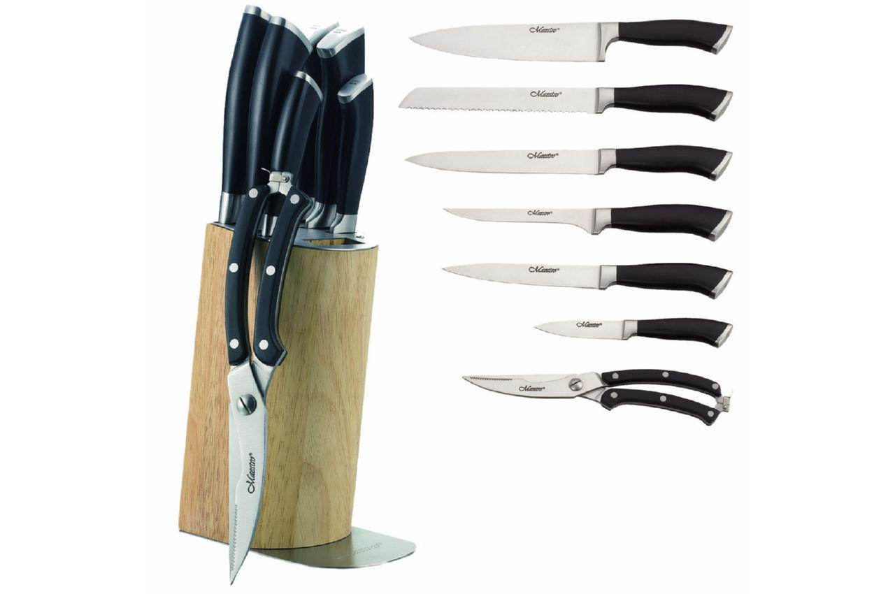 Набор Maestro MR 1422 состоит из 8 предметов: 6 ножей, кухонных ножниц и деревянной подставки. Ножи изготовлены из высококачественной нержавеющей стали. На лезвии с одной стороны нанесен логотип "Maestro", с другой надпись "EDELSTAHL ROST FREI INOX". В торцевой части ручки нанесена надпись с назначением конкретного ножа.