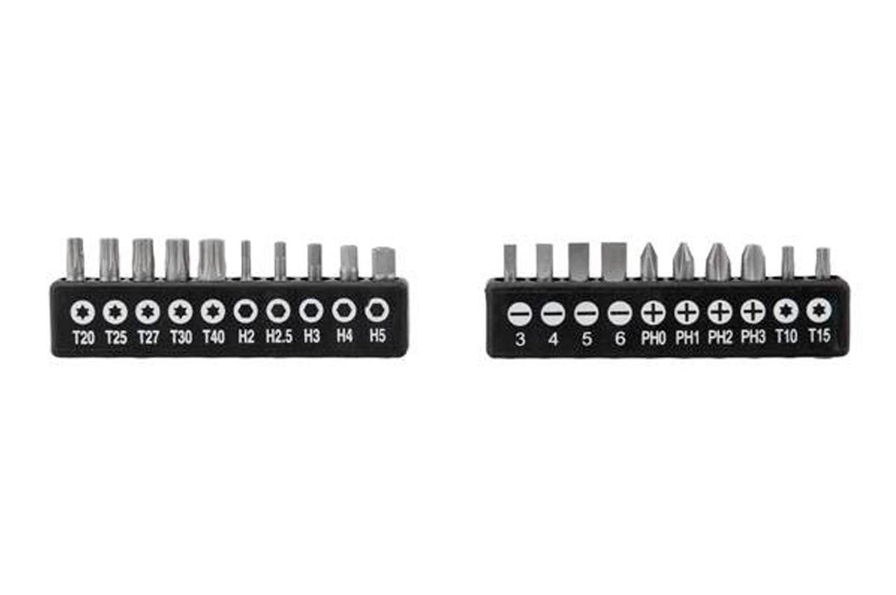 Набор отверток Intertool-PH x SL с битами 29 ед. Все насадки и отвертки изготовлены из крепкой Cr-V стали, которая известна всем мастерам своей надежностью и выносливостью. В состав этой стали входят хром и ванадий, которые придают ей высокую стойкость к износу. Также сталь отличается долговечностью и не подвержена хрупкому разрушению. Форма отверточных ручек обеспечивает максимальную эффективность от приложенного усилия. Прорезиненная двухкомпонентная рукоятка удобно лежит в руке и не ускользает из ладони. Комплектация Отвертки: SL6*100, SL5*100, PH2*150, PH1*100 Прецизионные отвертки: SL3*40, SL2*40, PH0*40, PH00*40 Отвертка под биты Биты: SL3, SL4, SL5, SL6, PH0, PH1, PH2, PH3, T10, T15, T20, T25, T27, T30, T40, H2, H2.5, H3, H4, H5.