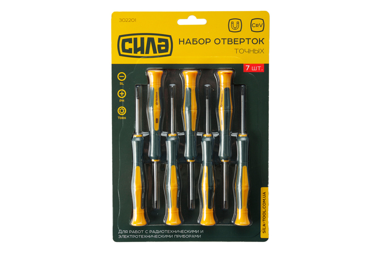 Набор отверток точных 7 шт CrV Сила для радиотехнических и электротехнических приборов.Изготовлены из хромо-ванадиевой стали, с магнитным наконечником. Материал рукоятки: пластик, термопластичная резина; Материал стержня: хром-ванадиевая сталь; Набор: SL2x50; SL2,5x50; PH0x50; PH00x50; T8x50;T9x50; T10x50; Тип отвертки: стандартная