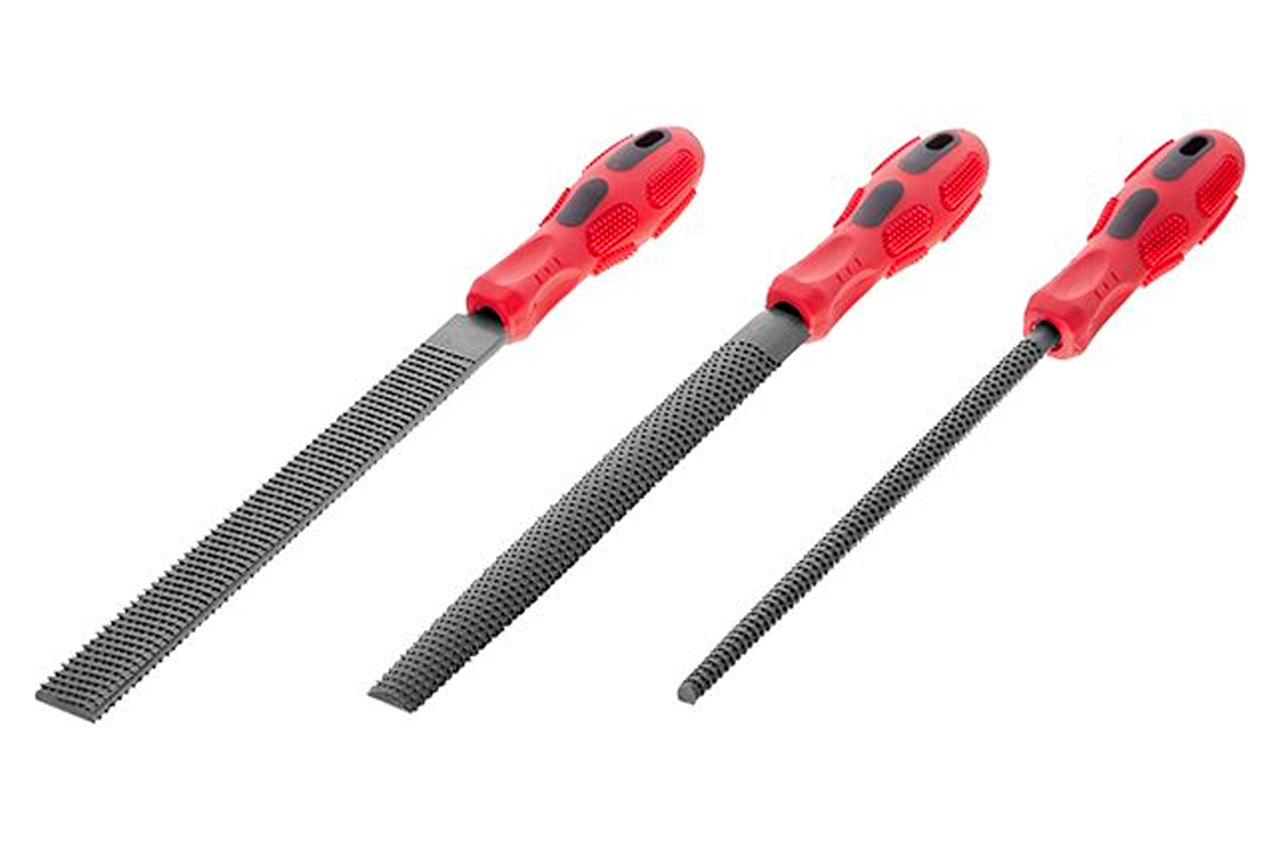 В набор входят рашпили с прямоугольным, треугольным и круглым профилем. Удобные пластиковые рукоятки, покрыты резиновыми накладками. Плотность насечки - 12 зуб/см². Предназначены для обработки древесины, фанеры, ДСП, пластмассы и других мягких материалов.