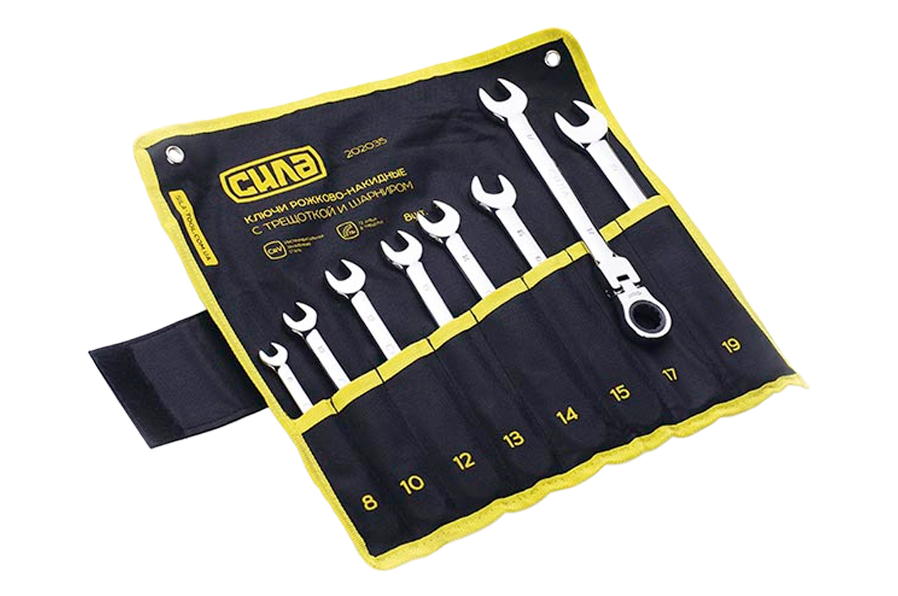 Набор рожково-накидных ключей Сила - 8 шт. (8-19 мм) шарнирных с трещоткой в чехле