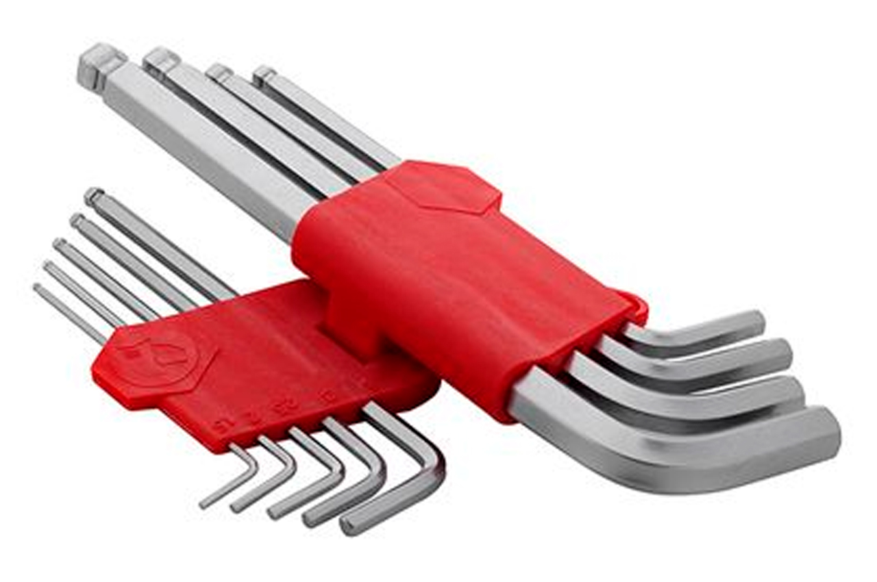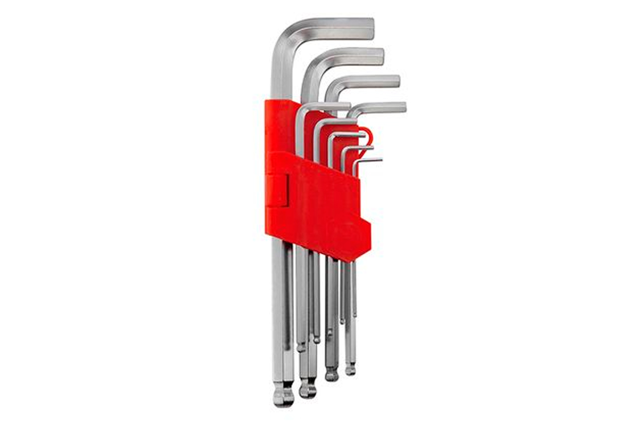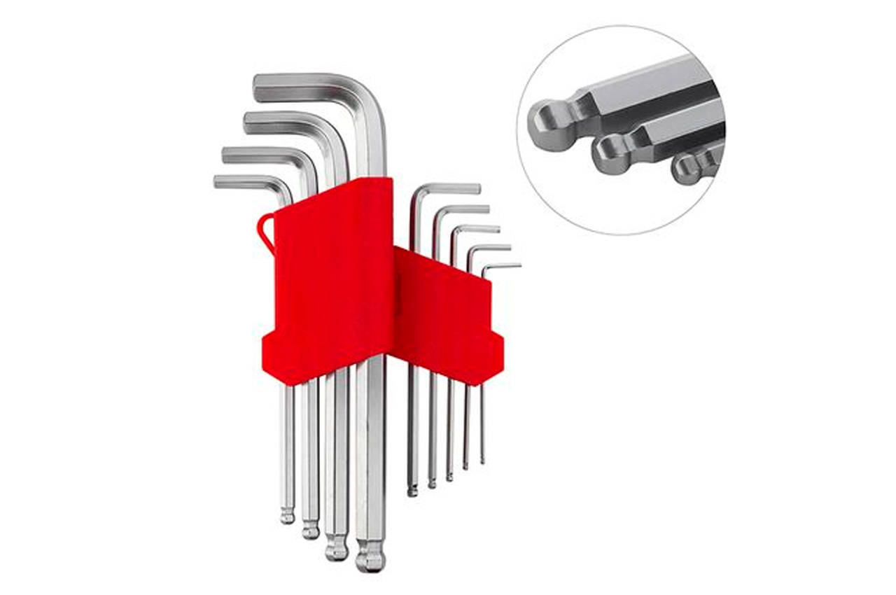 Шестигранники Г-образные шестигранные с шарообразным наконечником (9 шт.) на 1.5, 2, 2.5, 3, 3.5, 4, 5, 6 и 8 мм. Изготовлены из хром-ванадиевой стали. Удлиненные. С удобным пластиковым держателем. Типы ключей: Г-образные шестигранные с шарообразным наконечником; Количество ключей: 9 ед.; Размеры ключей: 1,5-10 мм; Твердость по шкале Роквелла: 52-55 HRC