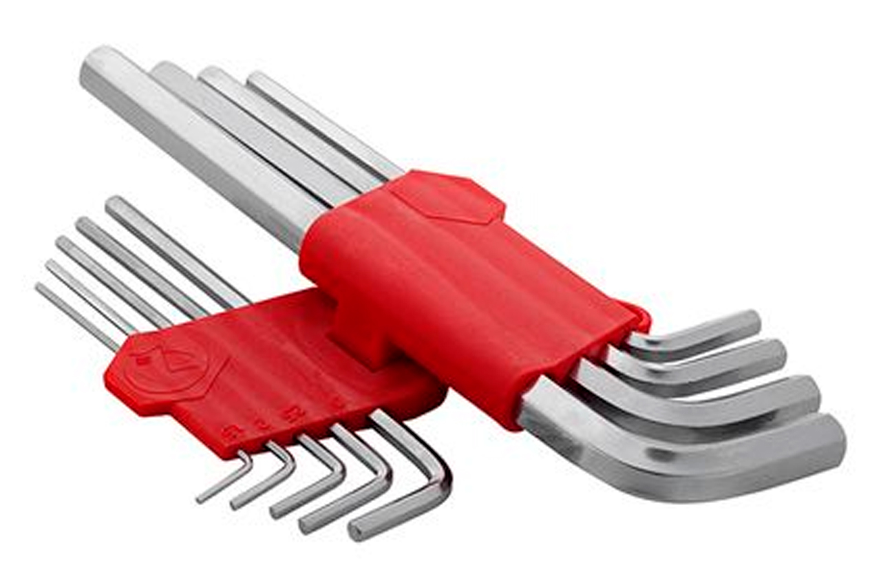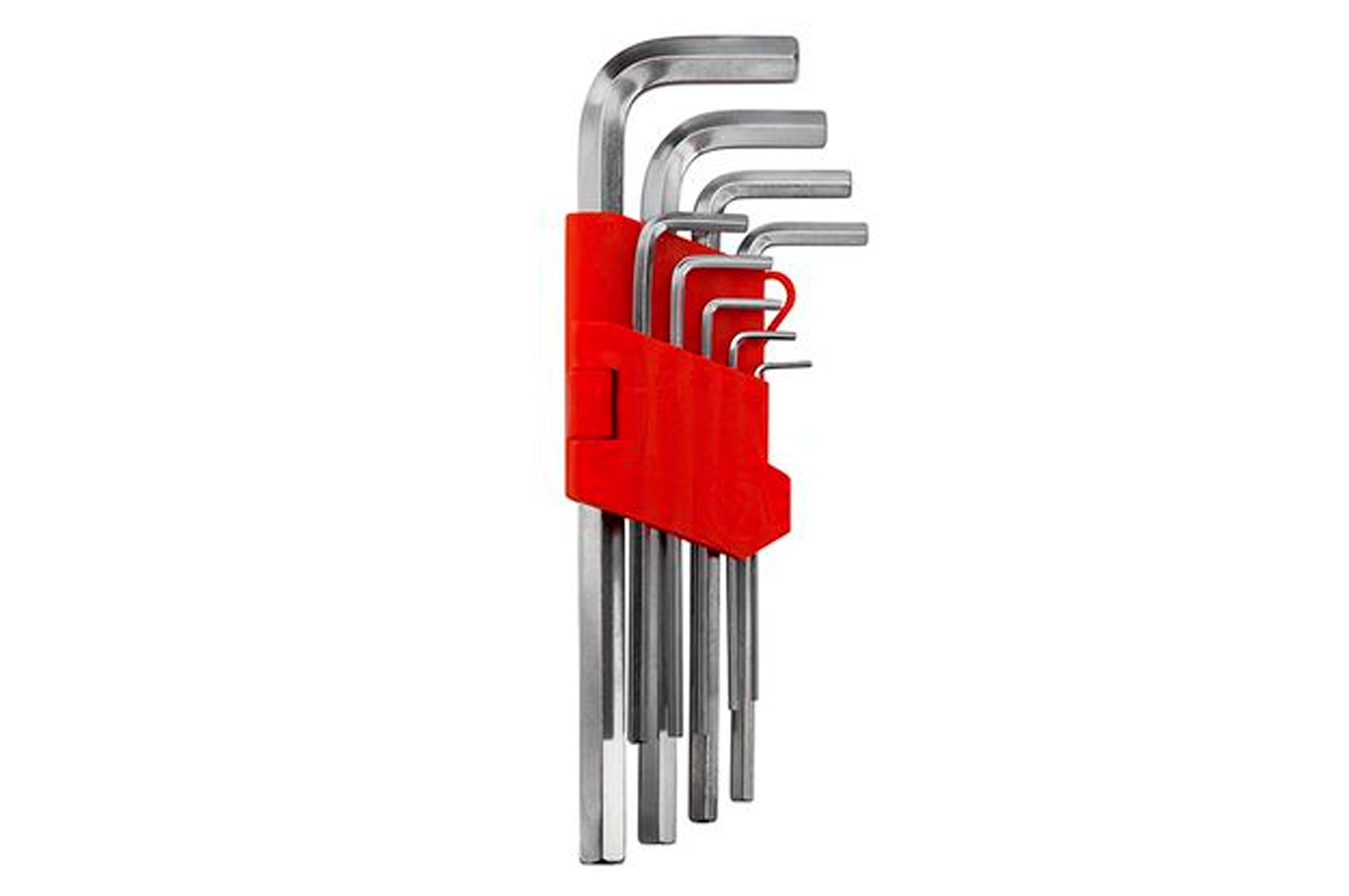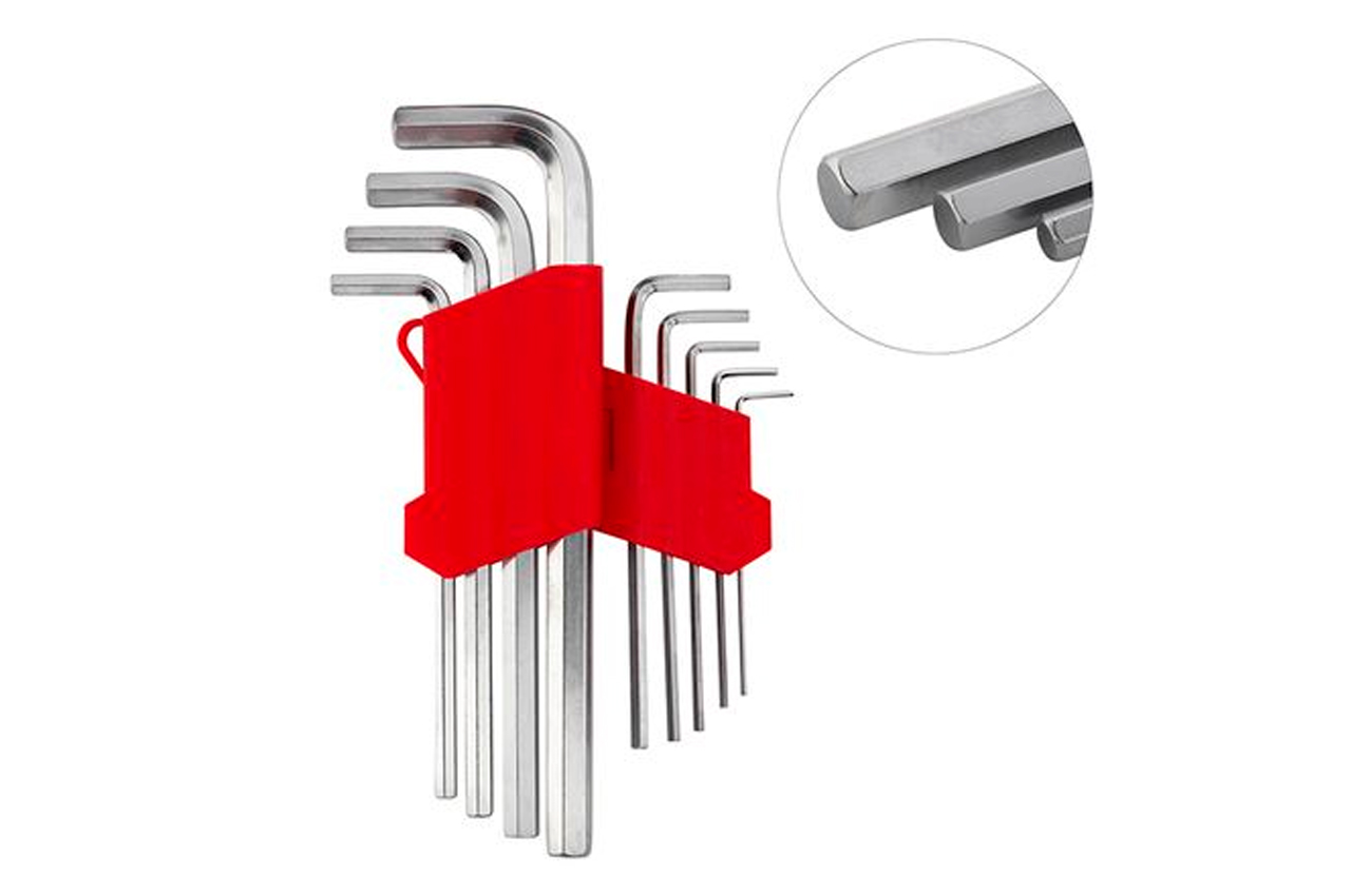 Типы ключей: Г-образные шестигранные удлиненные; Количество ключей: 9 ед.; Размеры ключей: 1.5-10 мм; Твердость по шкале Роквелла: 52-55 HRC