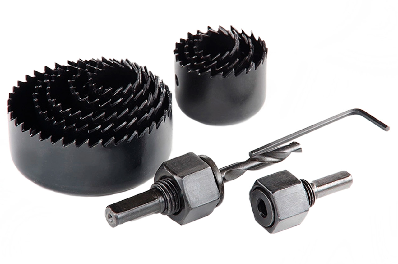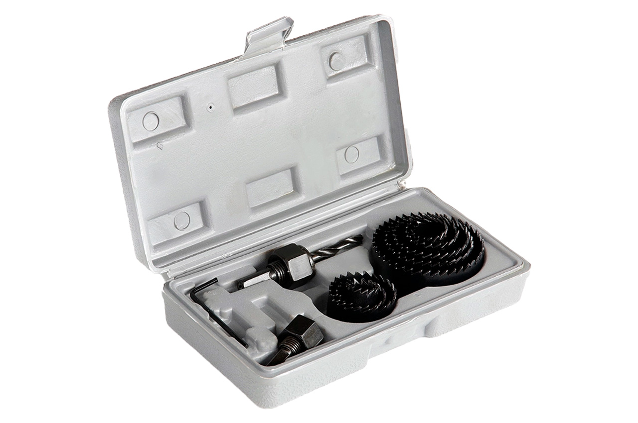 Набор корончатых сверл (фрез), предназначенный для сверления сквозных отверстий диаметром от 19 до 64 мм, в древесине и ее производных, а также в пластике и гипсокартоне. С помощью этого набора Вы легко просверлите отверстия нужного диаметра: под розетки, дверные замки или проходы для коммуникации.