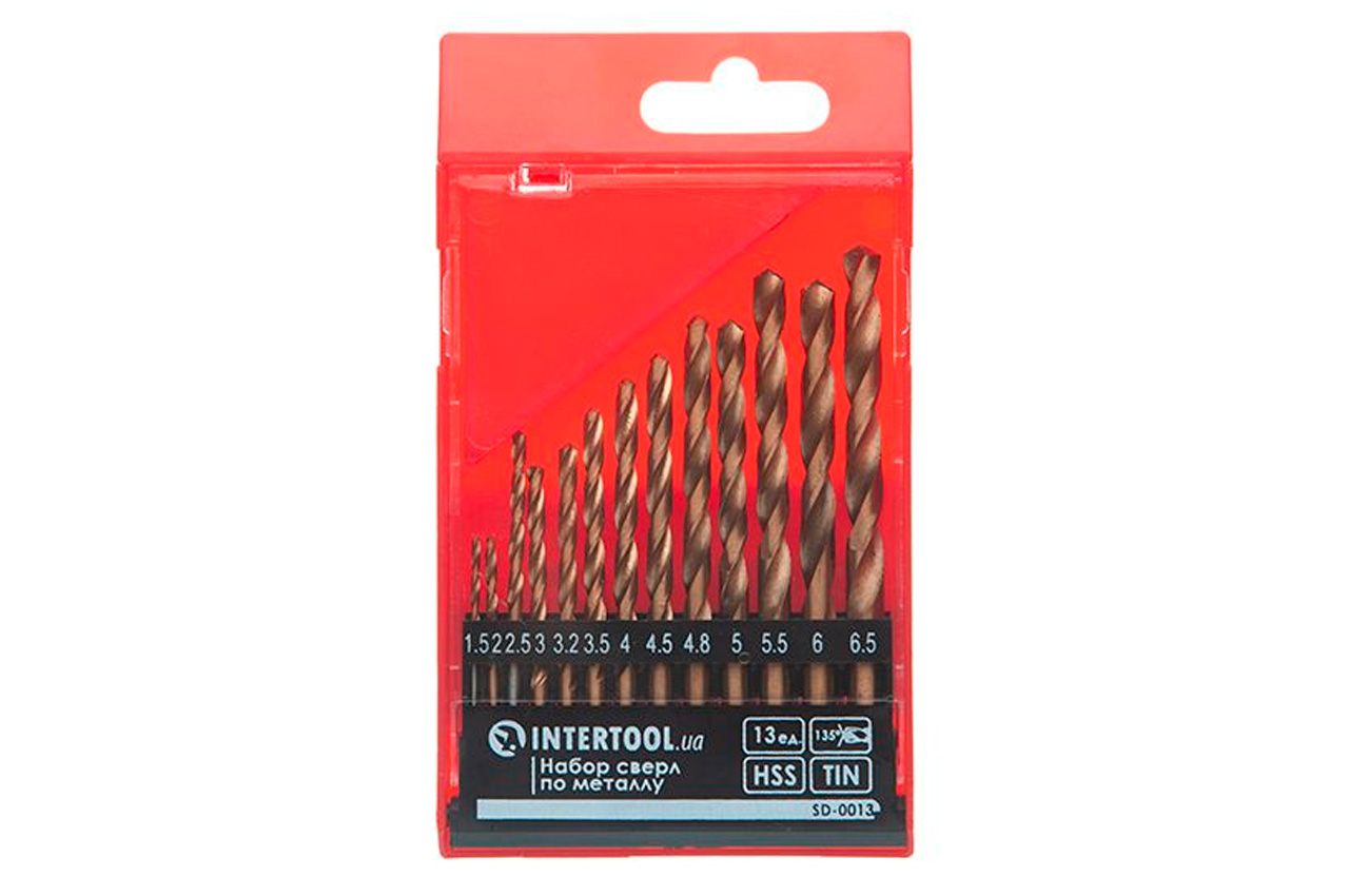 Набор сверл по металлу "Intertool" - 13 шт. (1.5, 2.0, 2.5, 3.0, 3.2, 3.5, 4.0, 4.5, 4.8, 5.0, 5.5, 6.0, 6.5 мм). Материал - сталь HSS 4241. Количество в упаковке: 13 ед.; Тип стали: HSS; Диаметр сверла: 1,5-6,5 мм; Спиральная заточка: 20-30 °С; Угол заточки: 118 °С