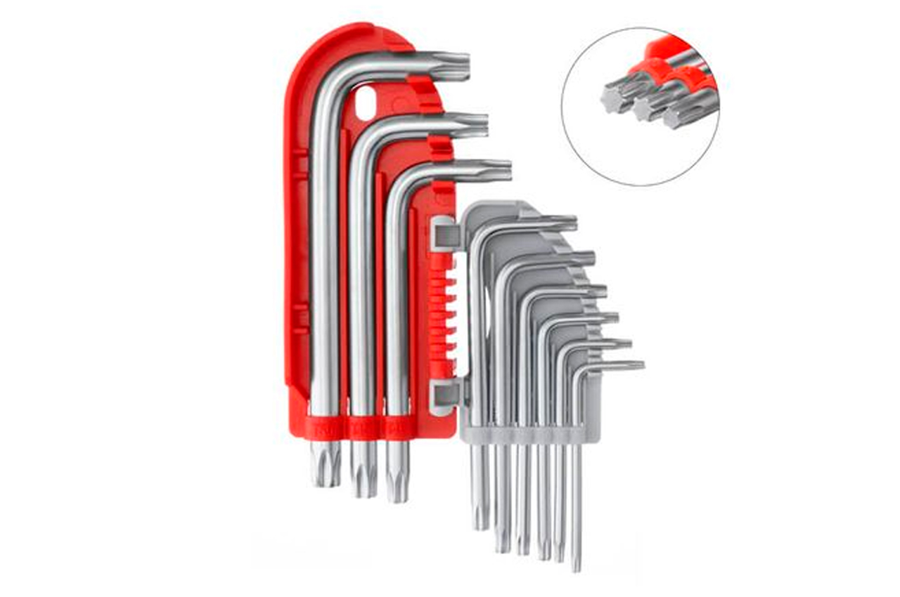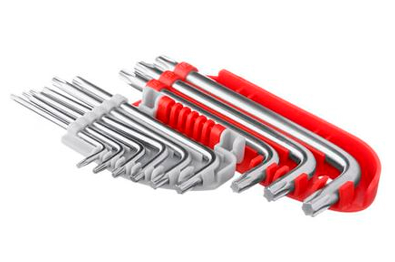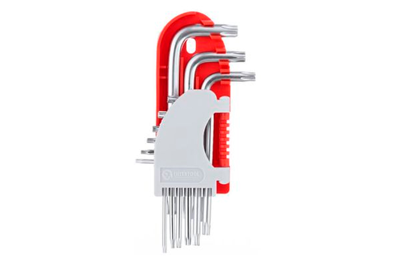 Ключи Torx применяются для выполнения монтажных и демонтажных работ с винтами и болтами с внутренней шестилучевой звездой (TORX), размером от Т10 до Т50. Положите в бардачок этот набор из 9 ключей, и он обязательно принесёт Вам пользу. Изготовлены из стали S2, имеют литую форму и никелированное покрытие - все это обеспечивает высокие износостойкие показатели в процессе эксплуатации. Ключи помещены в специальный держатель, который обеспечивает удобство хранения. Особенности Легко справляются со своей задачей. Не деформируются т.к. изготовлены из высококачественной инструментальной стали S2. Быстрый выбор необходимого ключа, благодаря открытому футляру для хранения с маркировкой. Дополнительная износостойкость и твёрдость ключей благодаря никелированному покрытию. Точная посадка в крепеже обеспечивается многоступенчатой технологией обработки рабочих граней. Укороченная ножка ключей делает это набор очень компактным. Типы ключей: Г-образные TORX; Количество ключей: 9 ед.; Размеры ключей: T10, T15, T20, T25, T27, T30, T40, T45, T50; Твердость по шкале Роквелла: 58-62 HRC