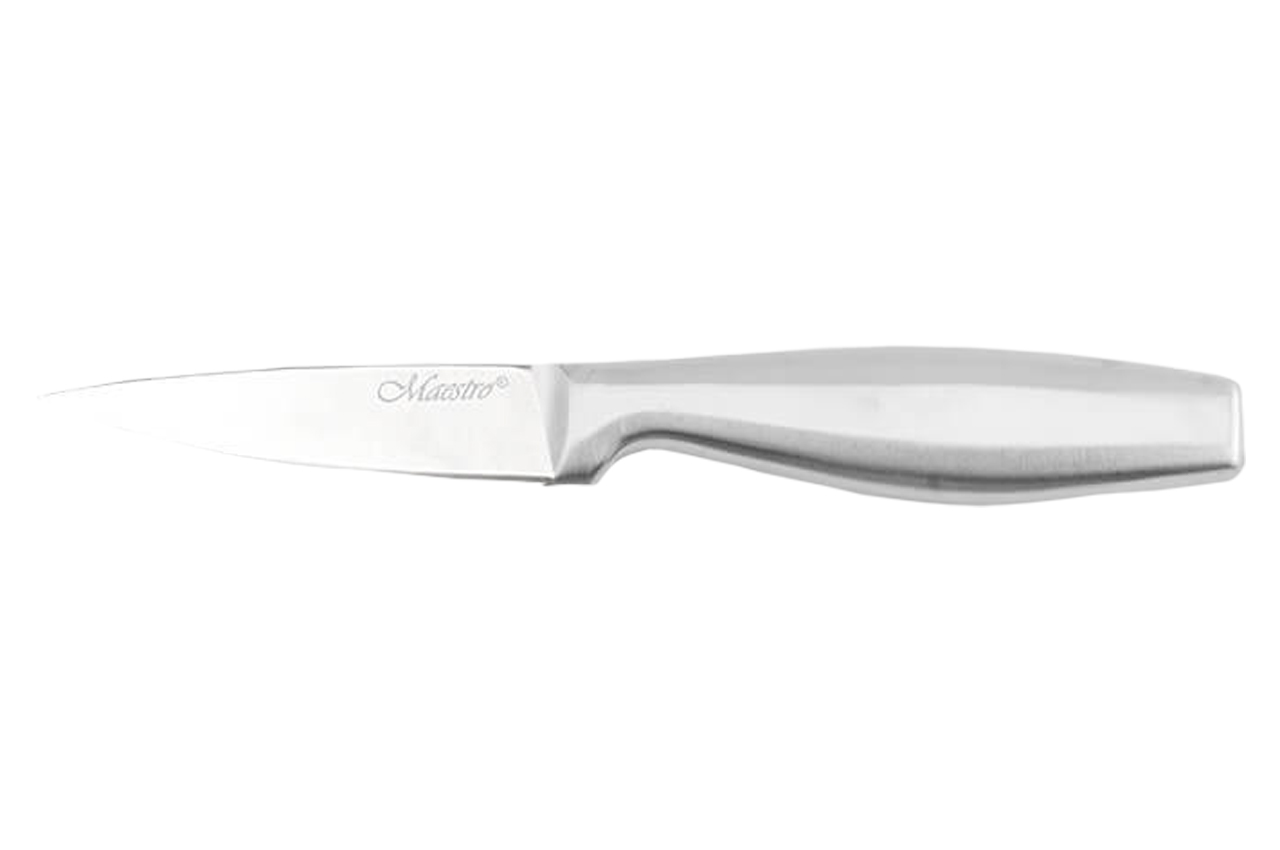 Нож для чистки овощей Maestro из нержавеющей стали высокого качества. В составе нержавеющей стали, из которой изготовлен кухонный нож, содержится высокий процент углерода, что облегчает заточку лезвий. Таким образом, нож дольше сохраняется острым. Оптимальная ширина лезвия для наилучшего качества среза.