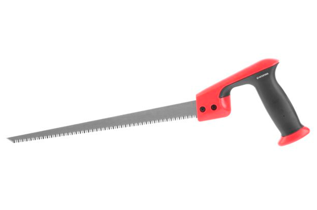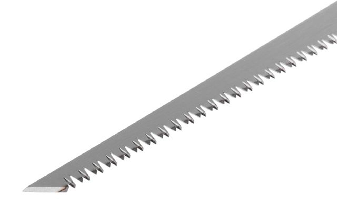 Ножовка изготовлена из высококачественной стали 55 HRC, с рукояткой из прочного пластика с резиновыми накладками. Длина полотна - 300 мм. Каленые зубья (8 зубов на 1 дюйм) не требуют заточки и обеспечивают быстрое пиление. Пластиковый защитный кожух предохраняет зубья и оградит пользователя от травм. Предназначена для фигурного распила в фанере, деревоплите, древесно-стружечной плите и других тонких пиломатериалах.